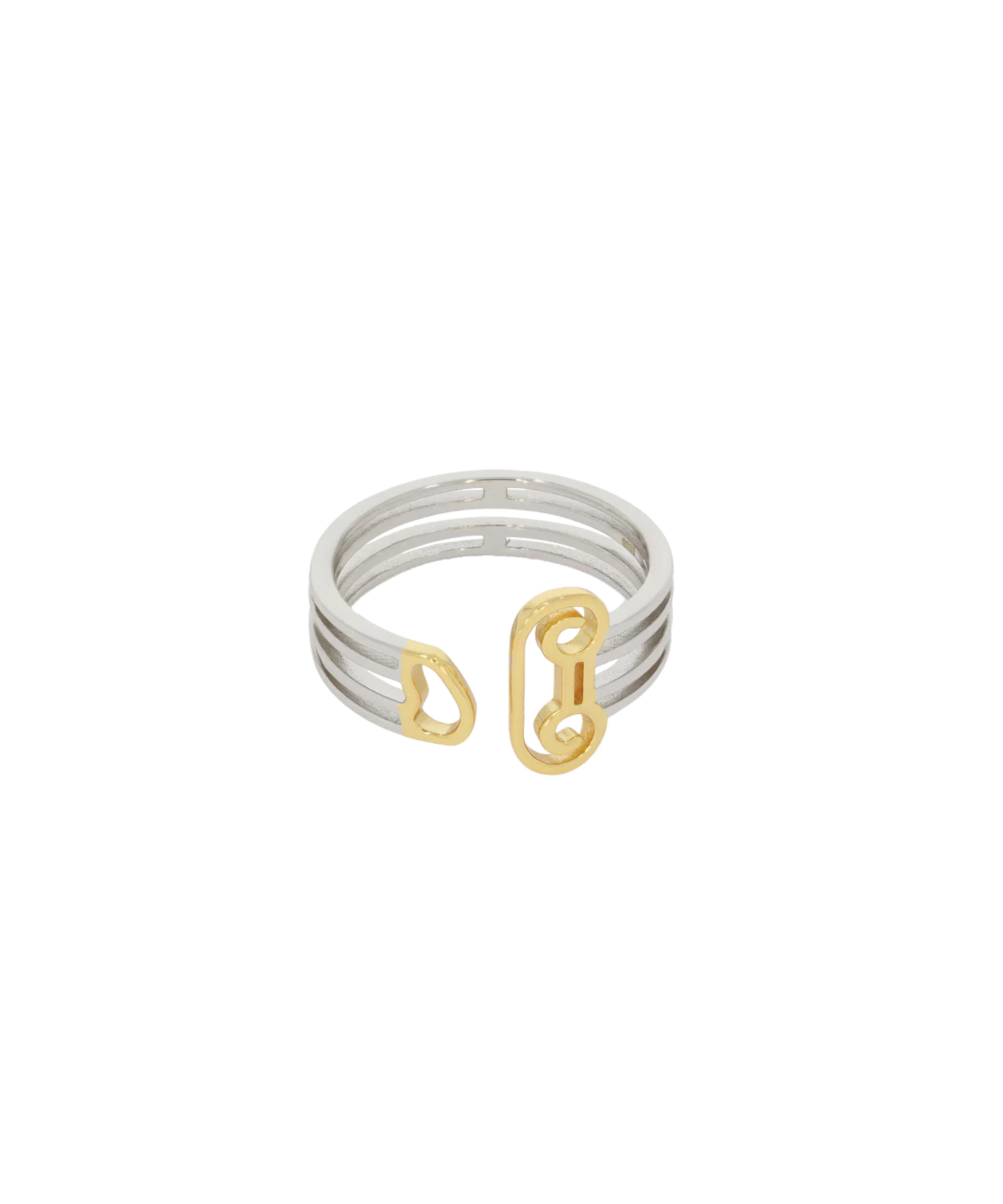 真鍮をベースにゴールドとシルバーのメッキを施した鋳造仕上げで、コラム(柱)モチーフが指に巻き付くような独特のフォルムを描きます。