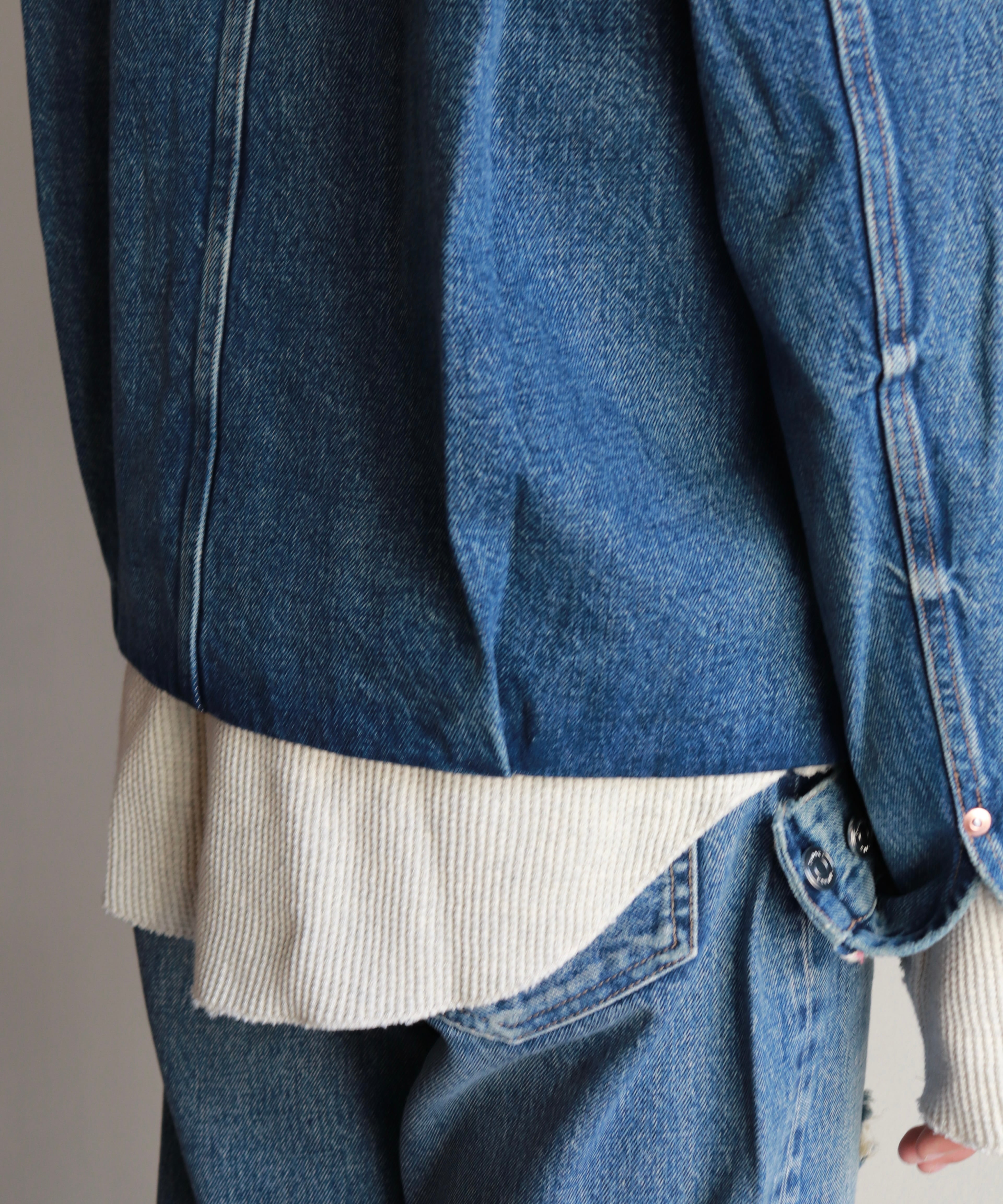 日本製プレミアムセルビッジデニムを使用し丁寧に織られたセルビッジデニムは、横糸に落ち綿を使用しているため着込む程に肌に馴染み柔らかく変化していきます。