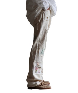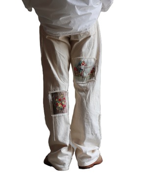 アートが描かれたリネン生地をホワイトデニムにパッチワークしたパンツになります。