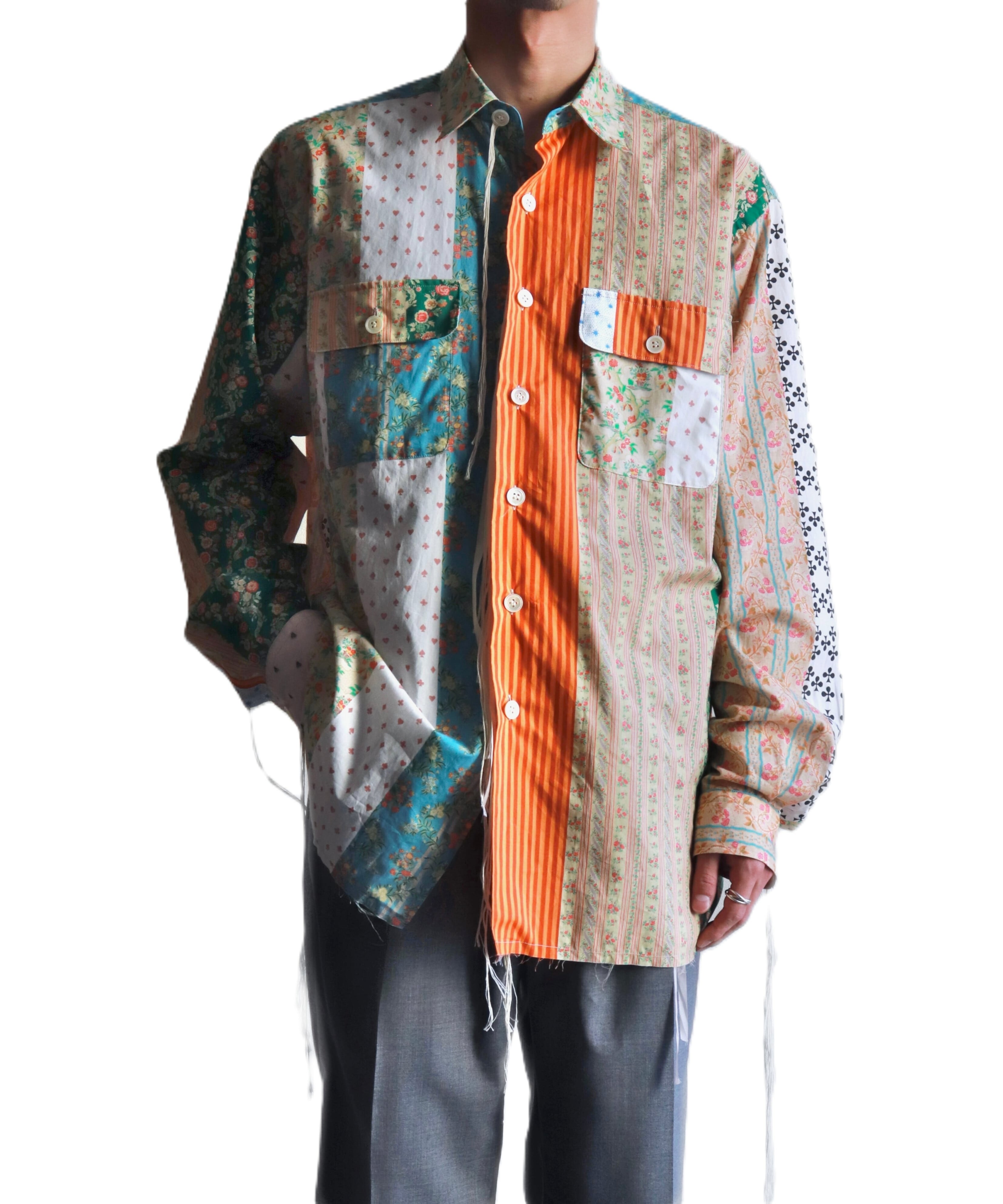 Midorikawaオリジナルのファブリックで、今季は様々な小花柄等が組み合わされたパッチワークのような温かみのあるテキスタイル。随所にMidorikawaらしいディティールが詰め込まれたシャツです。