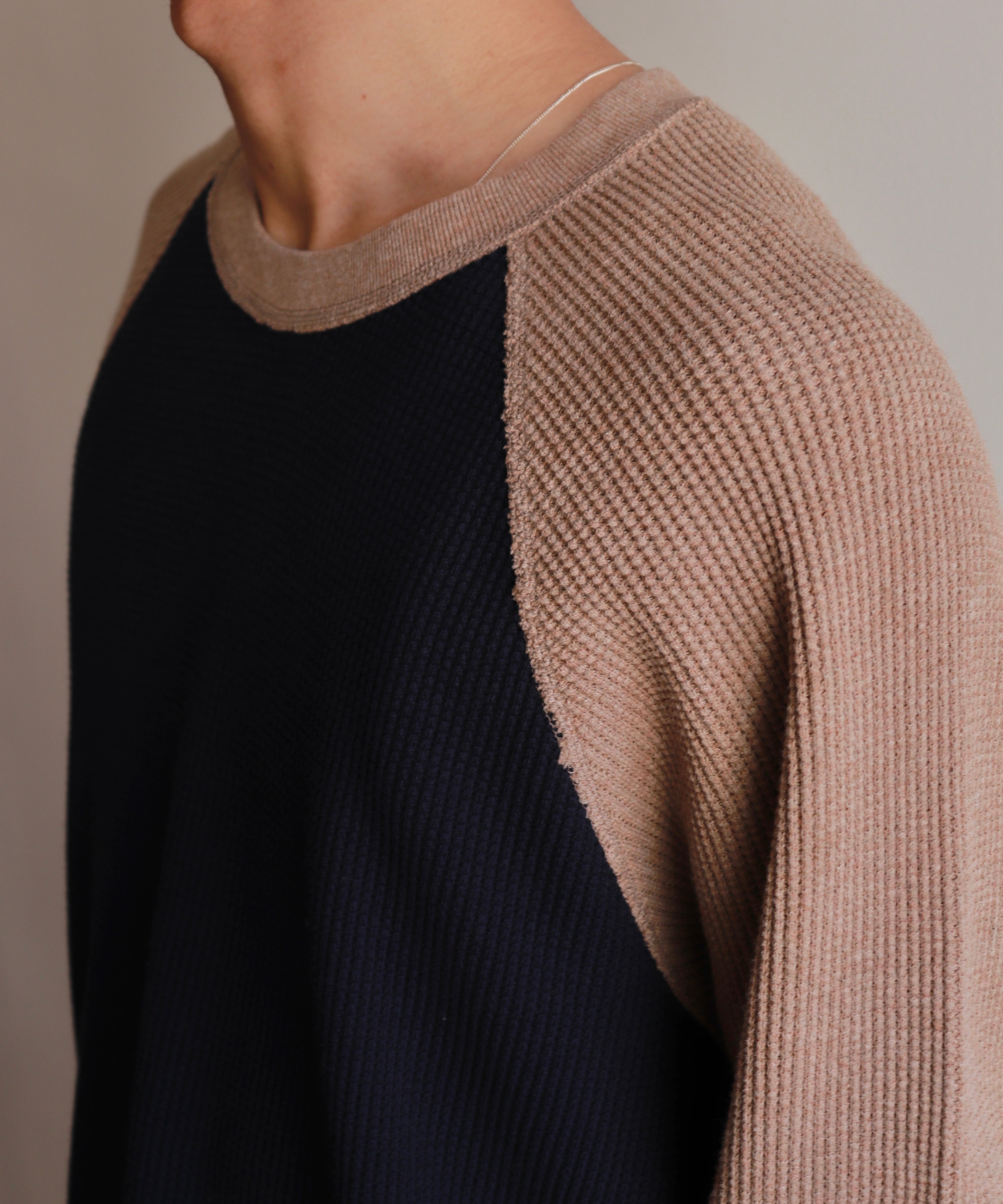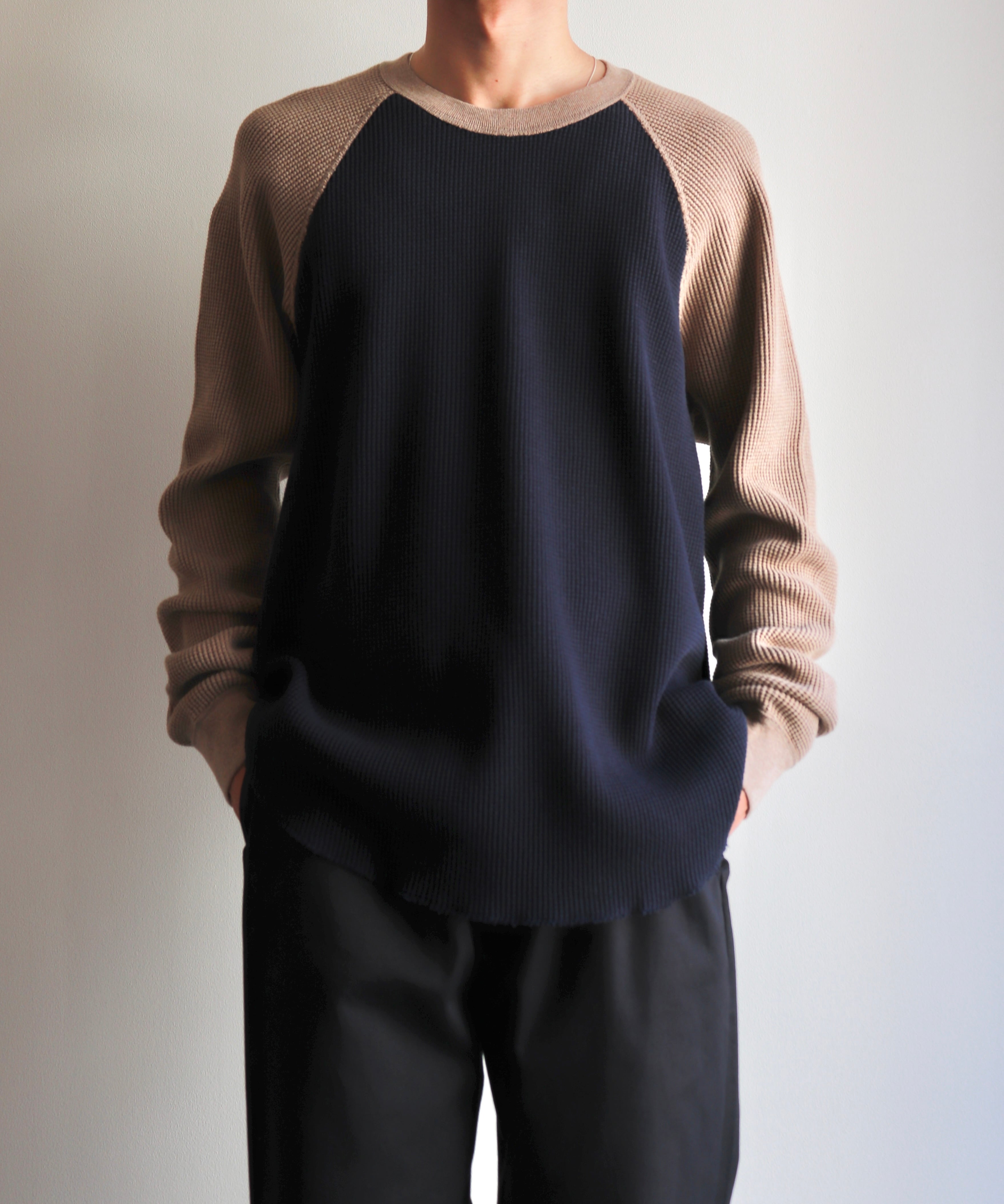 UNUSED 25AW LONG SLEEVE WAFFLE T-SHIRT (NAVY×BEIGE)