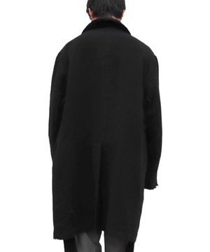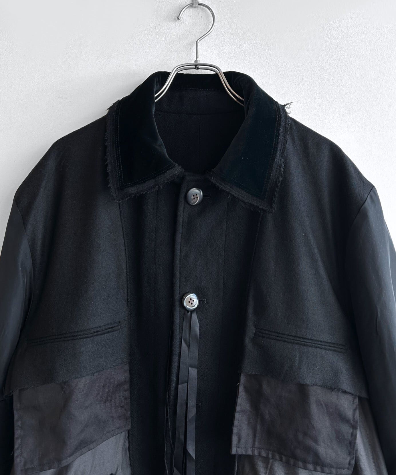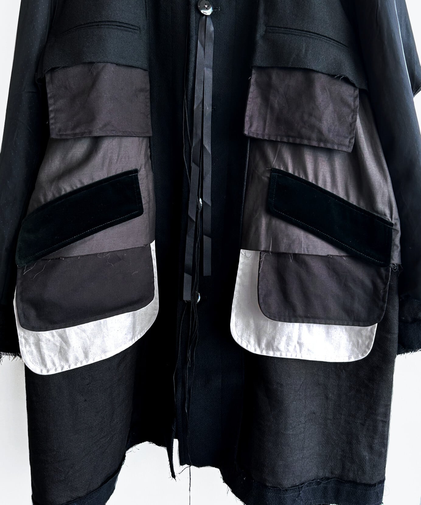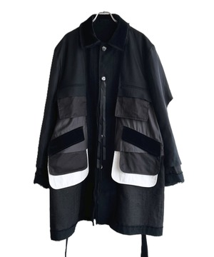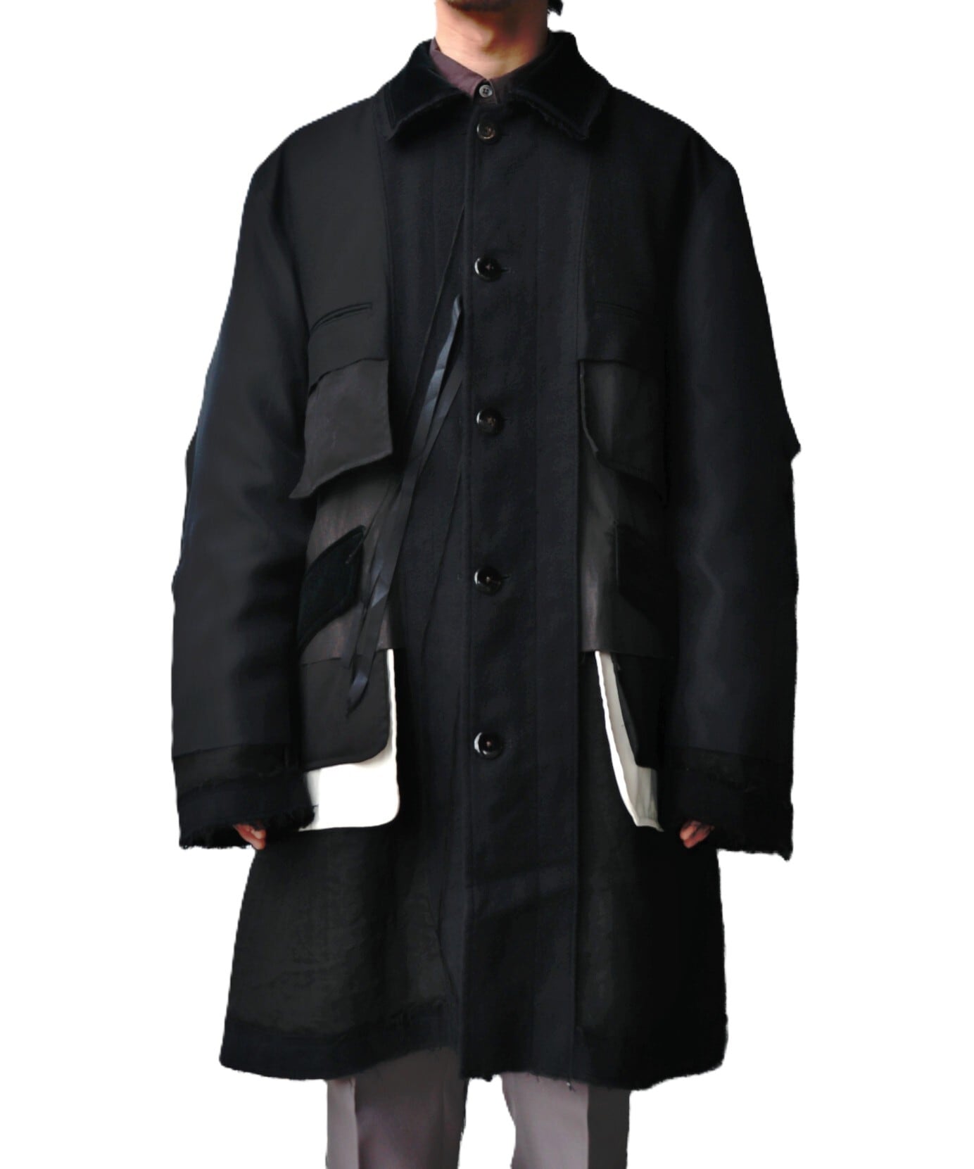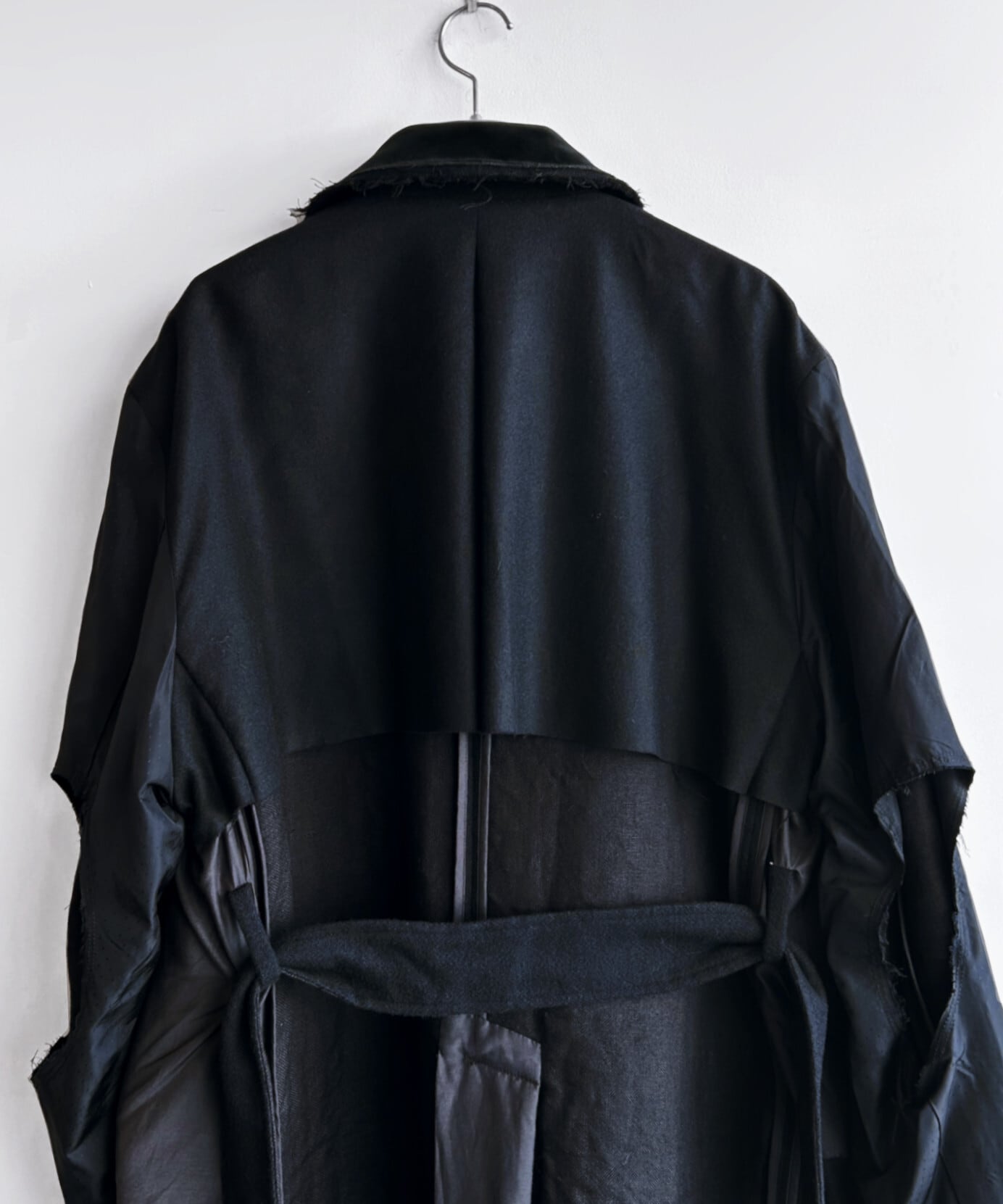 リバーシブルデザインで、表面は通常のコートでは裏側にあたる部分をあえて見せ、さらにカッティングやベルベット素材を重ねています。
