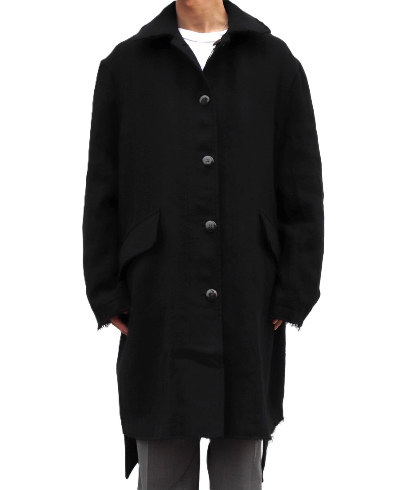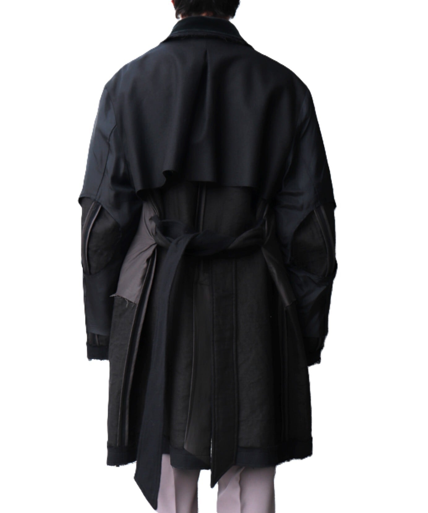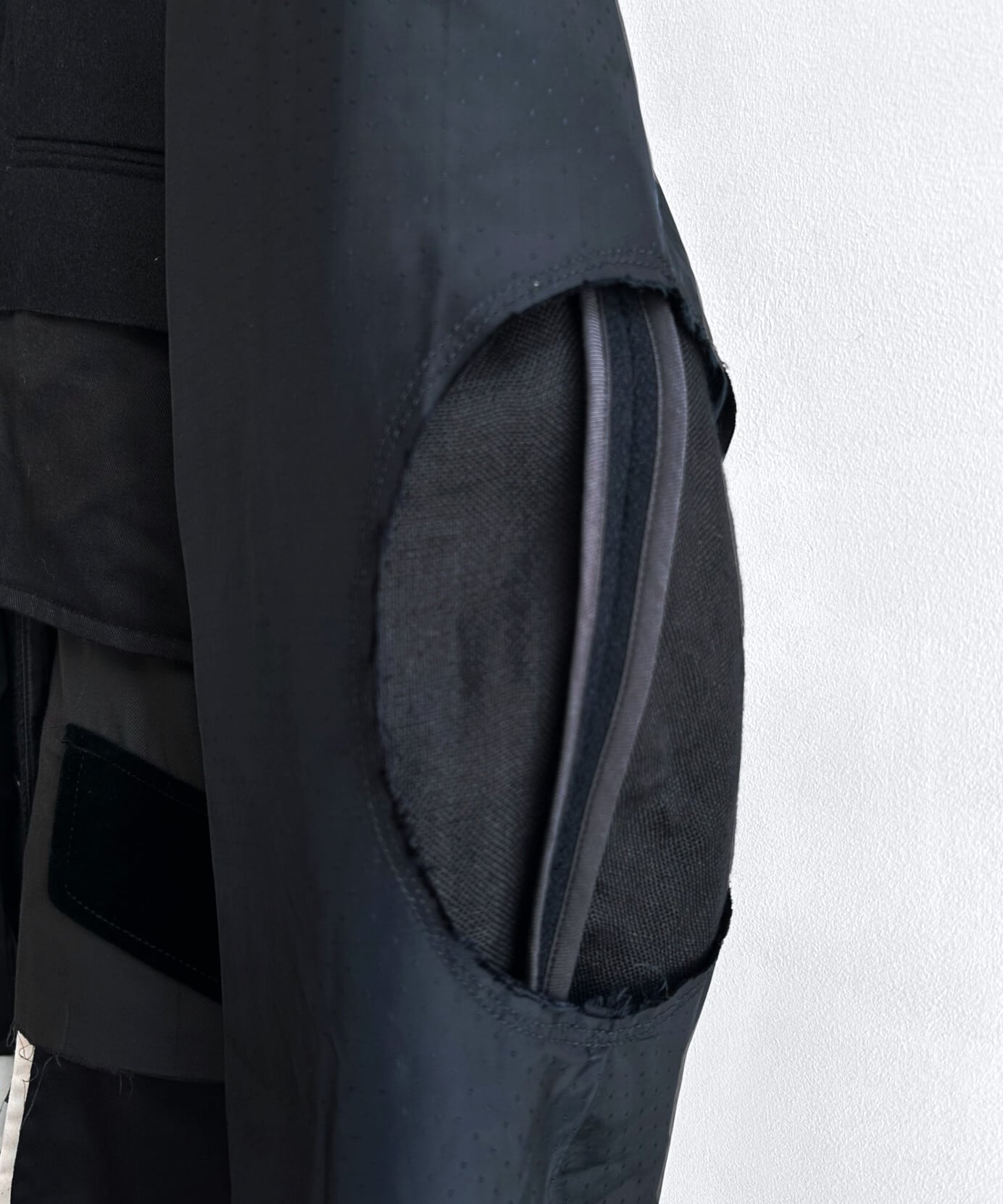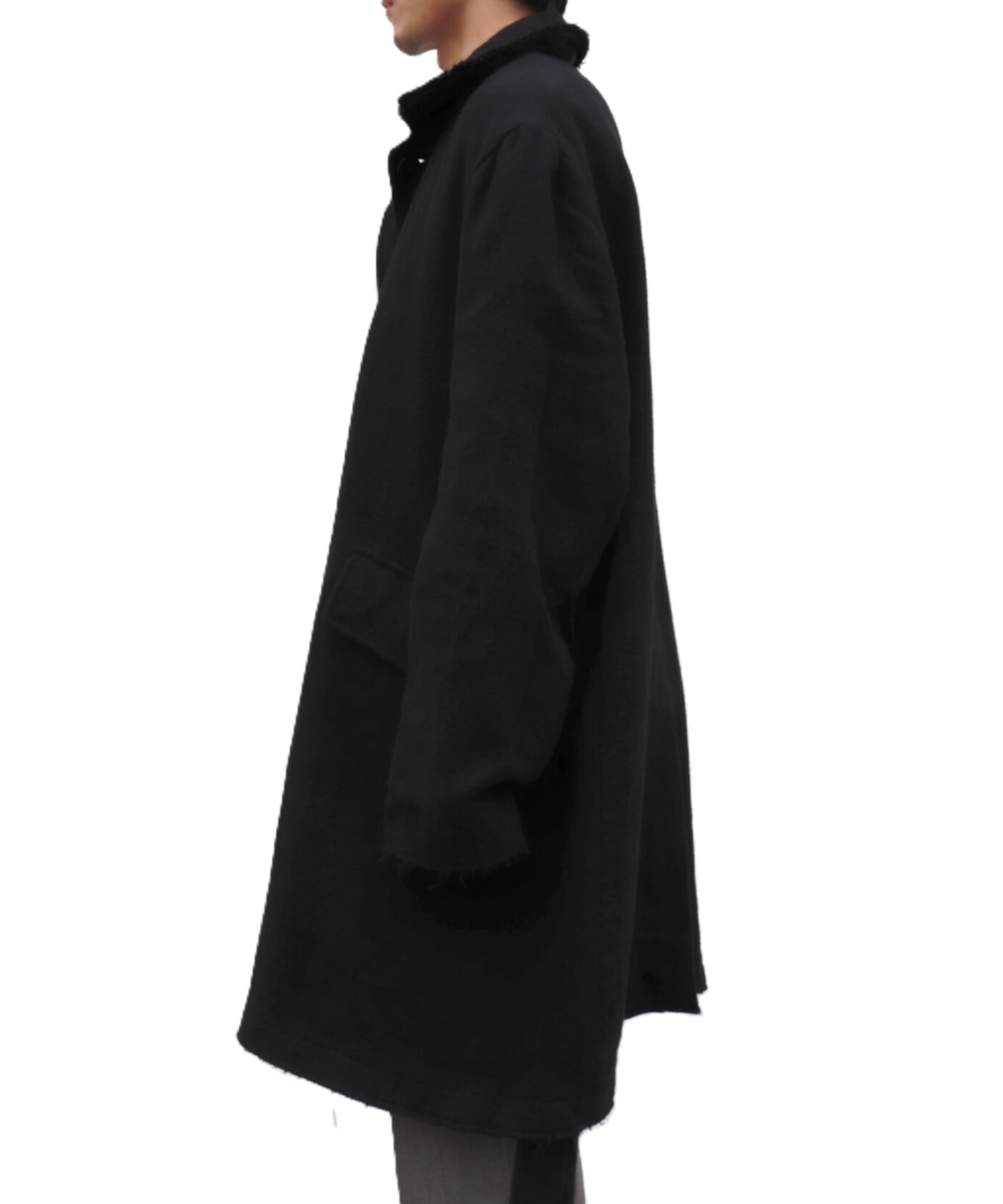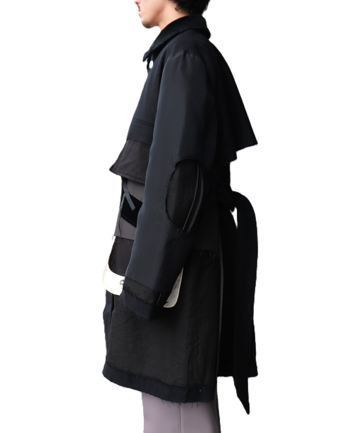 リバーシブルデザインで、表面は通常のコートでは裏側にあたる部分をあえて見せ、さらにカッティングやベルベット素材を重ねています。