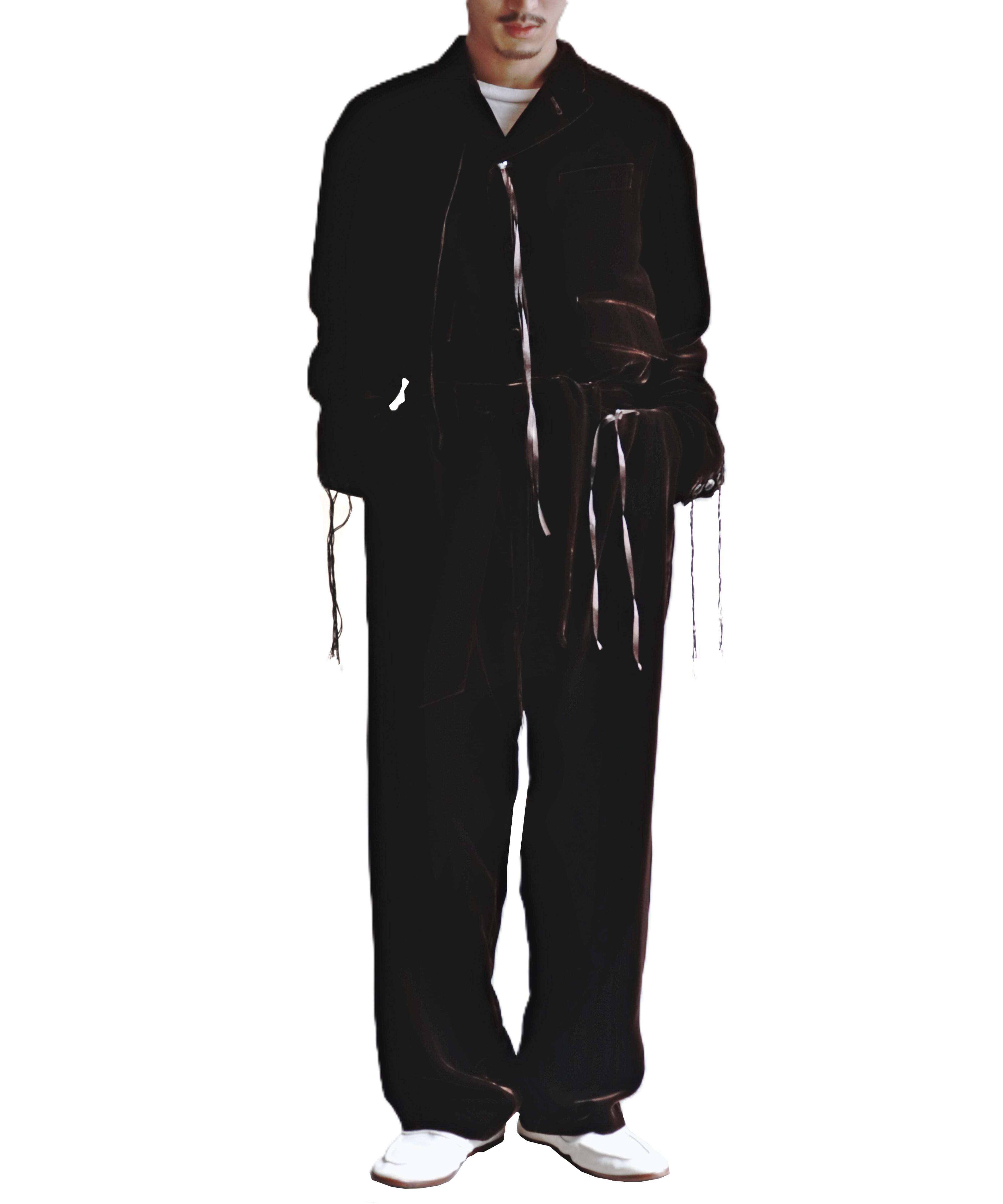 緑川氏のアーティザナルな思考を反映したウェアには、リボンテープや、袖や裾からはみ出る生地といったデコラティブなディテールが施されている。