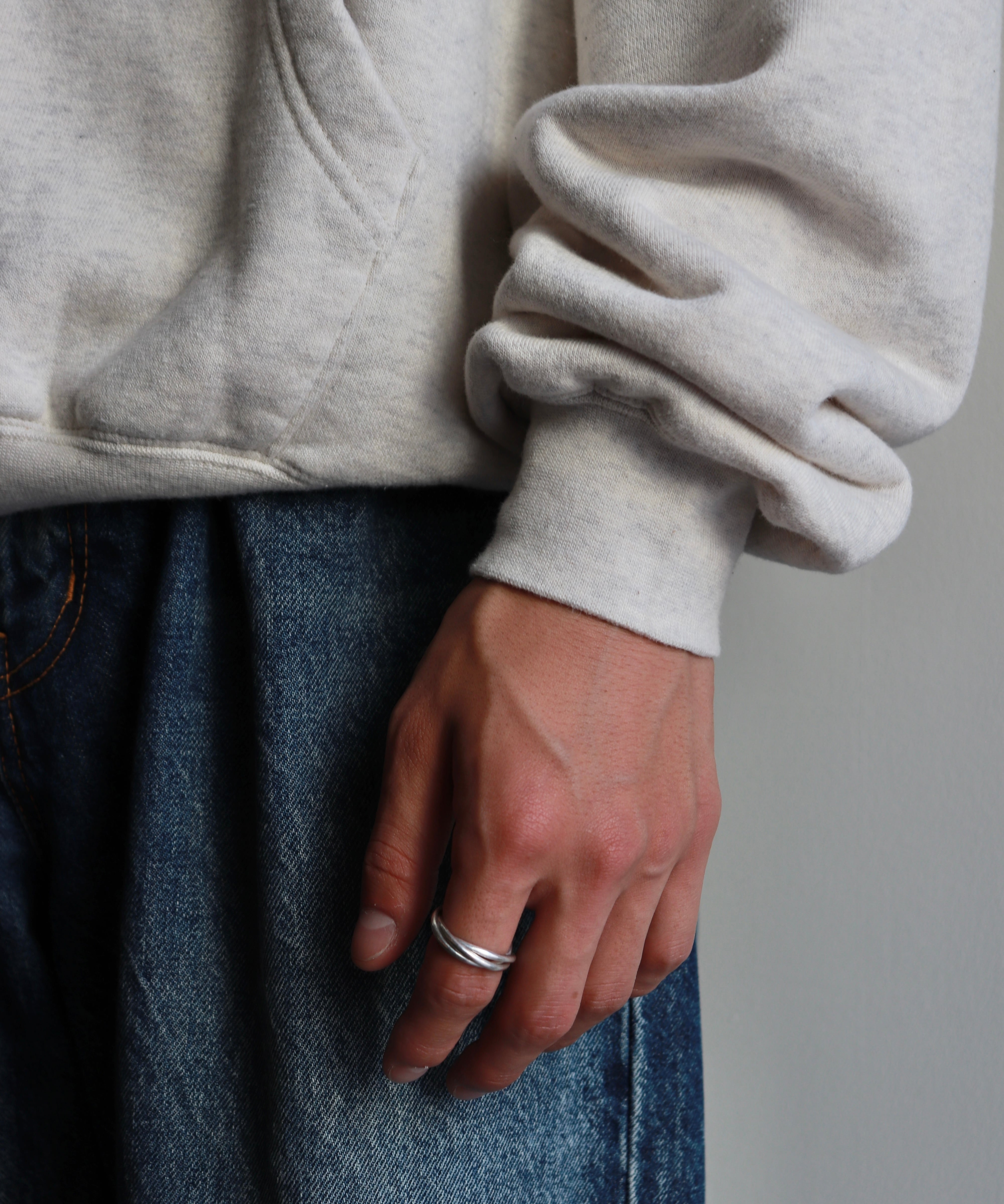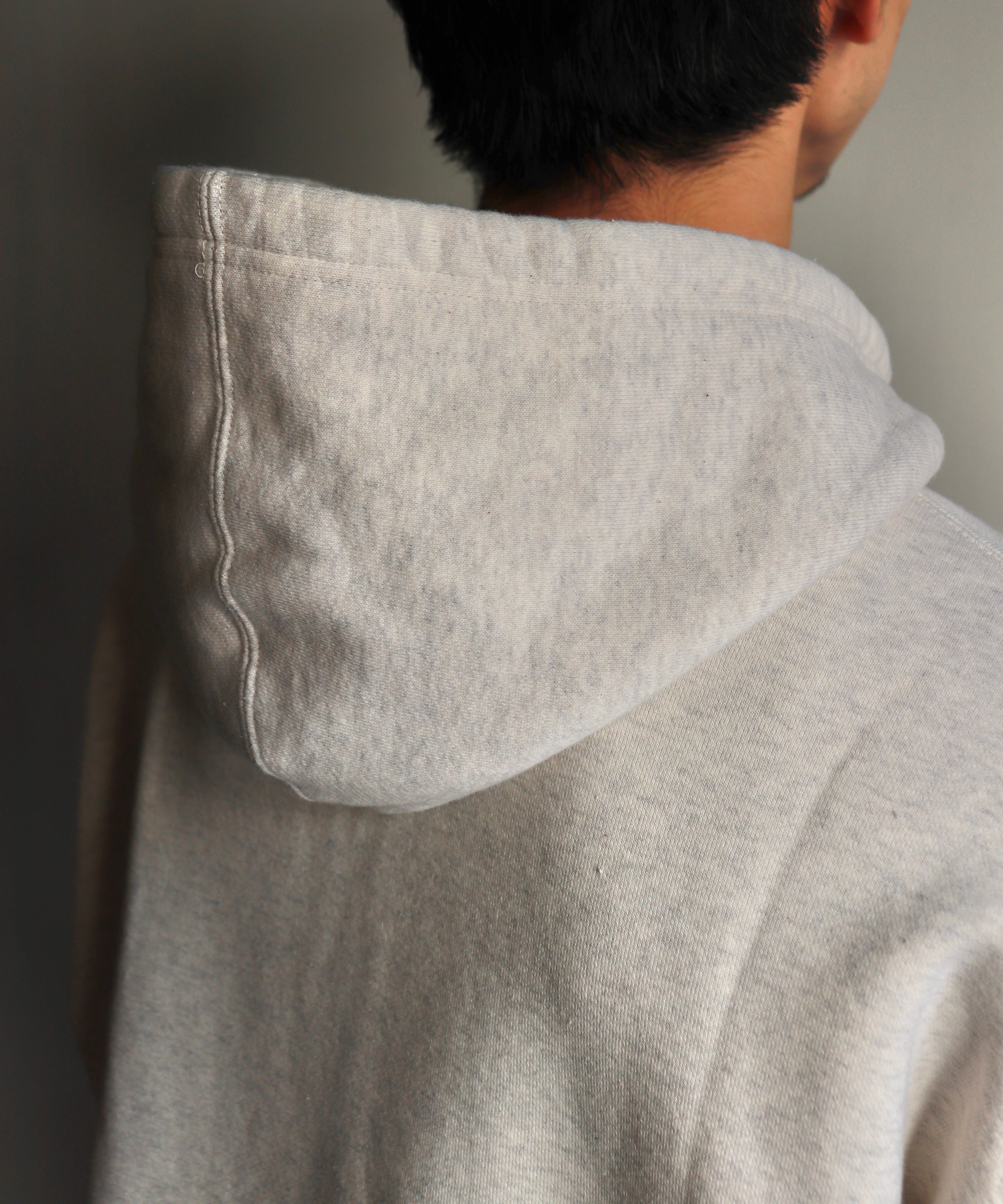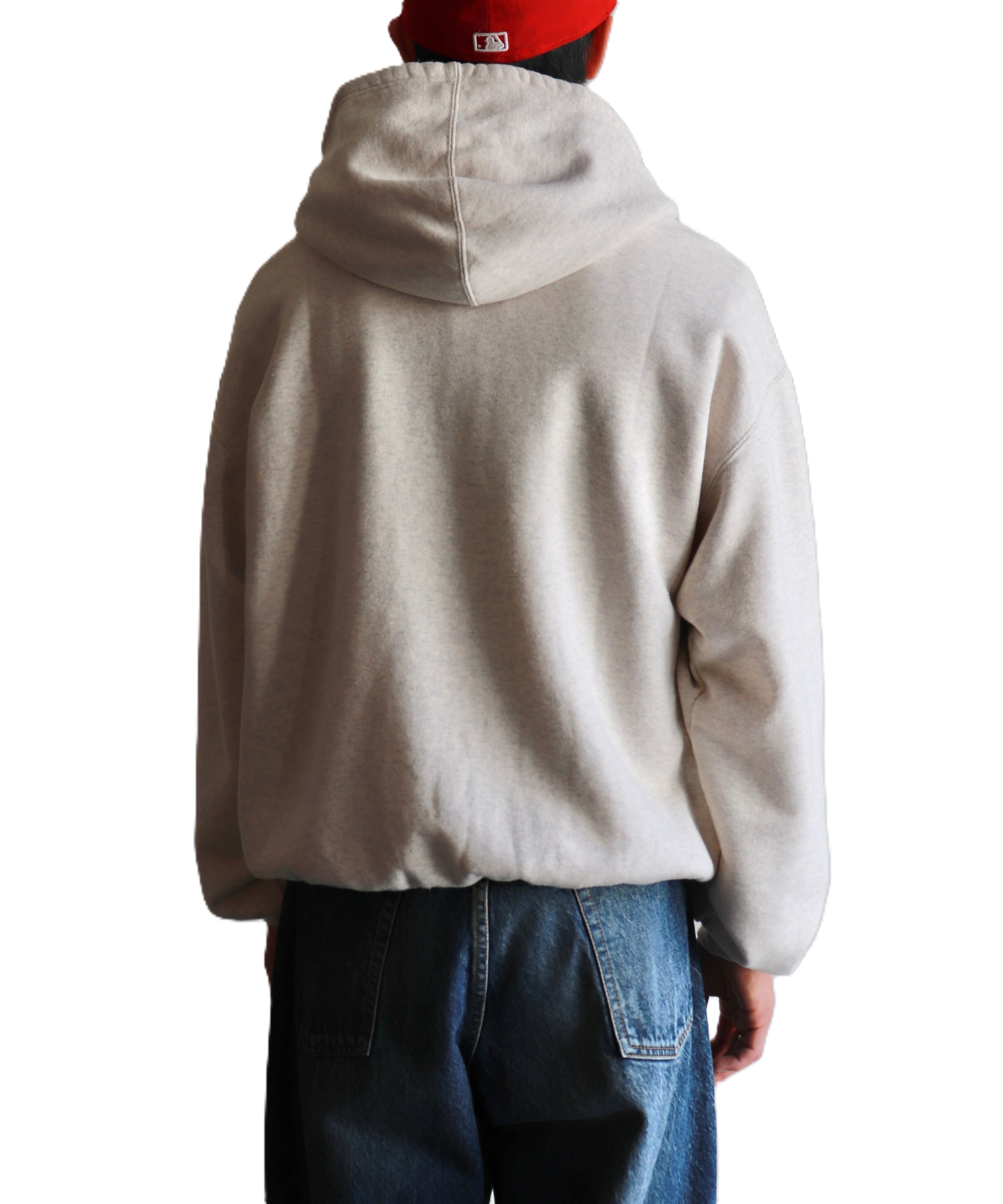 大きめのフードに、ゆったりとした身幅、やや短めの丈感。袖と裾のリブはやや強めで、中に折り込んで着ることも可能です。