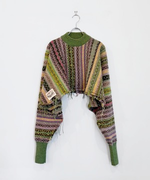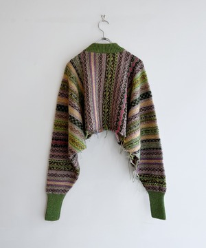 普通に着るとクロップドセーターですが、右袖下が閉じていないので右袖を首に巻くとマフラーの様になり、またそこの裏側の編み地が見えるデザインです。