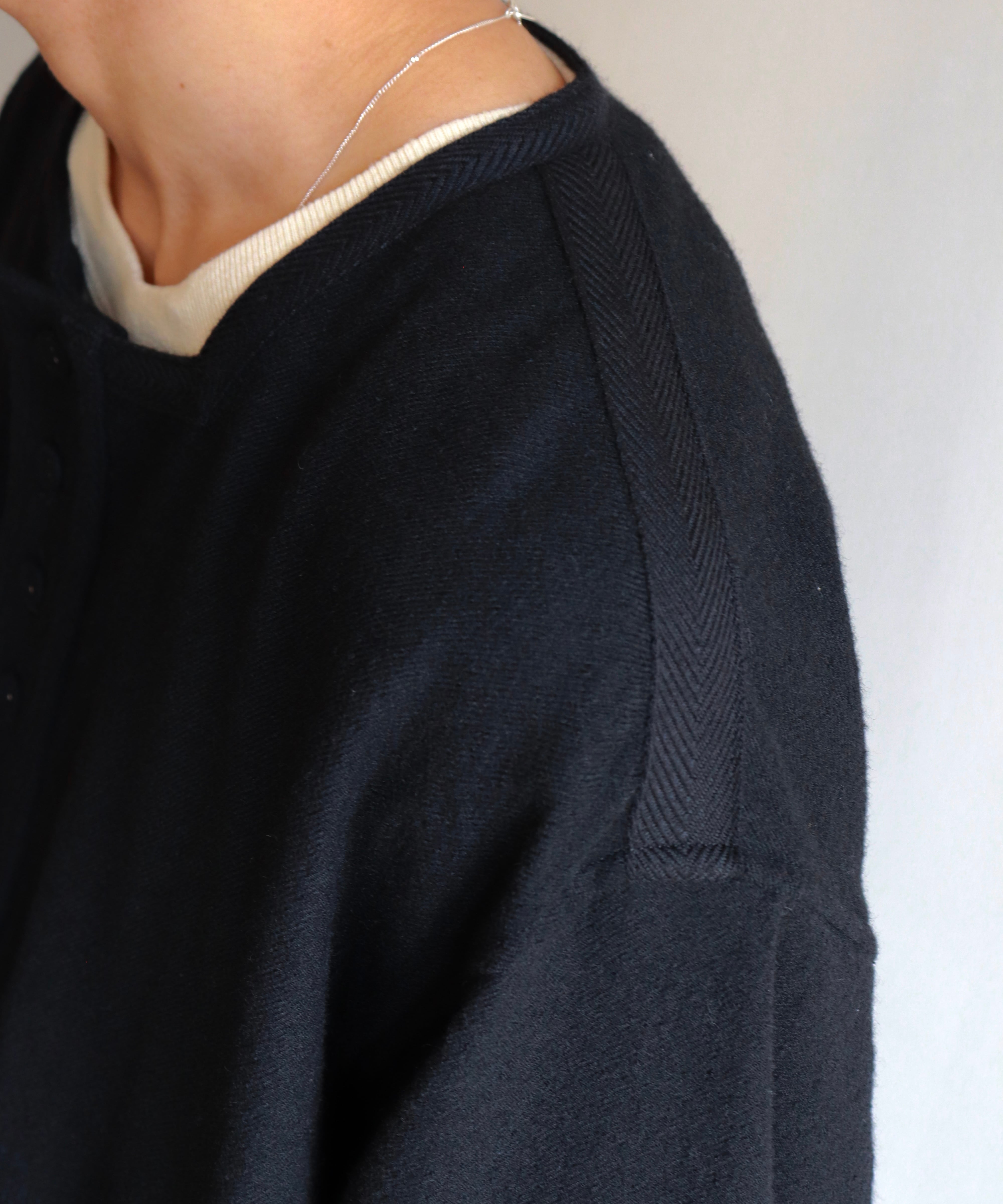 スクエア型のネックラインに加え、ネック・袖・肩には別生地でパイピングを施し、アクセントを効かせています。