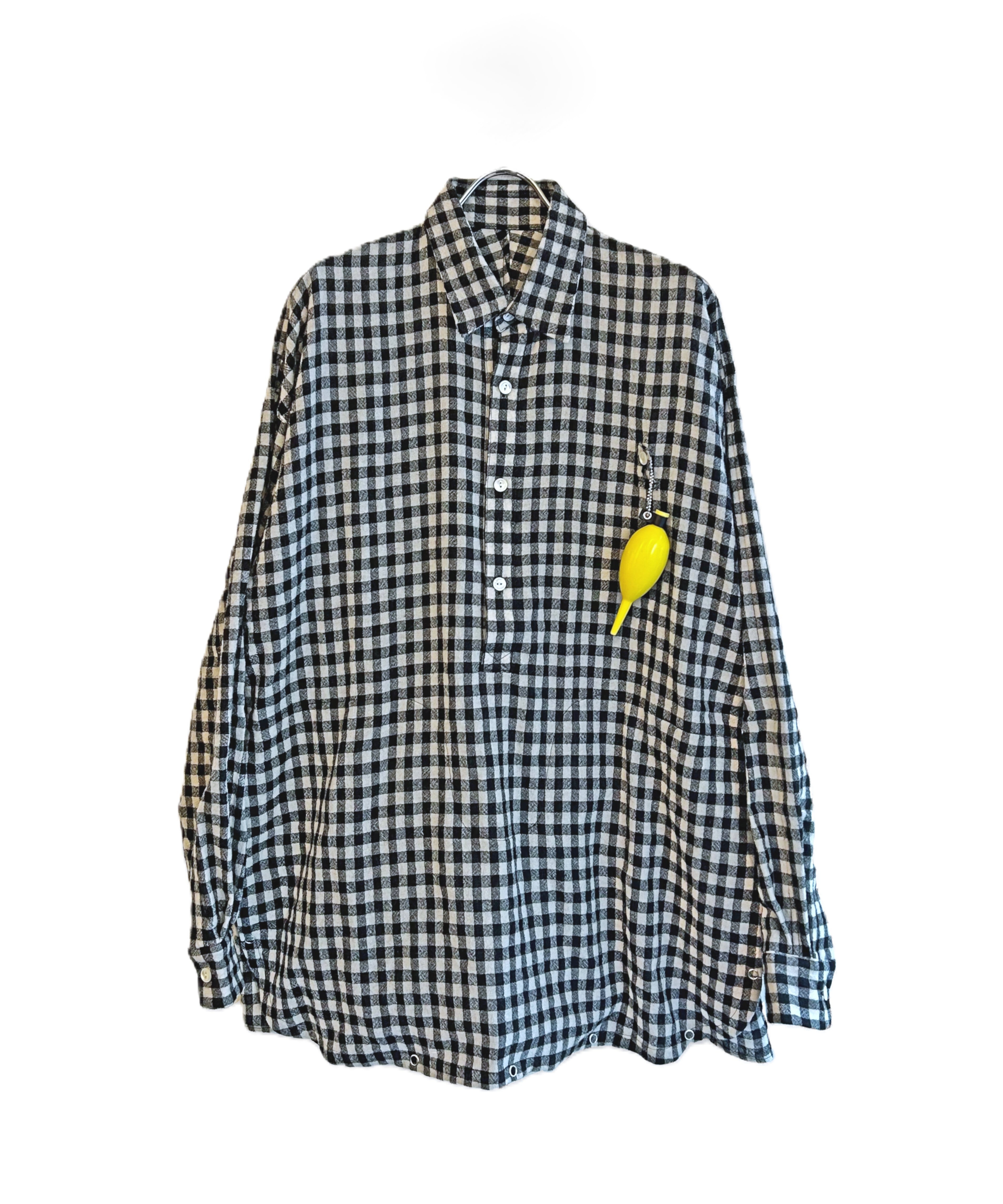 エアピローを収納し、机に突っ伏して寝られるようにデザインされた裾の仕様が特徴的で、独特のラウンドカットが目を引くシャツです。