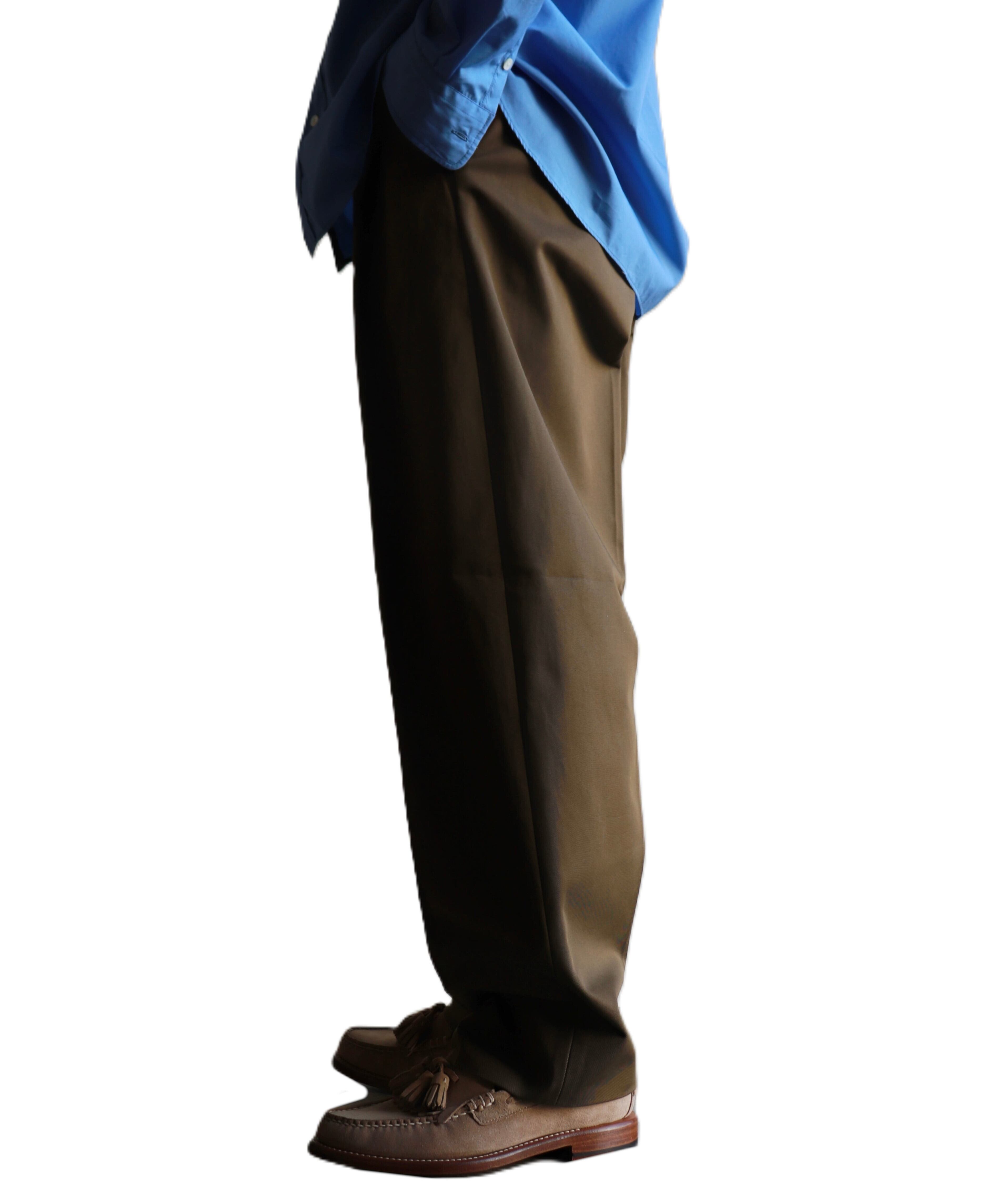 コンパクト紡機でクリアに仕上げたコーマ糸使いの高密度コットンチノを採用した、ワンタック仕様のトラウザー。