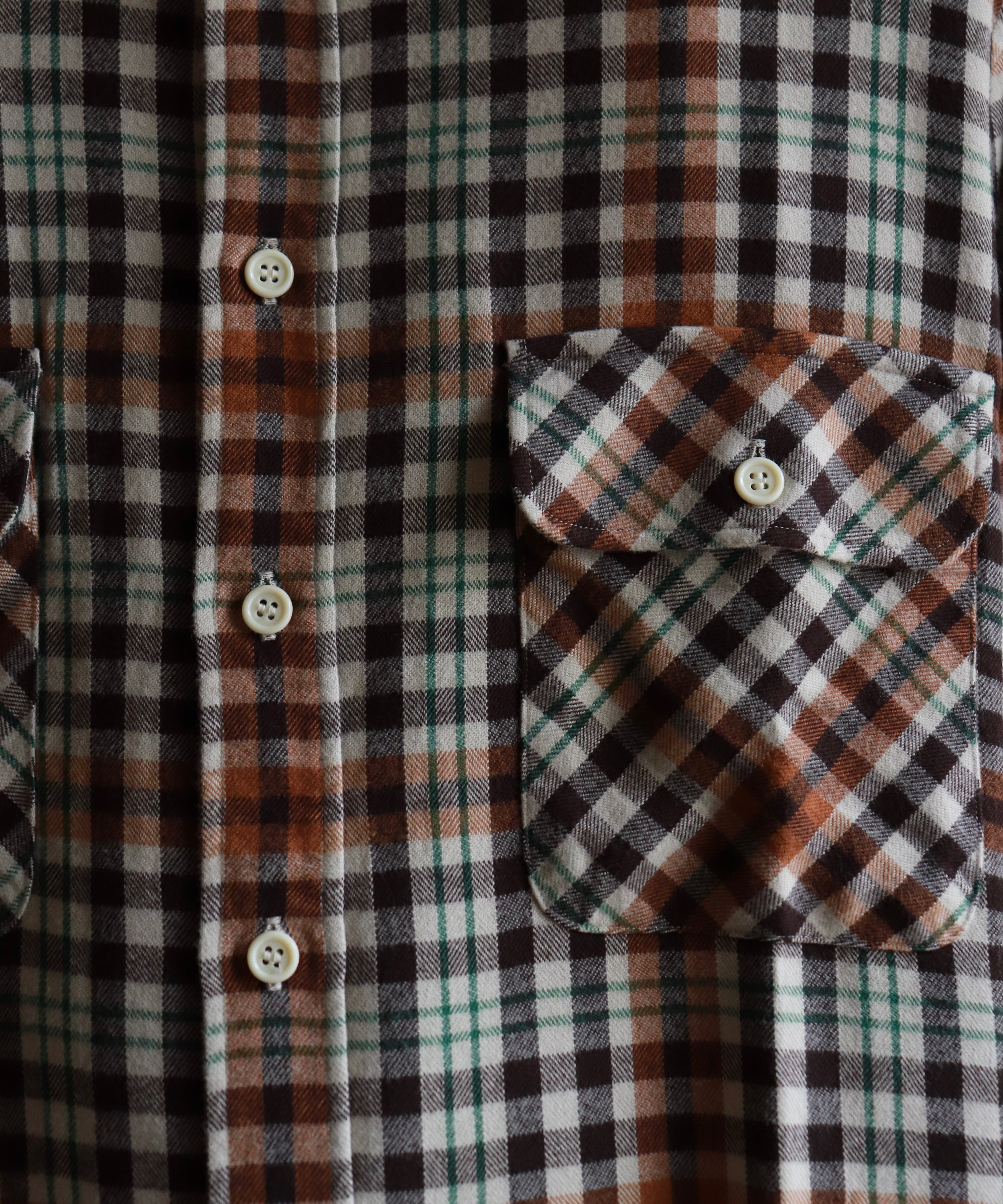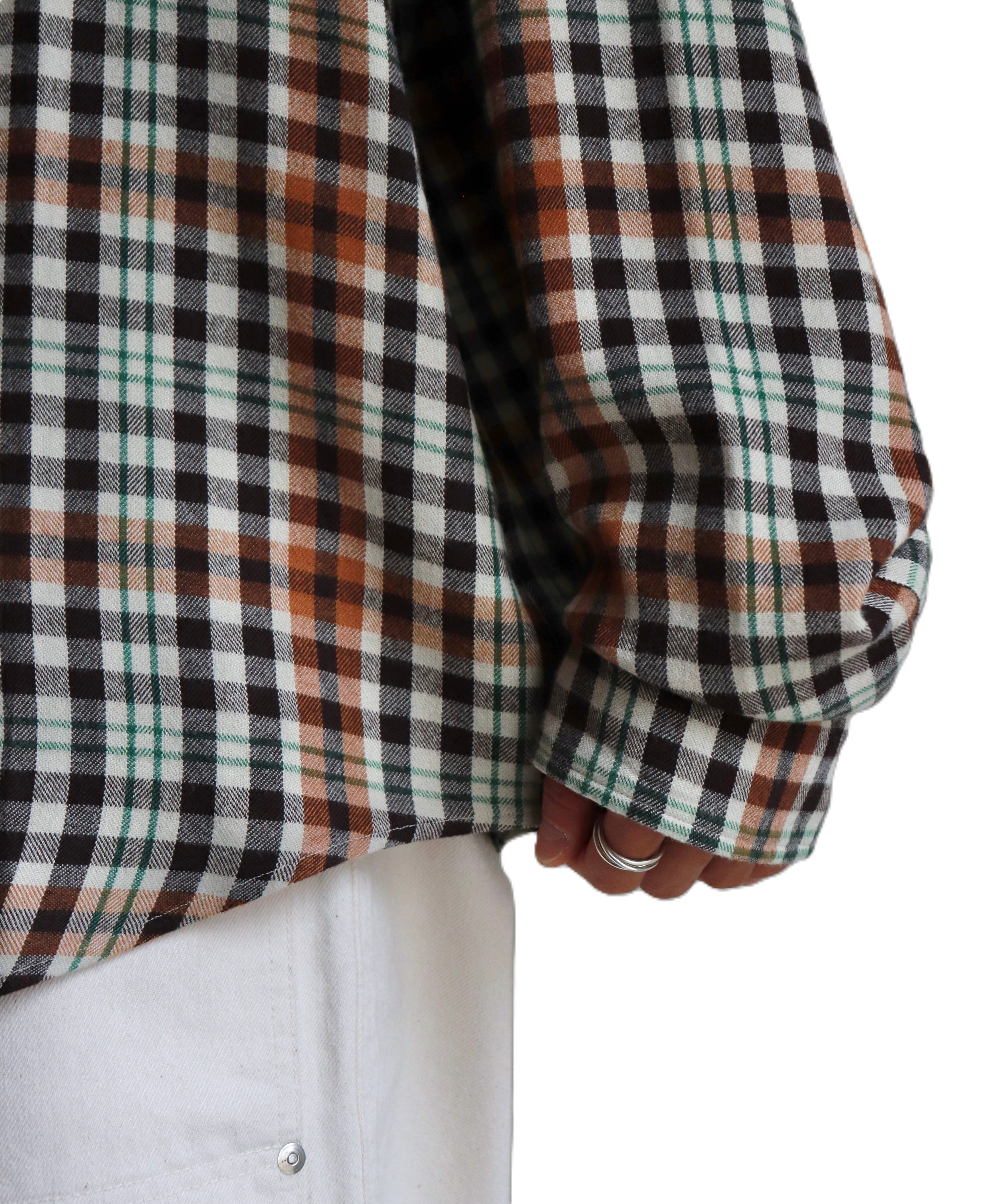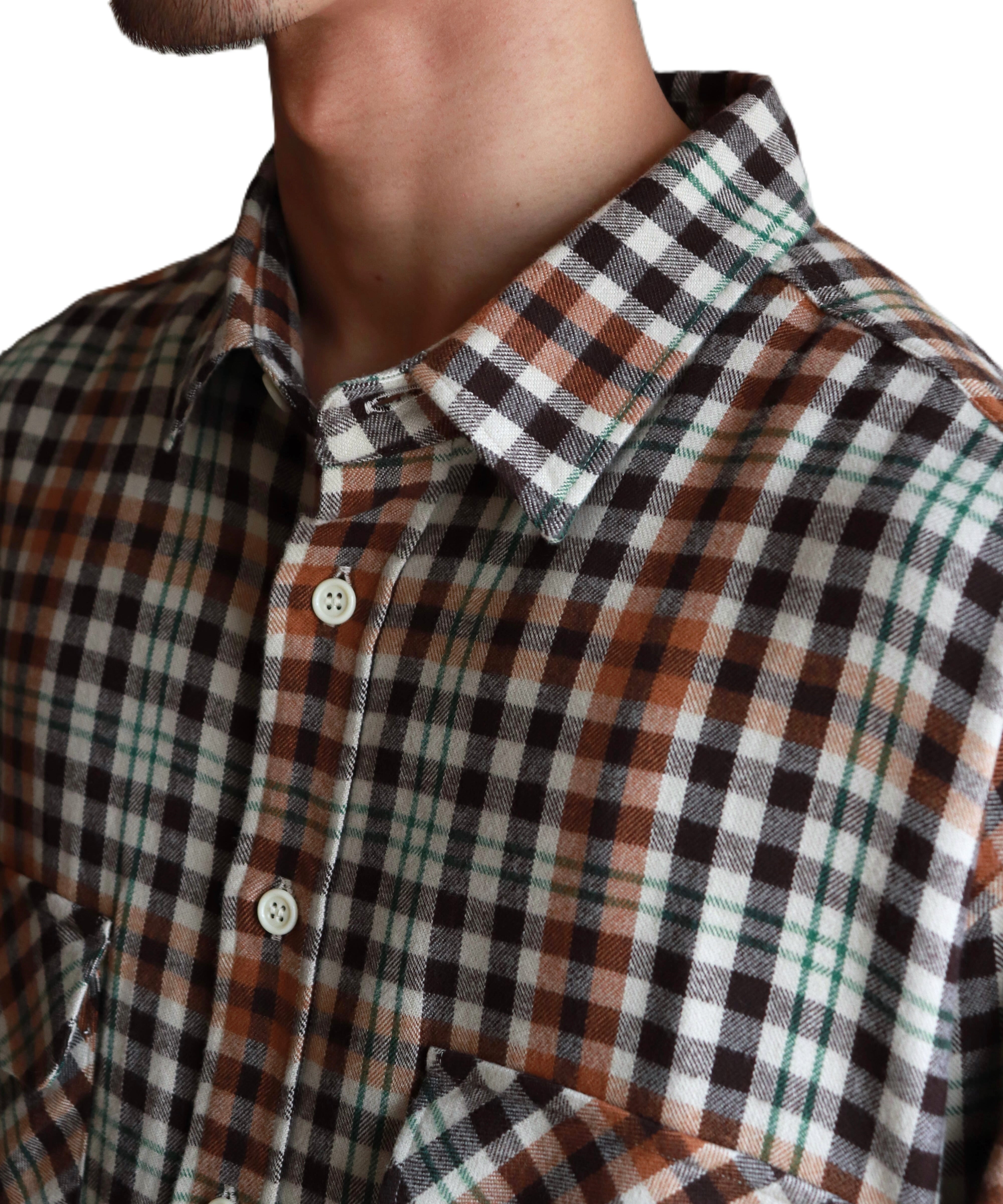 一見コットンネルシャツのような表情ですが、実はレーヨン100%。見た目に反してしっかりとした肉感がありながら、肌触りはとてもなめらかで美しいドレープ感が魅力です。