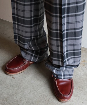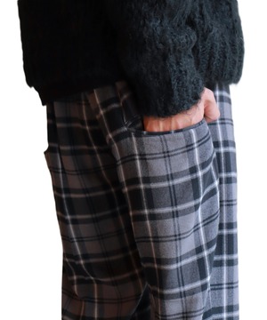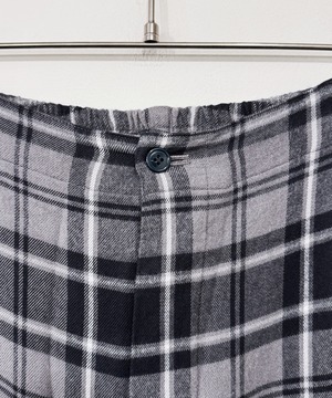 レーヨン100%のチェックパンツ。見た目に反してしっかりとした肉感がありつつ、なめらかな肌触りと美しいドレープ感が魅力です。