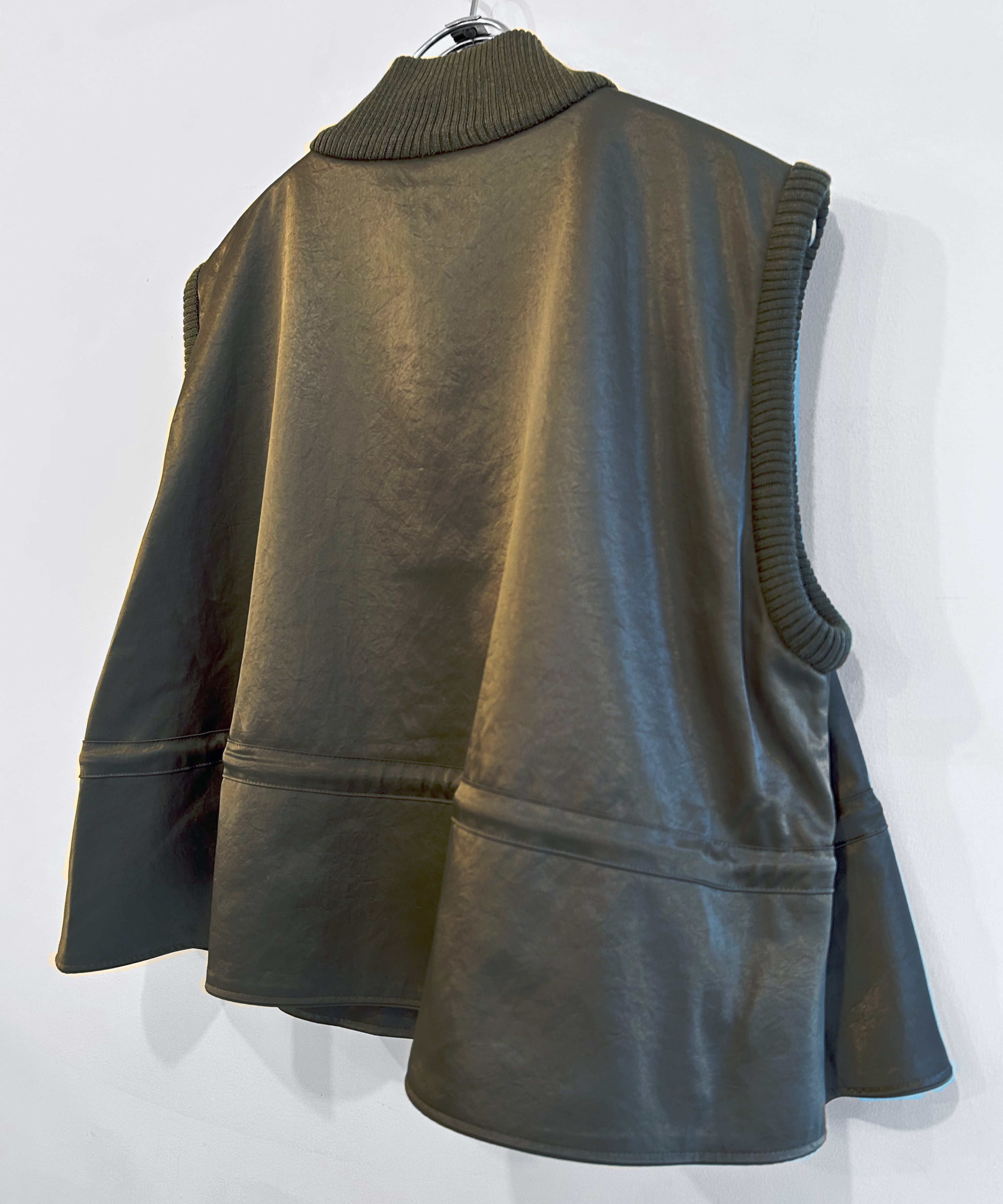 レザーのような艶を放つサテン生地と、柔らかなリブテキスタイルのリバーシブルデザイン。逆開ファスナー仕様で、スタイリングの幅が広がるベスト。