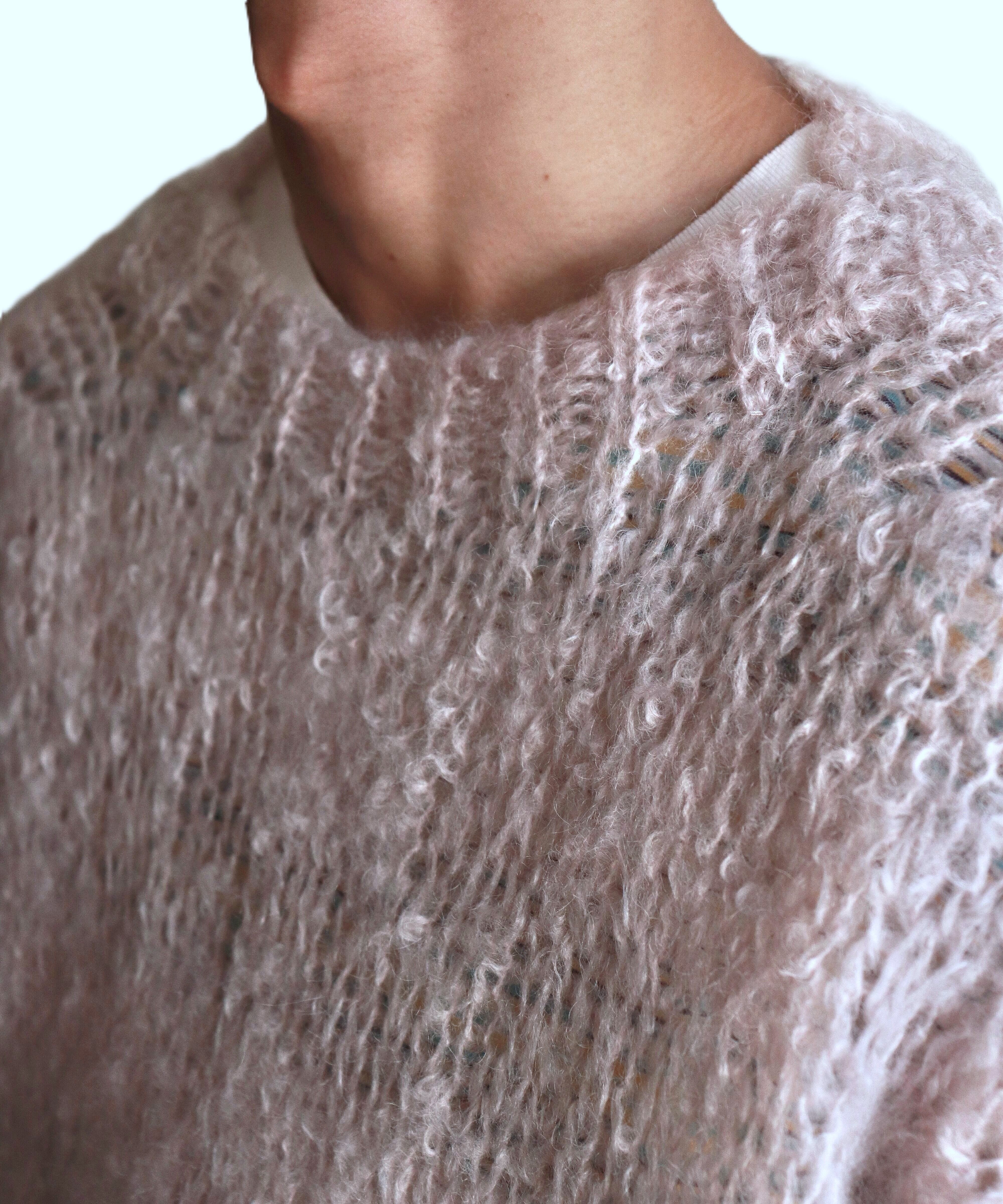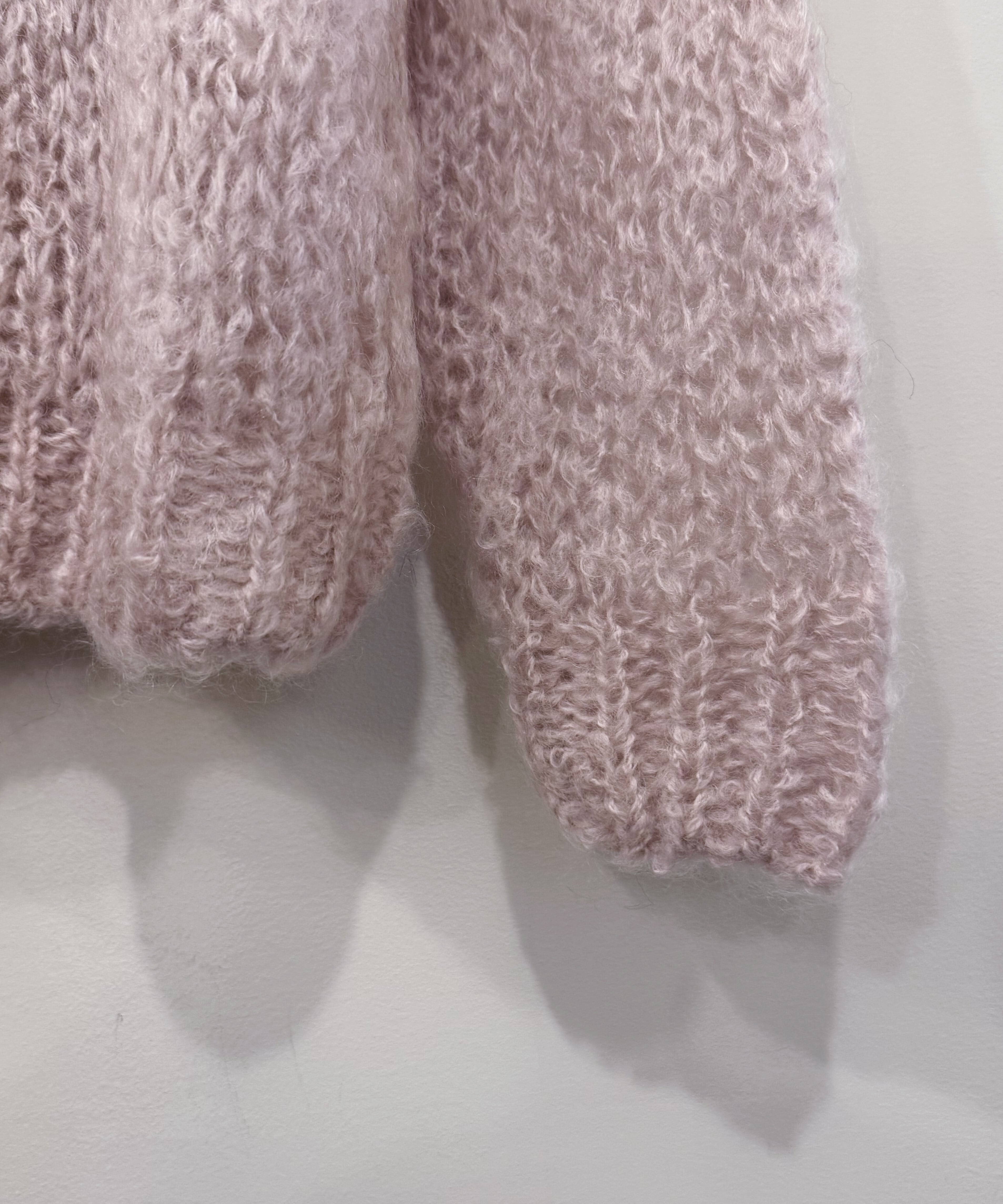起毛のムラやウールとモヘアの素材違いによる色差、フラットな編み方をしても編み目の凹凸感が出る素材です。
