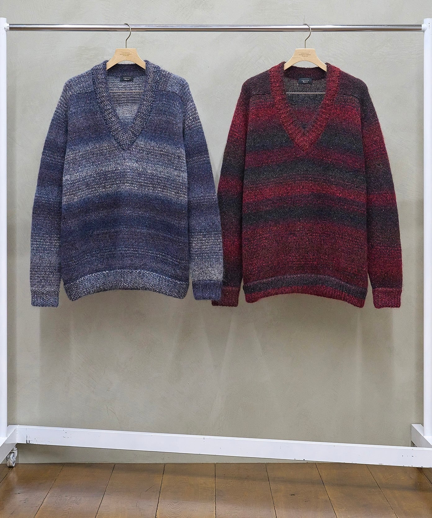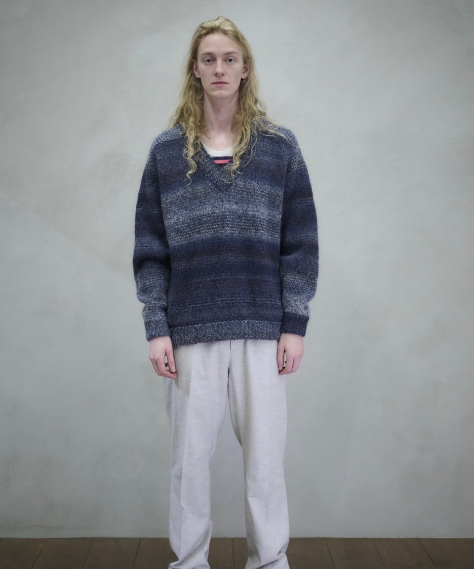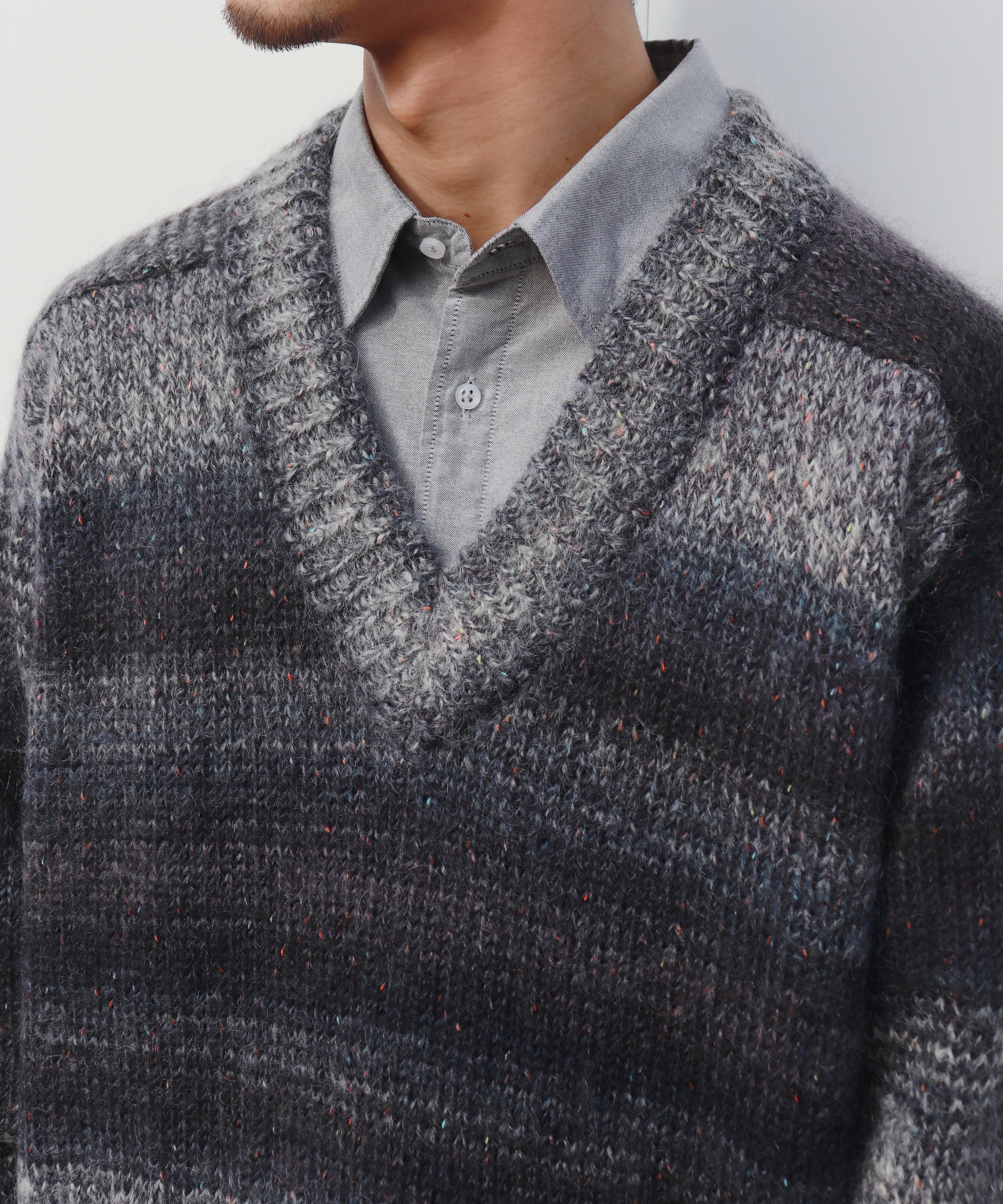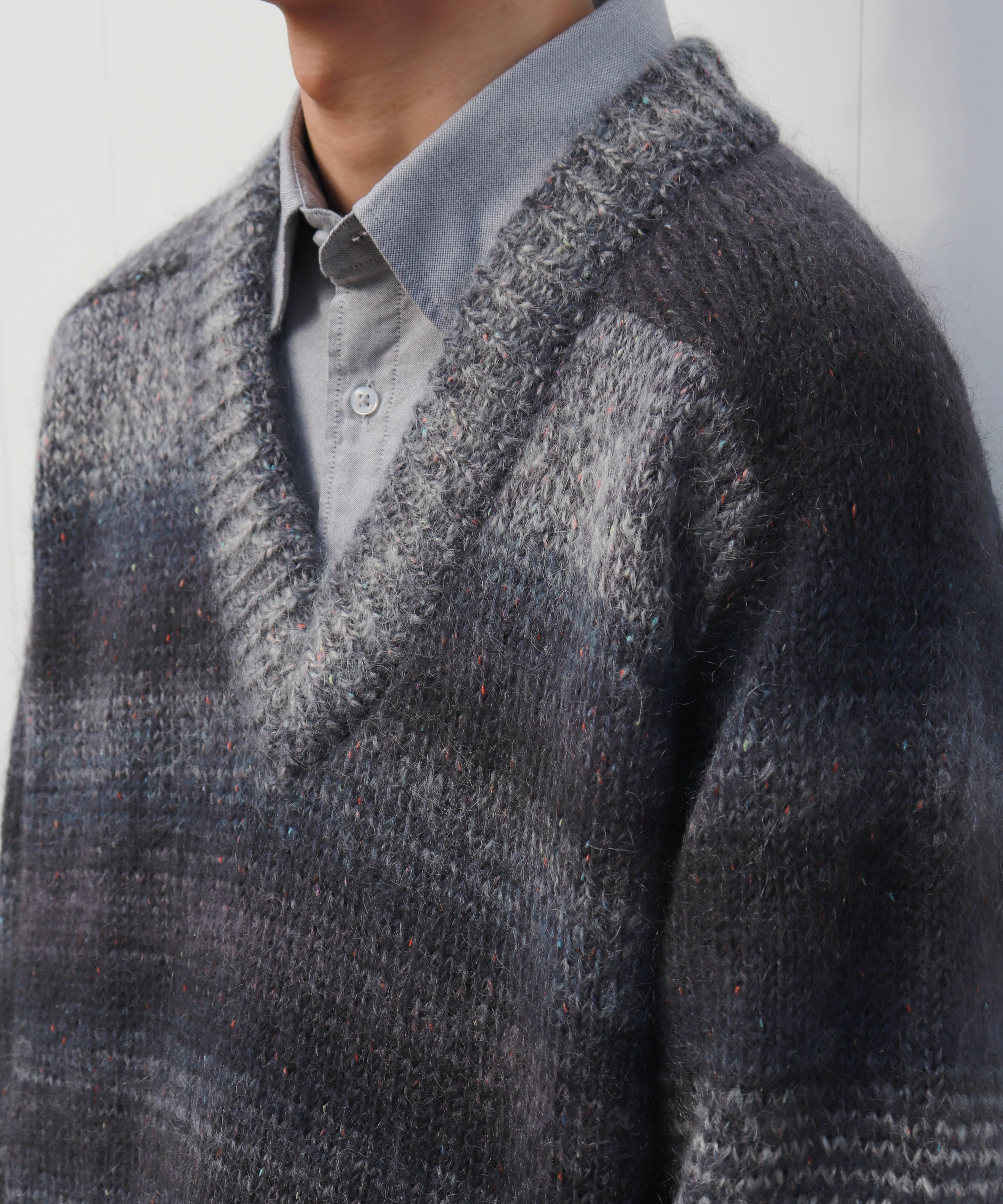 ふんわりとしたモヘア特有の軽さと温かみがあり、グラデーションの色味が柔らかくスタイリングに深みを出してくれます。Vネックの開き具合も絶妙で、シャツやカットソーをレイヤードしてもバランスが取りやすいです。