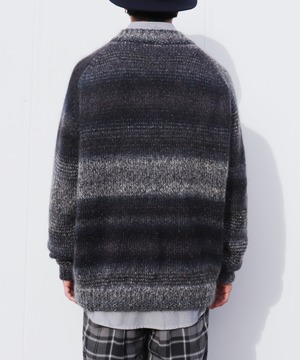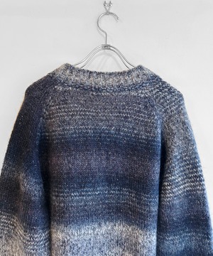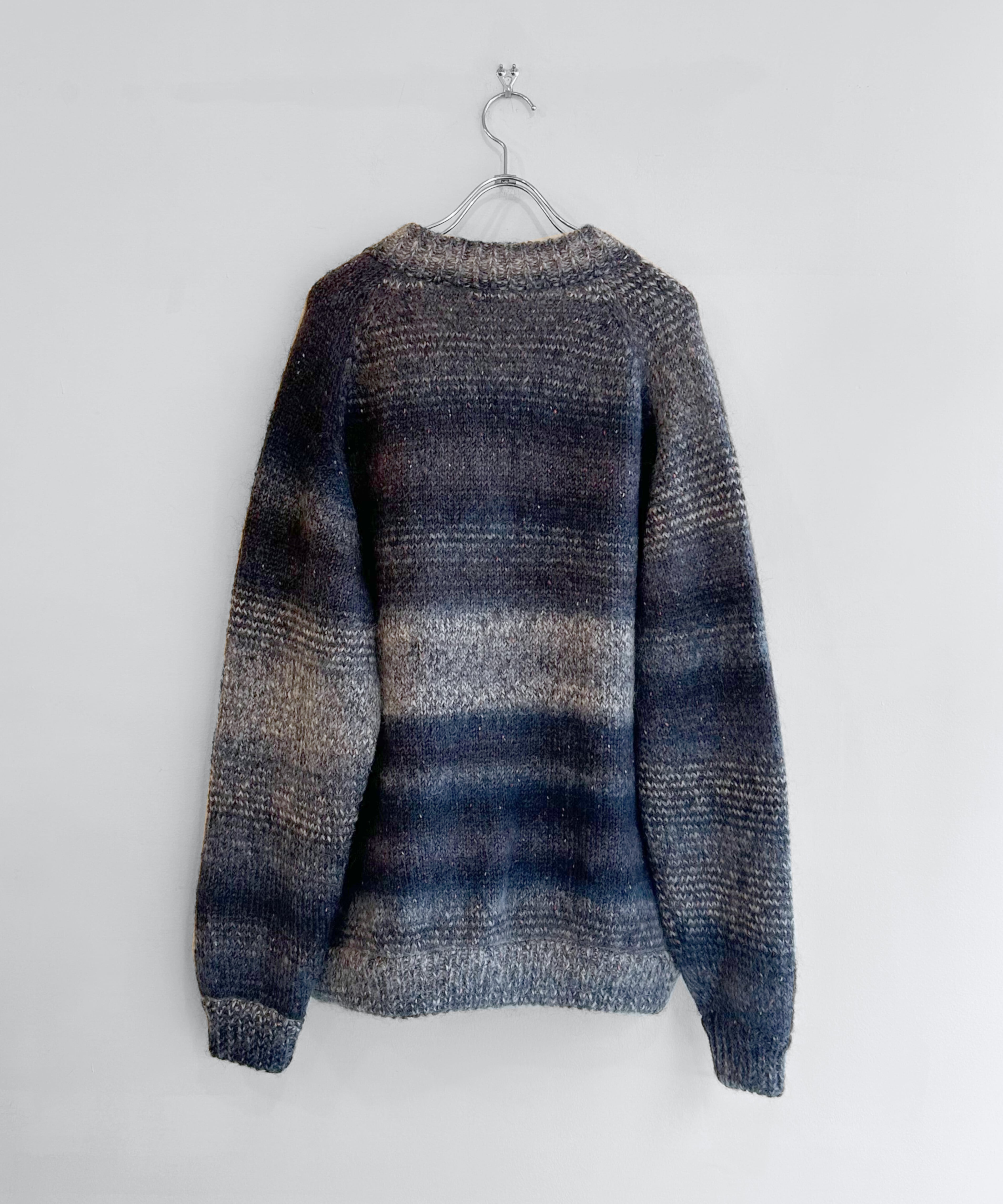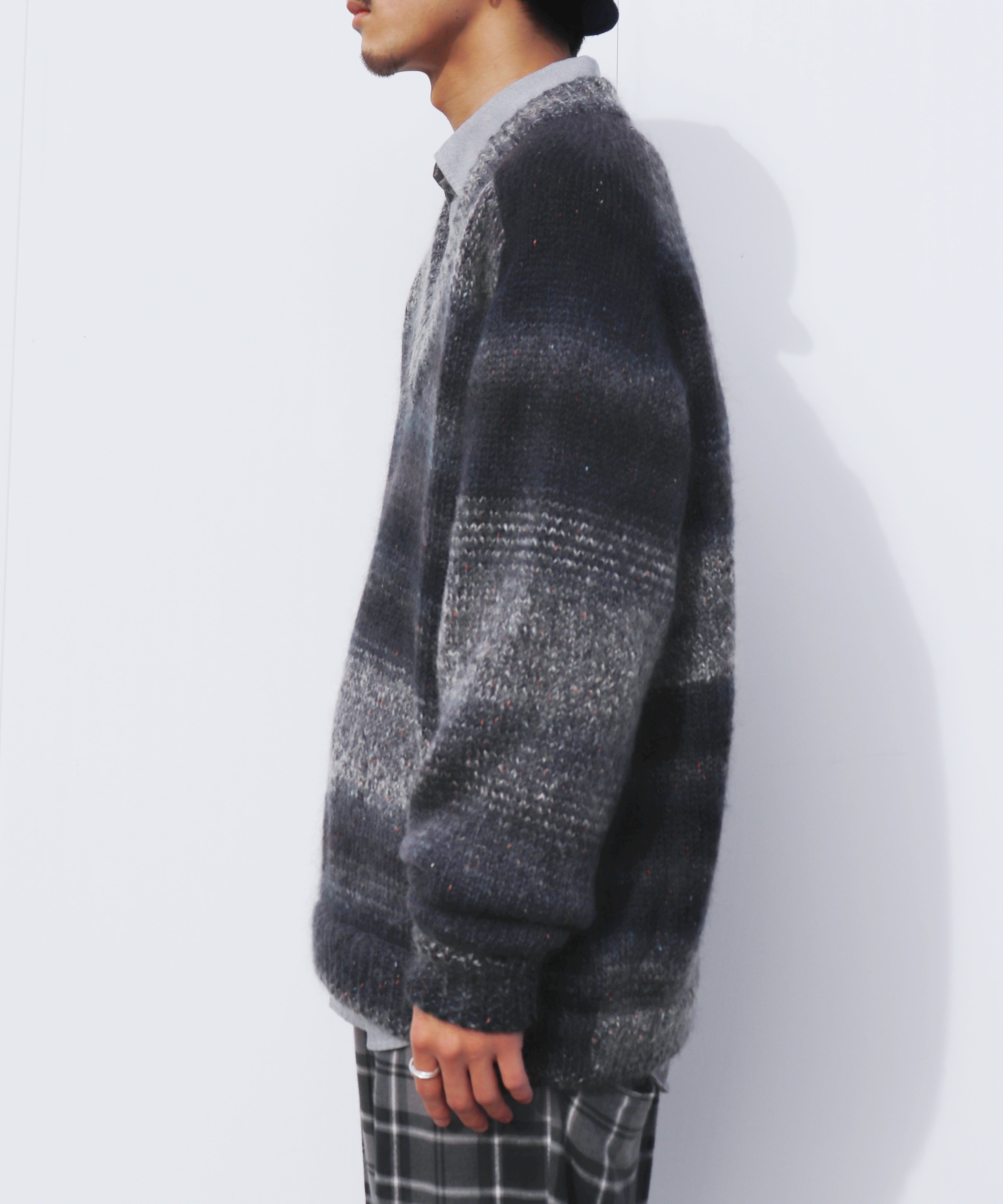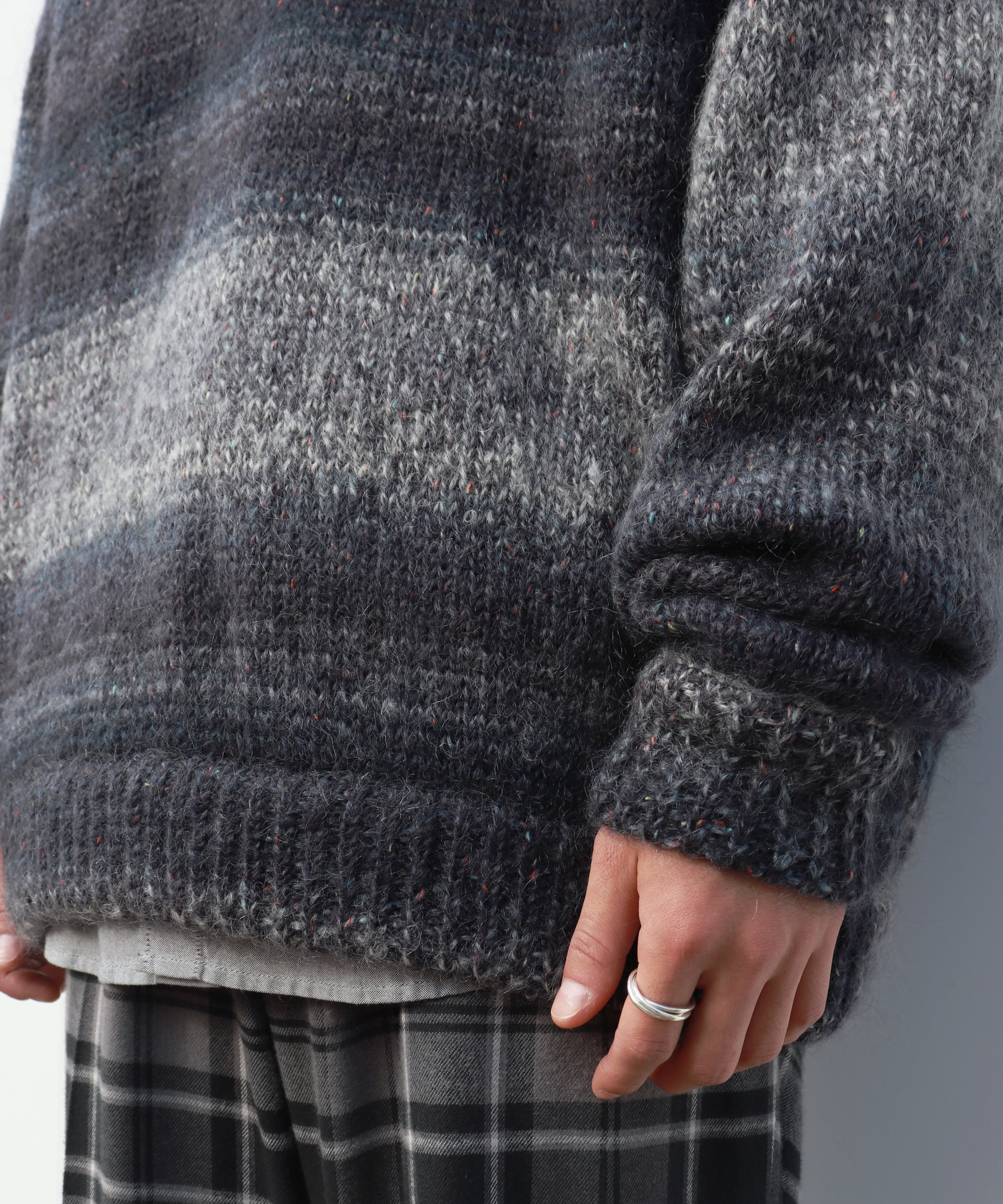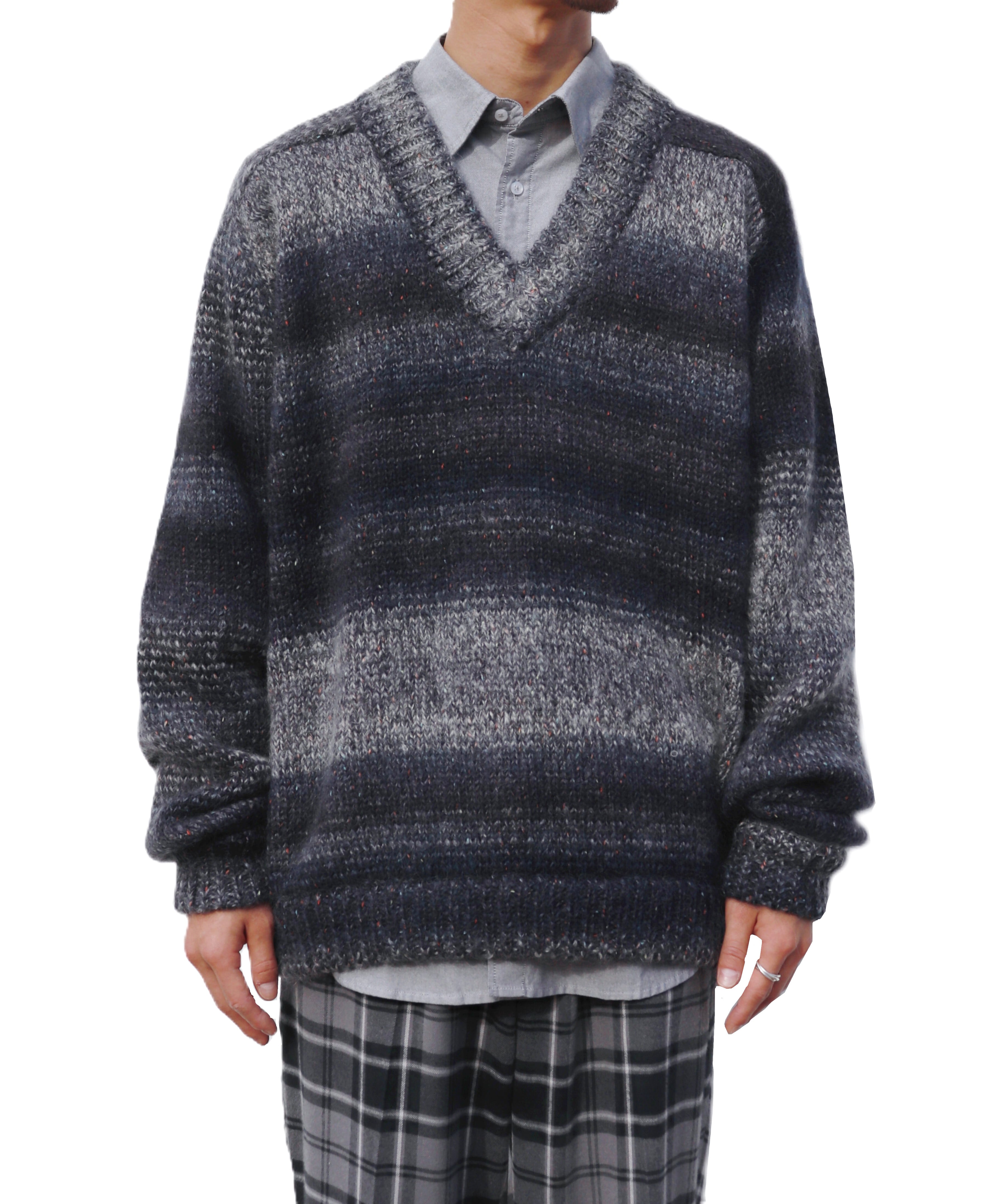 ふんわりとしたモヘア特有の軽さと温かみがあり、グラデーションの色味が柔らかくスタイリングに深みを出してくれます。Vネックの開き具合も絶妙で、シャツやカットソーをレイヤードしてもバランスが取りやすいです。