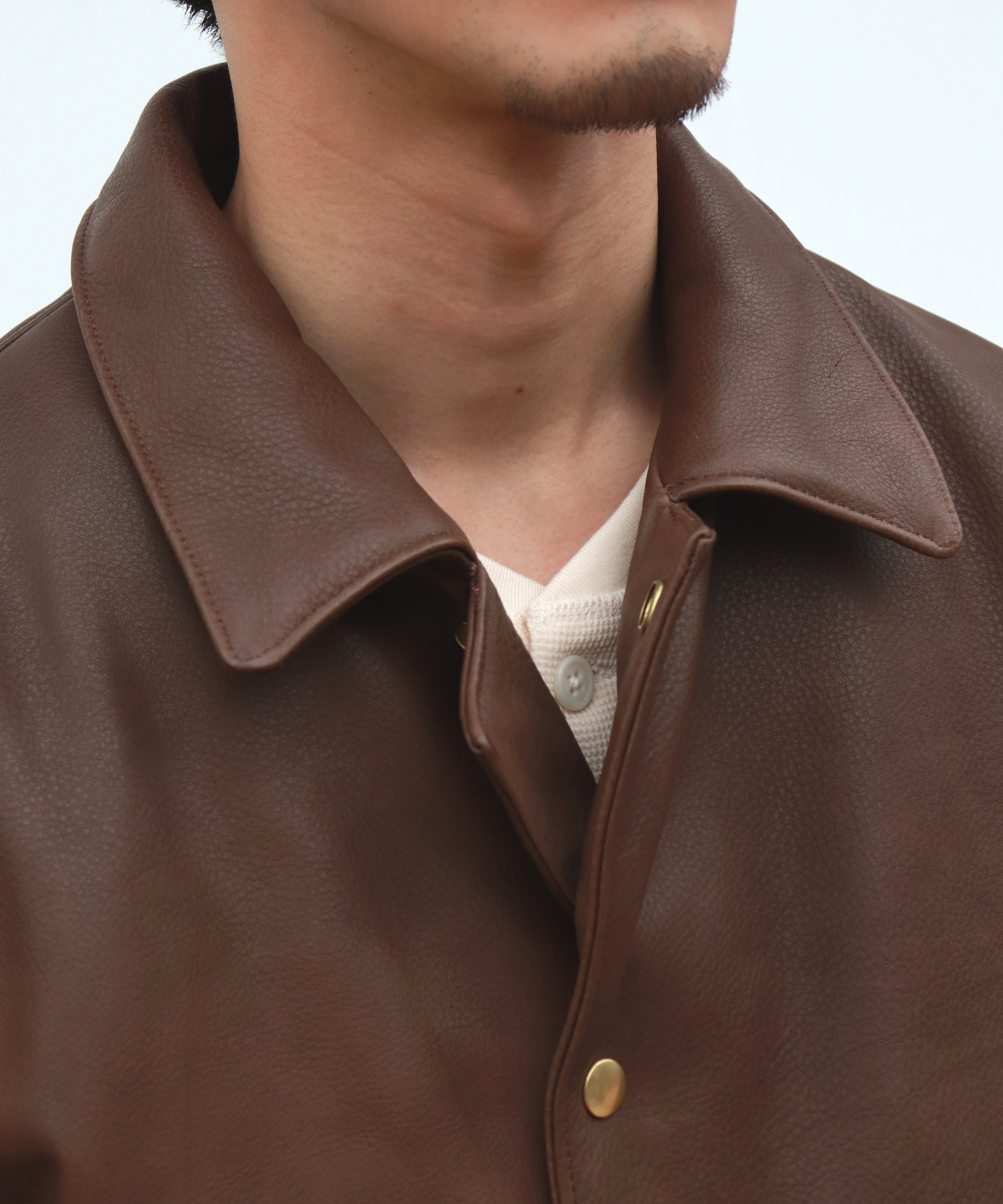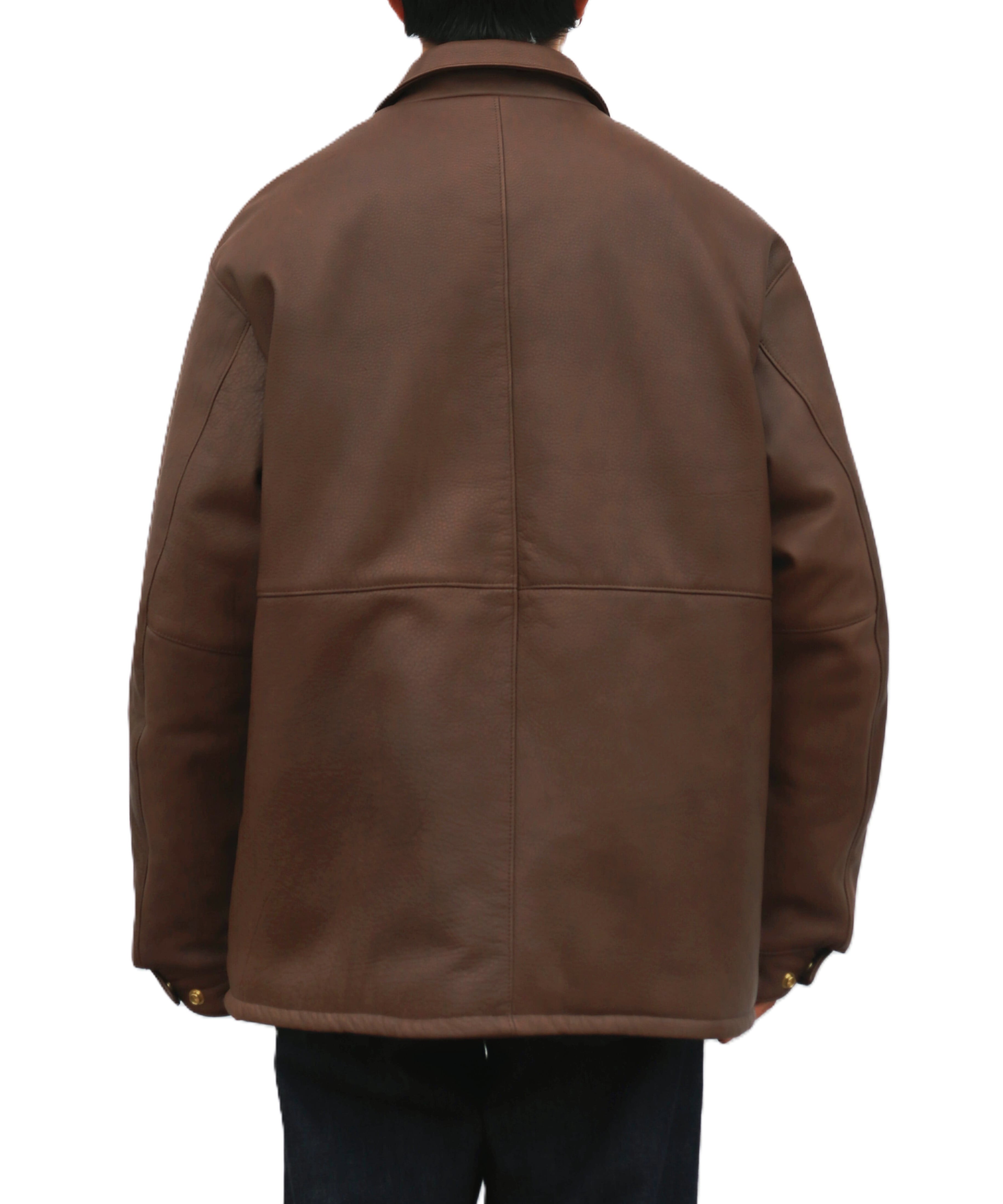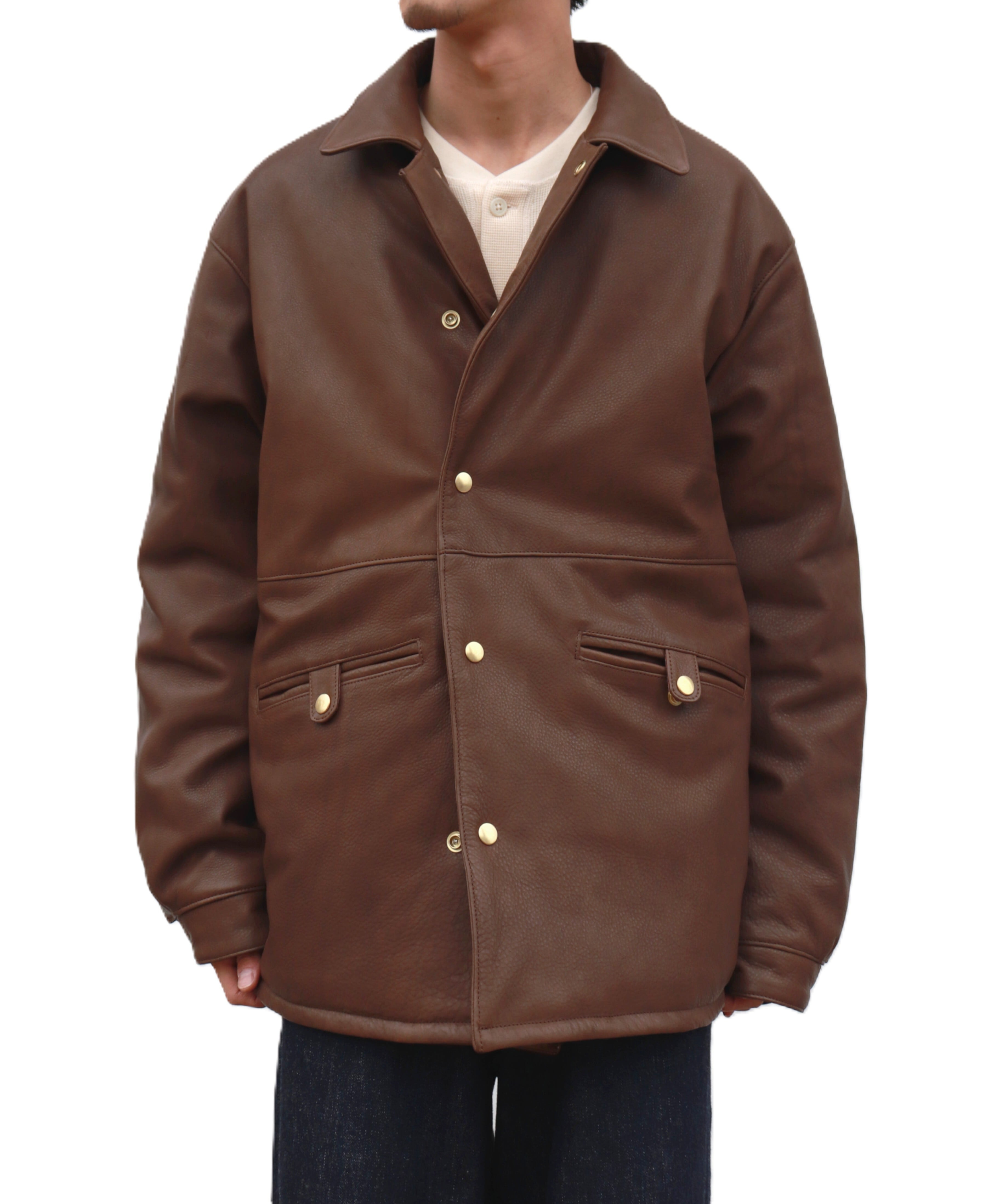 シボ感のあるレザーを贅沢に使用した中綿入りカーコートは、UNUSEDらしいゆとりあるボックスシルエットと、肩の収まりの美しさが際立つ一着。