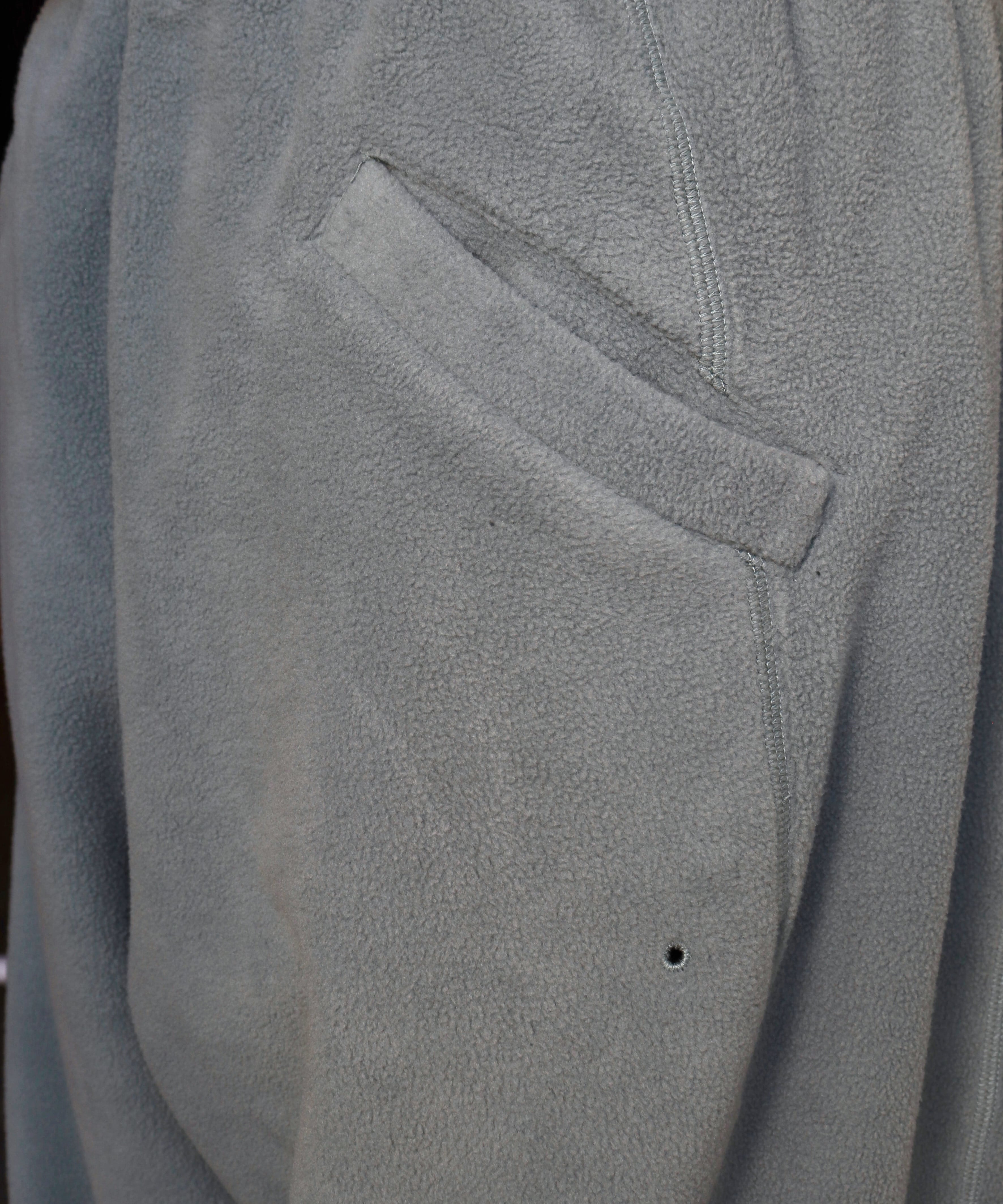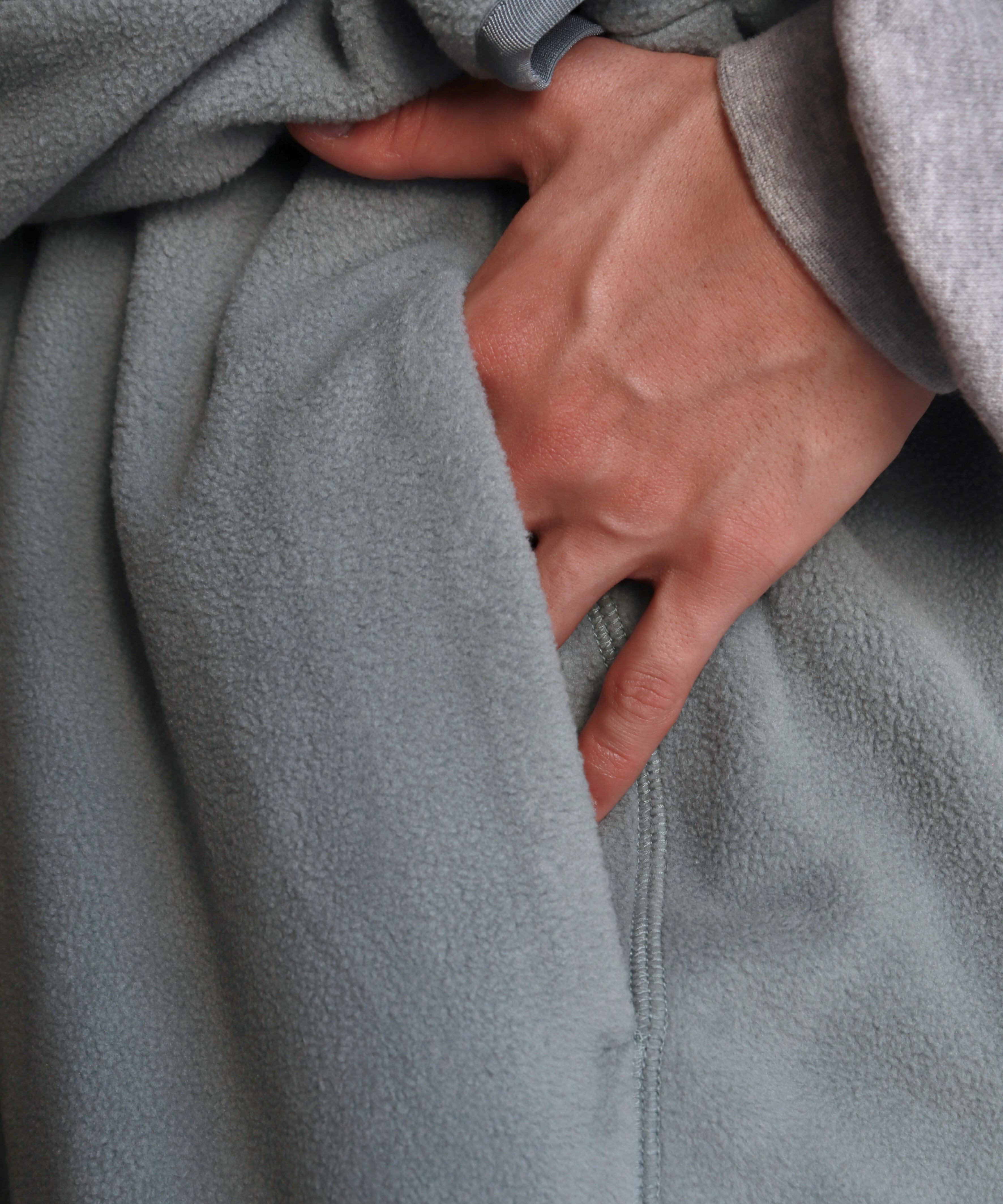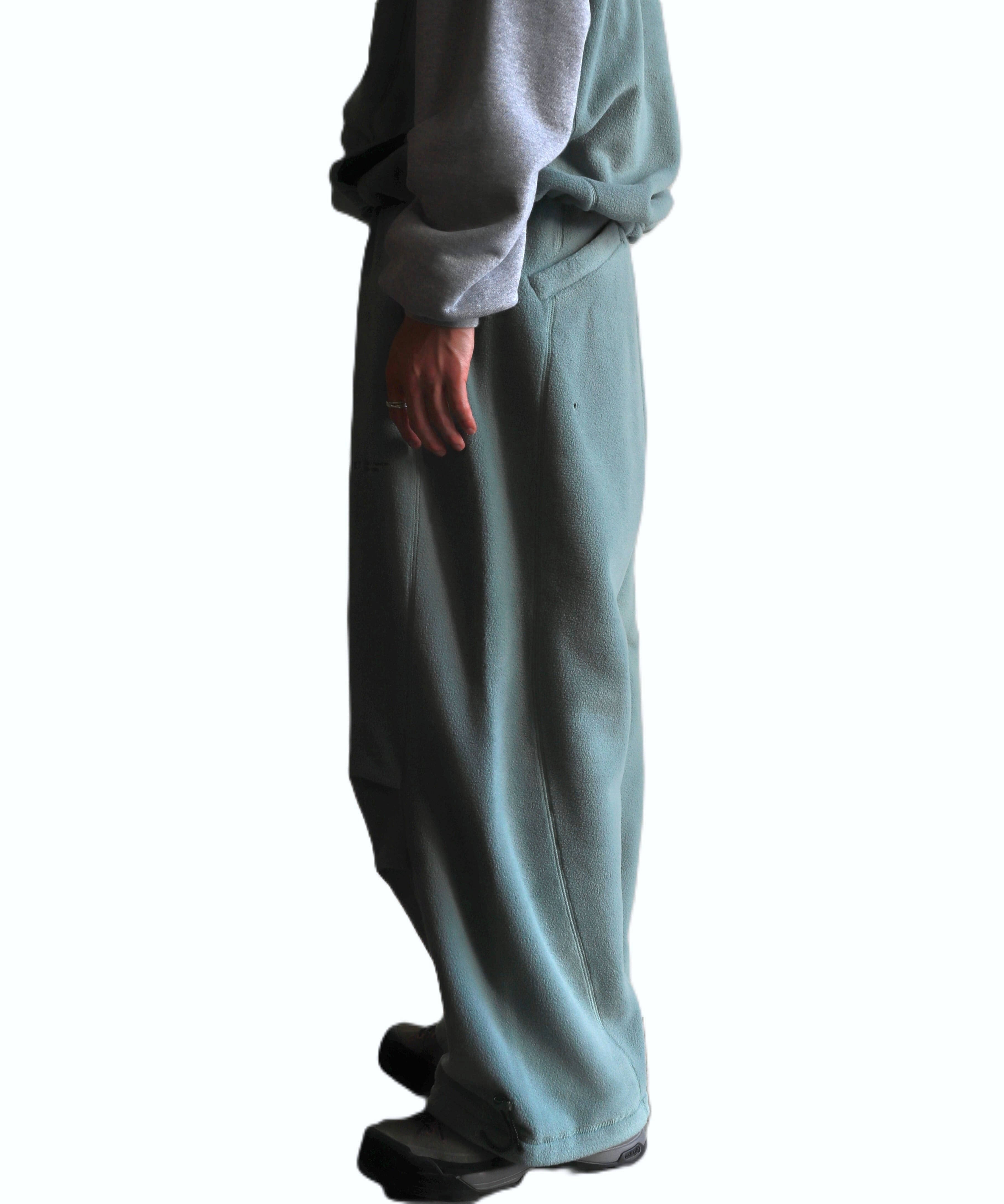 サークル状の切り替えとワイドシルエットが特徴のフリースパンツ。