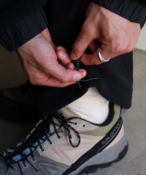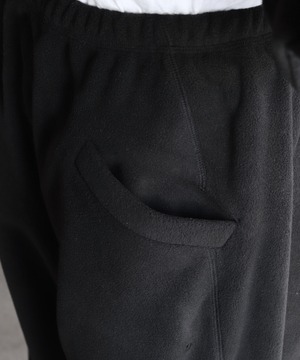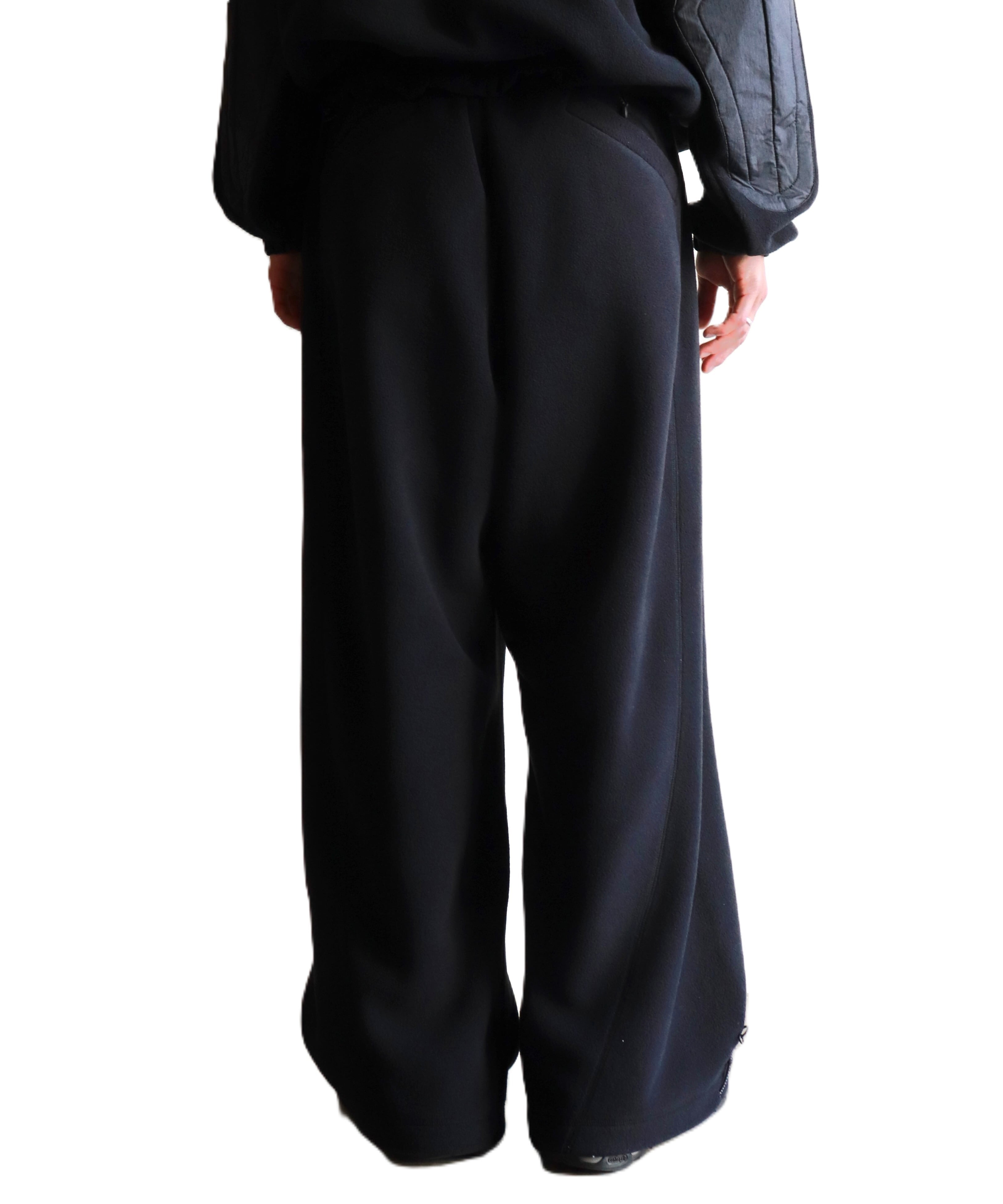 サークル状の切り替えとワイドシルエットが特徴のフリースパンツ。