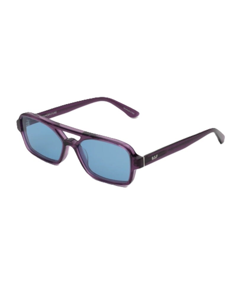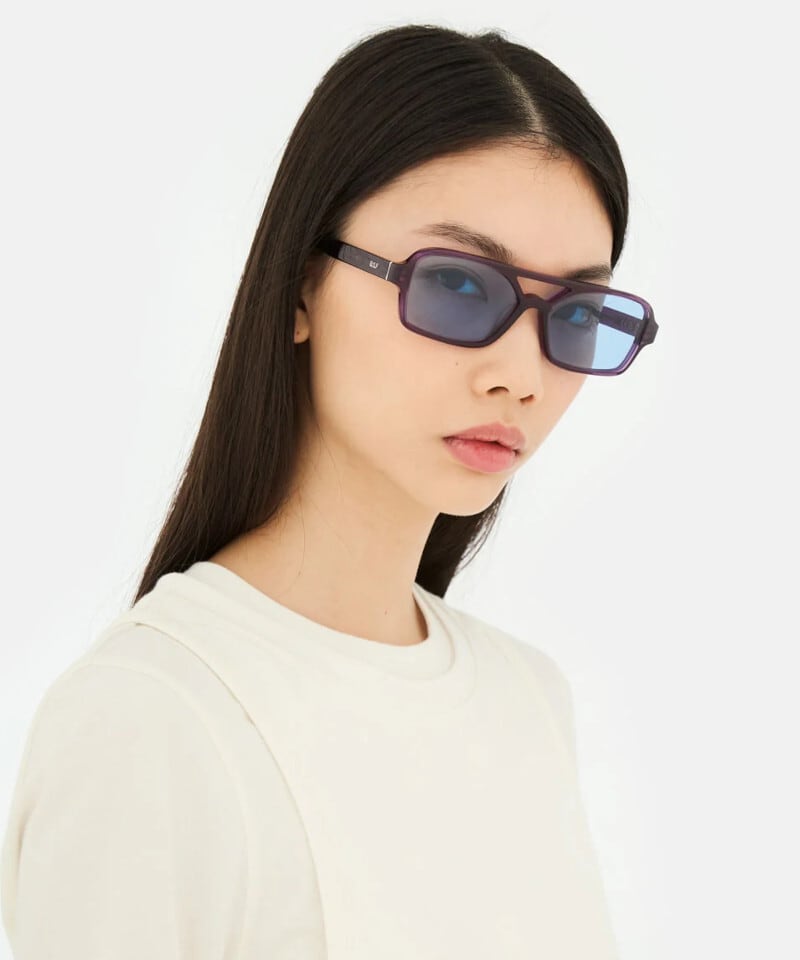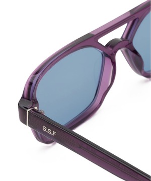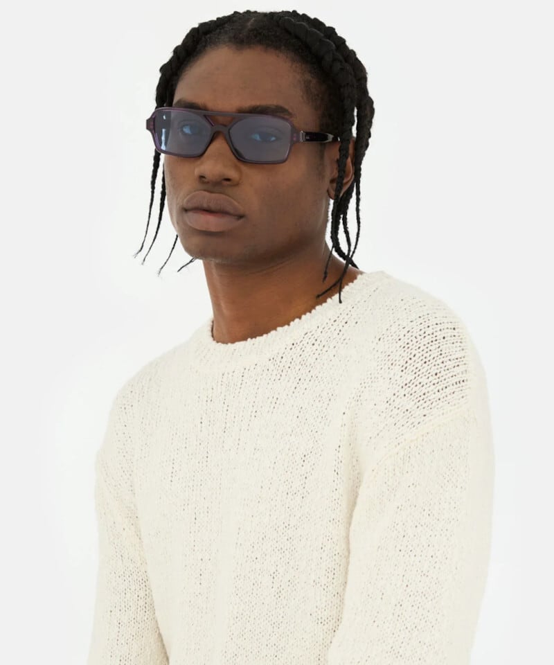 洗練されたクリスタルオーベルジーヌアセテートを使用した、イタリア産の高級アセテートレンズ。