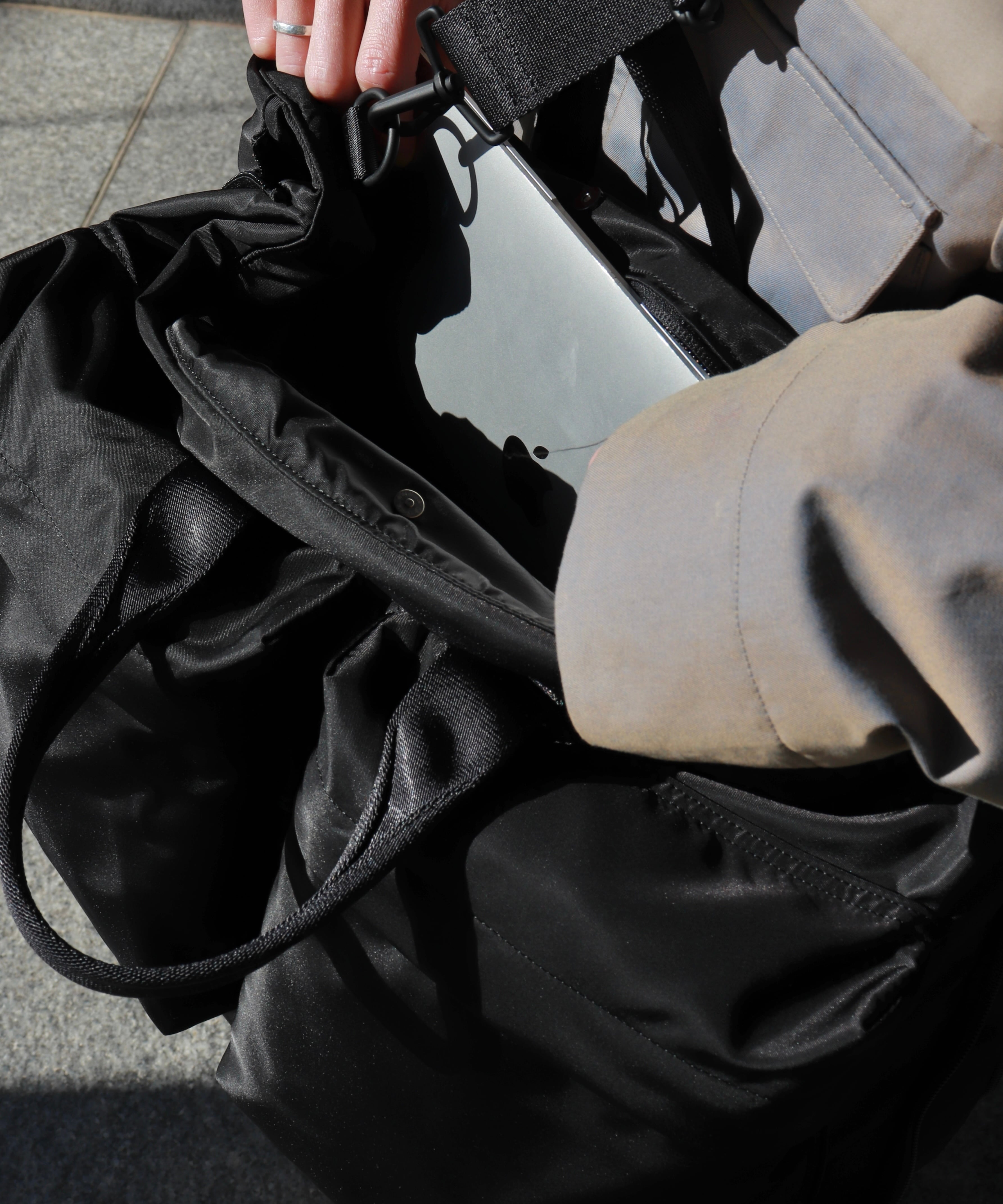 サイドのジッパーを開閉することで容量やシルエットを大きく変えることができます。
