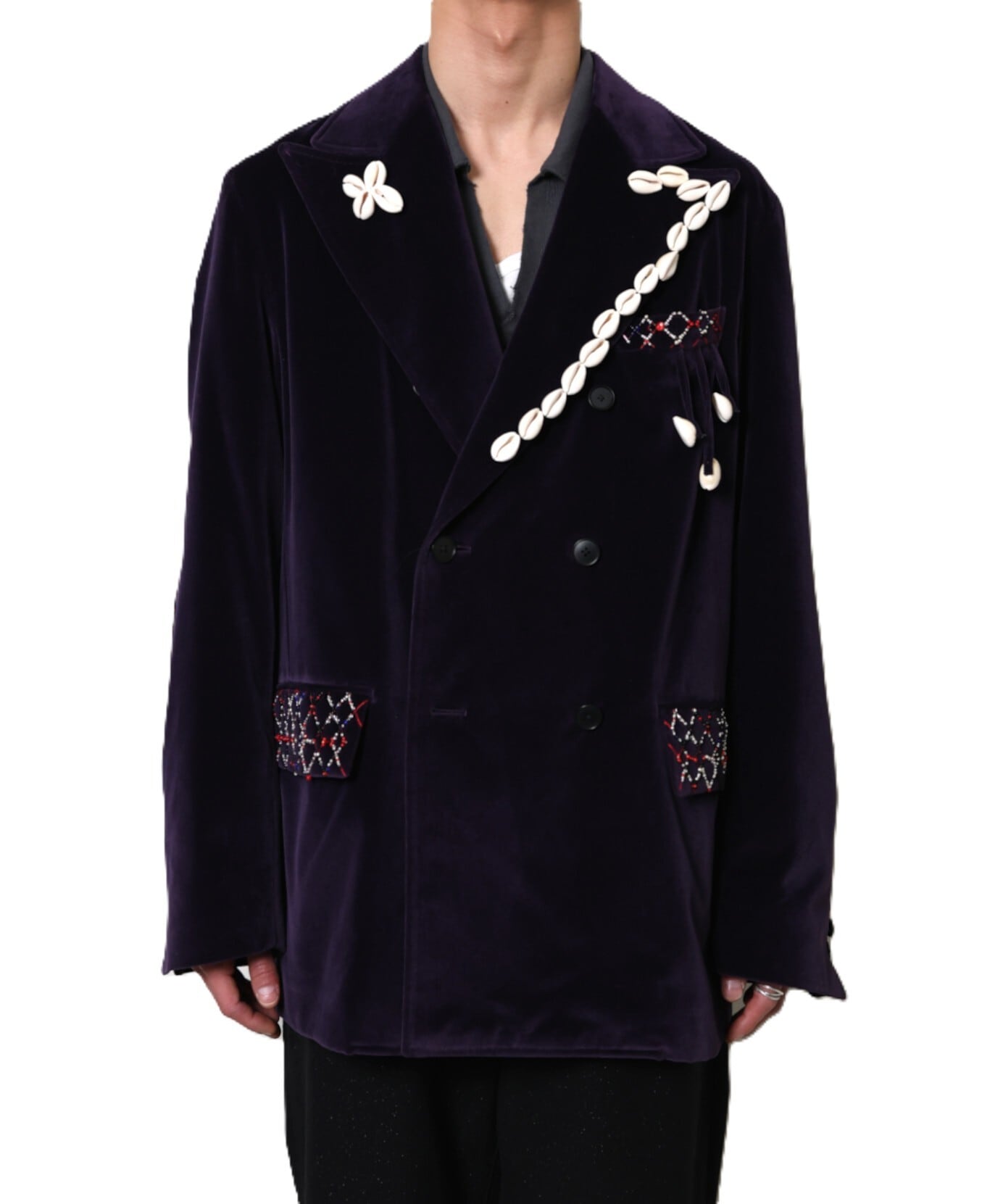 ベルベットの深い光沢に、タカラガイとビーズの装飾が手仕事の温度を添える一着です。