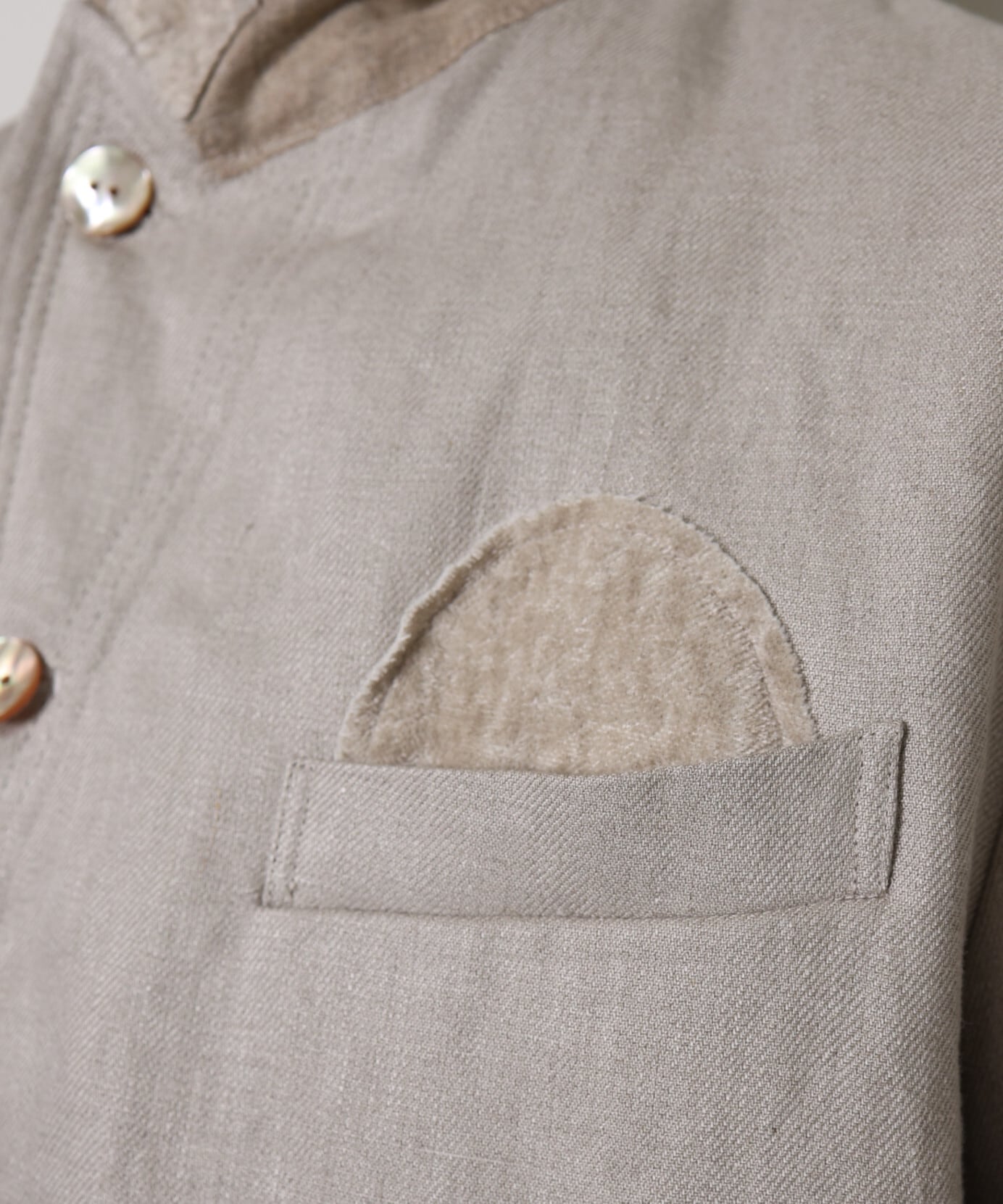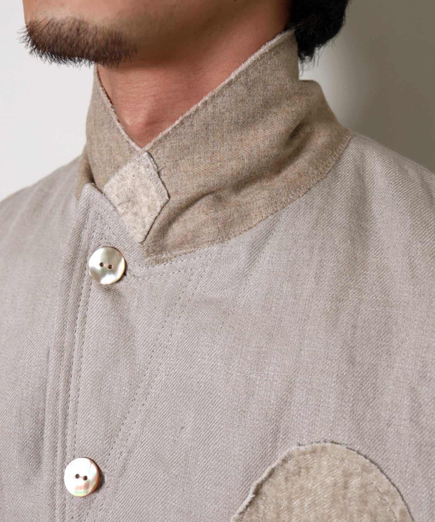 リネンの乾いた質感と、パイルの柔らかく温度を感じる表情。そのコントラストがこのジャケットの大きな魅力です。