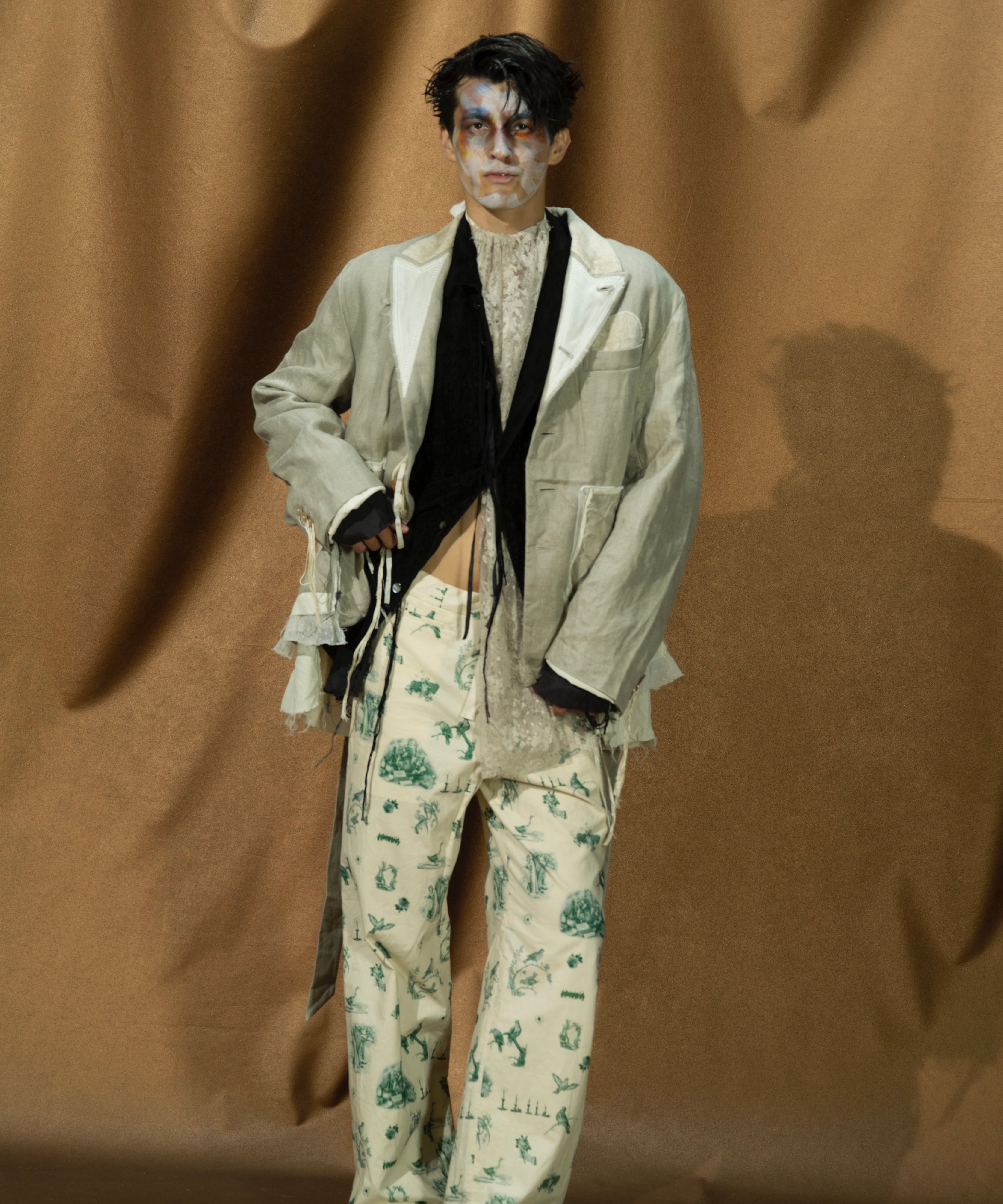 緑川氏のアーティザナルな思考を反映したウェアには、リボンテープや、袖や裾からはみ出る生地といったデコラティブなディテールが施されている。