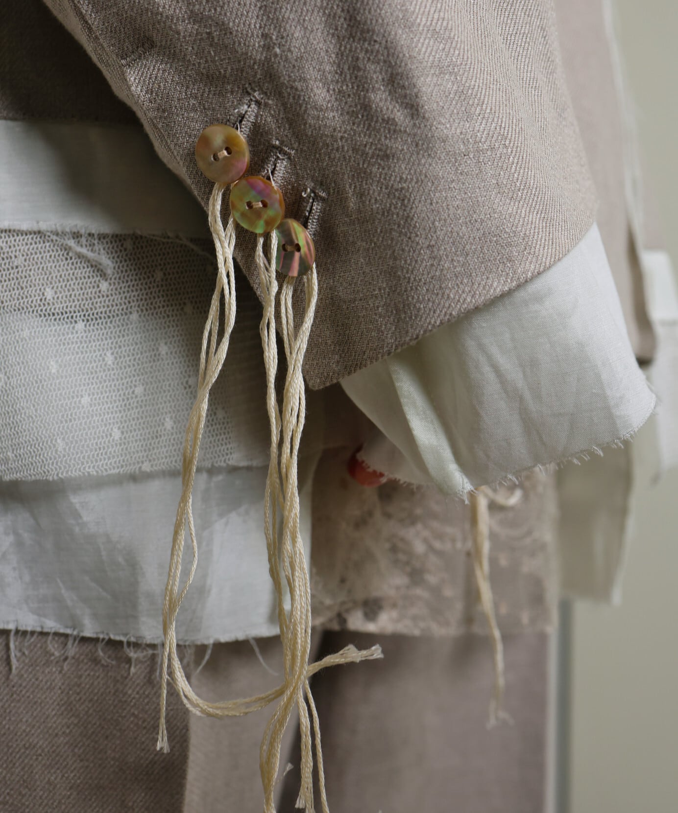 ボタンは全てシェルボタンを使用し、そこから垂れる長めの糸がさりげない動きを演出。
