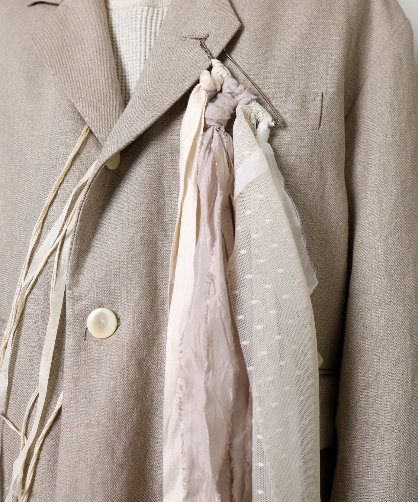 こうした装飾は、紳士服のベースを踏まえた上であしらわれており、今までに感じたことの無い新鮮な表情や、ハンガーに吊るされているだけなのに感じられる独創的な佇まいが魅力です。