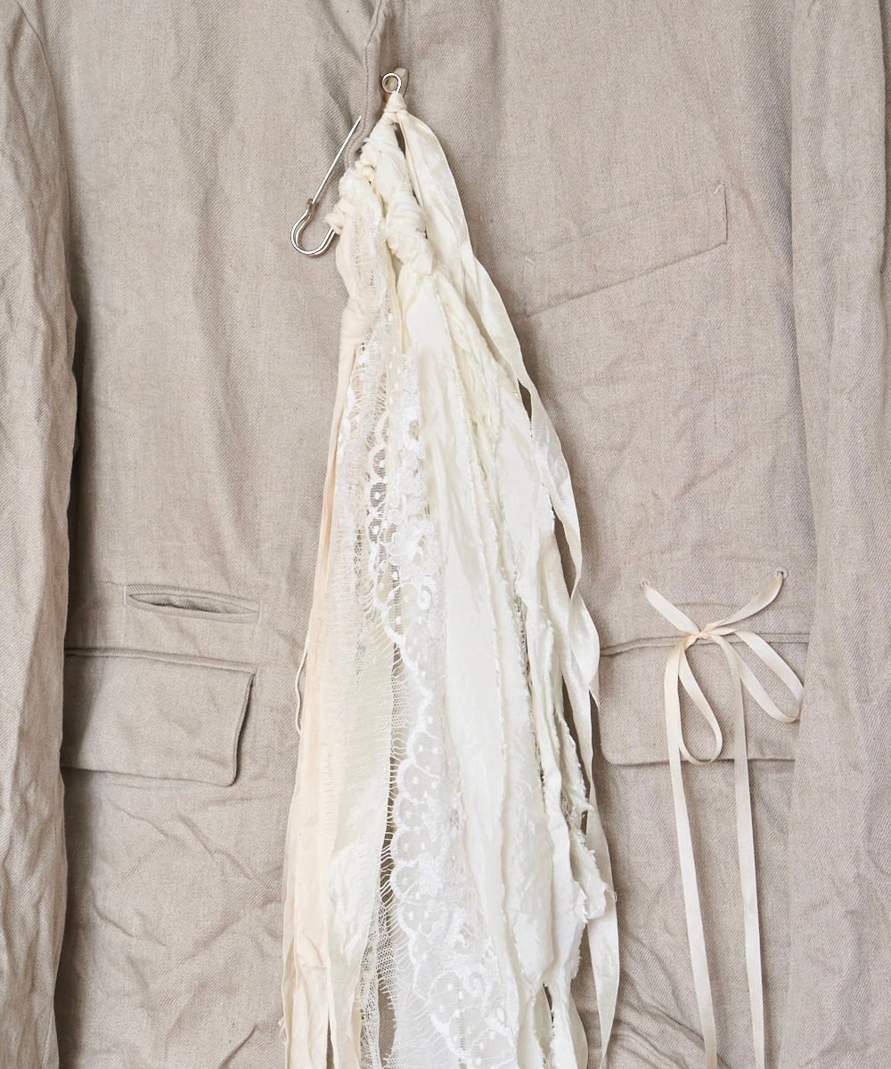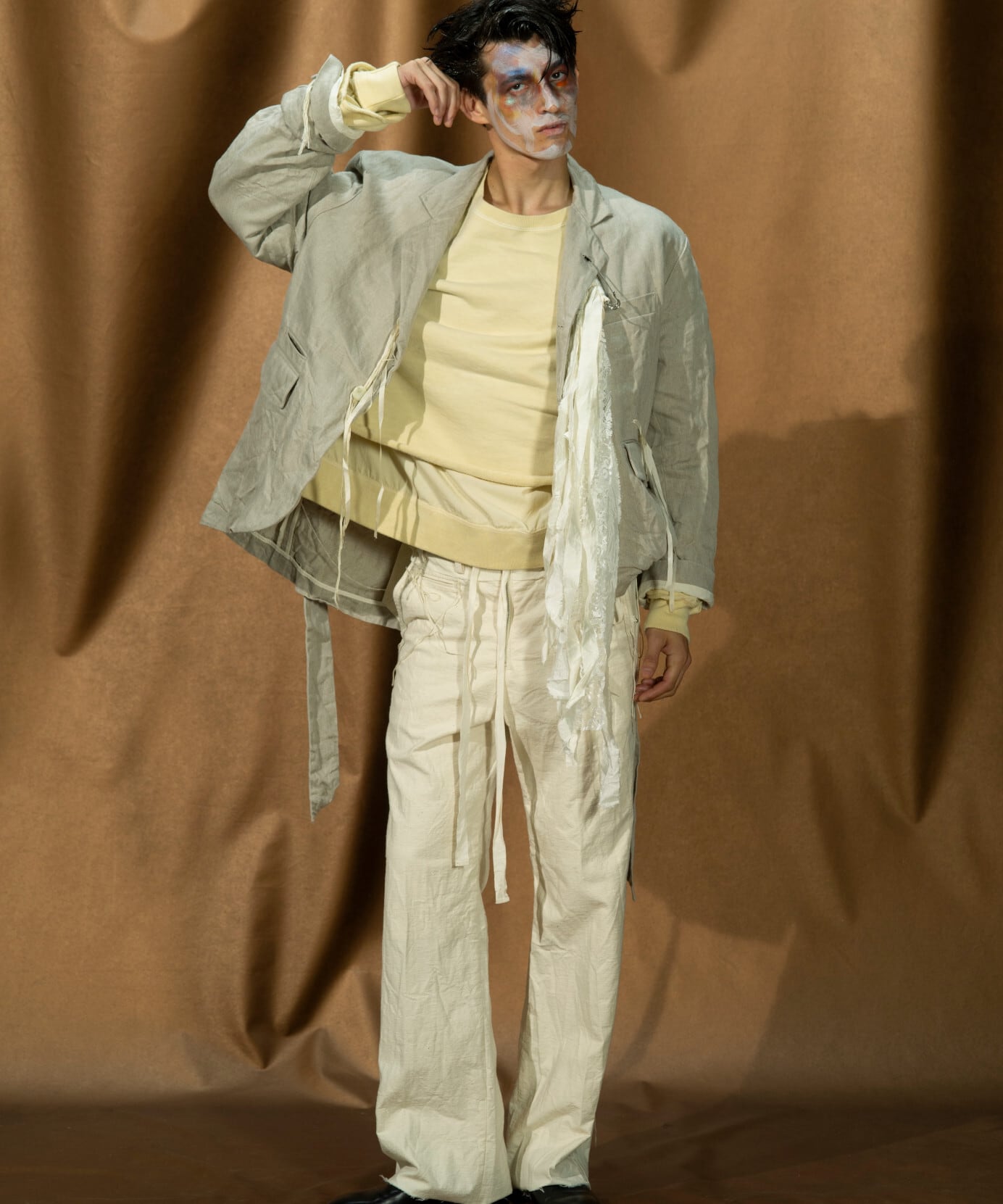 緑川氏のアーティザナルな思考を反映したウェアには、リボンテープや、袖や裾からはみ出る生地といったデコラティブなディテールが施されている。