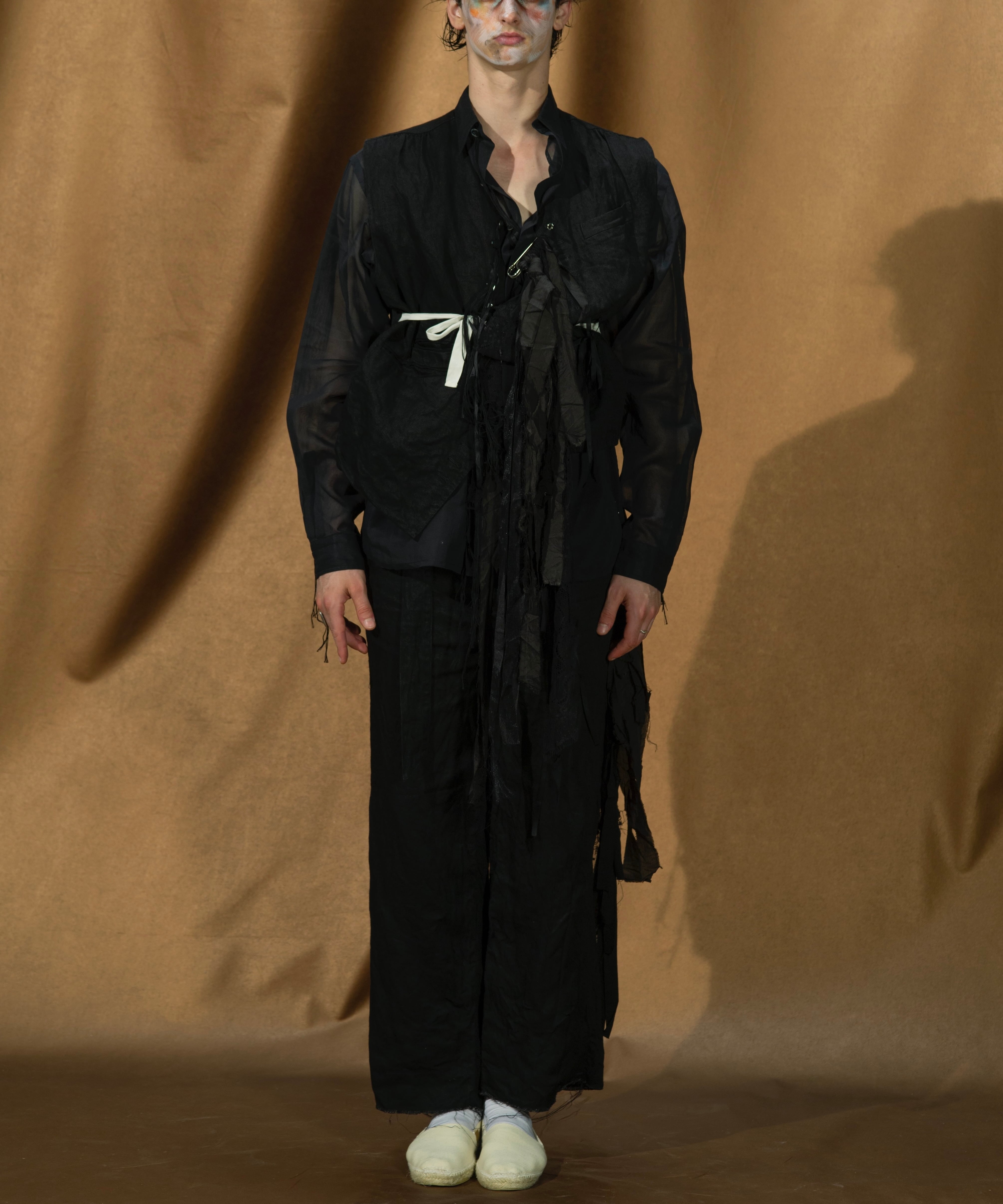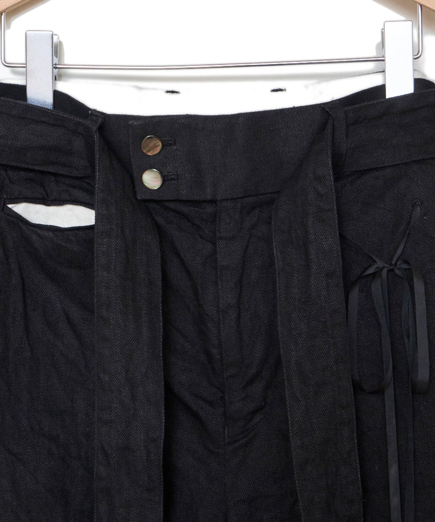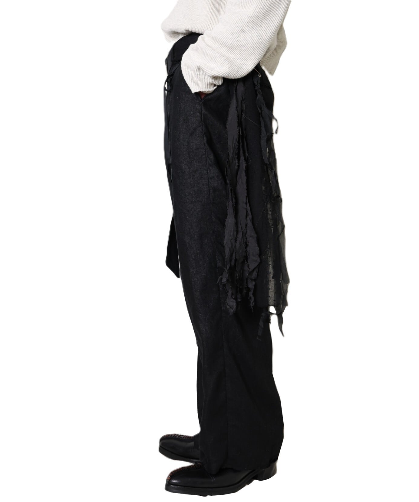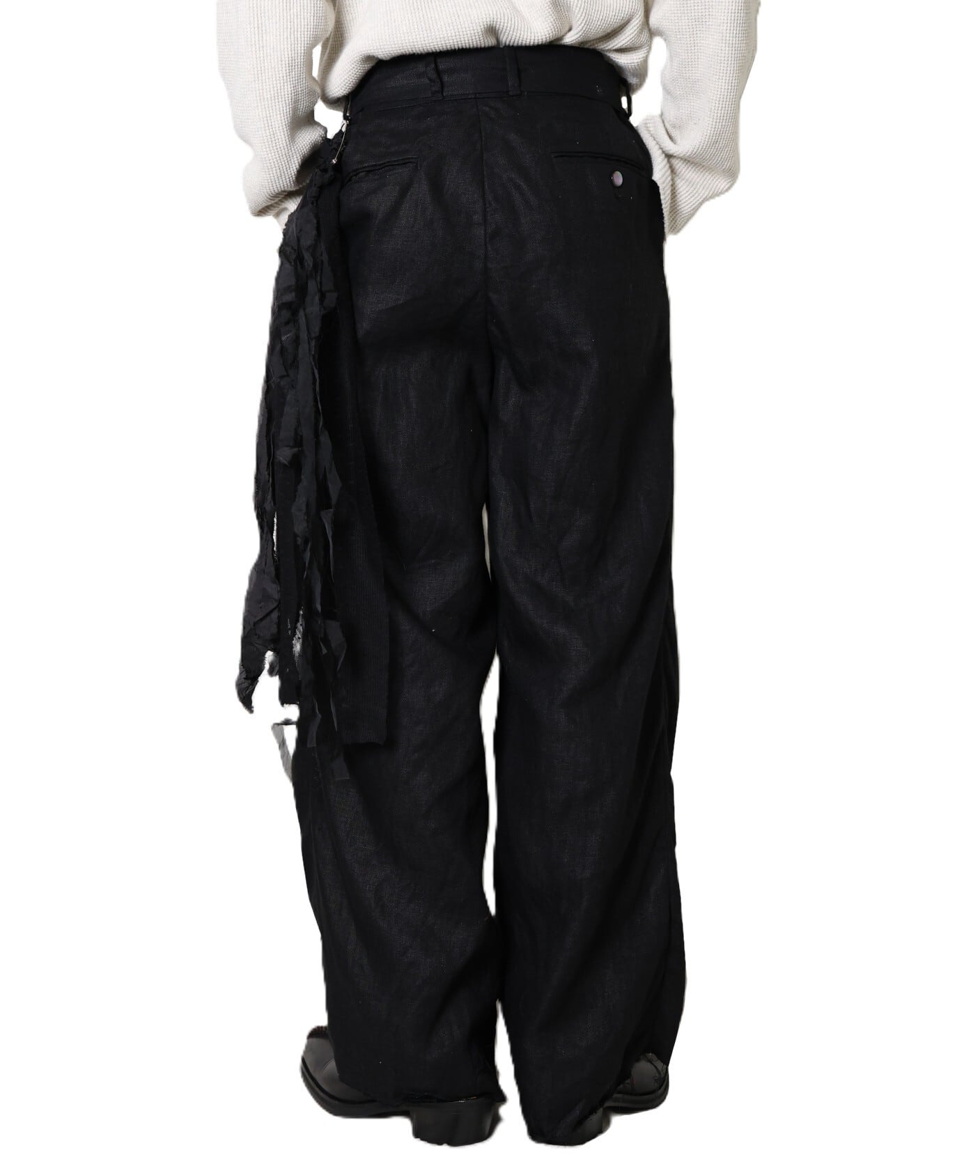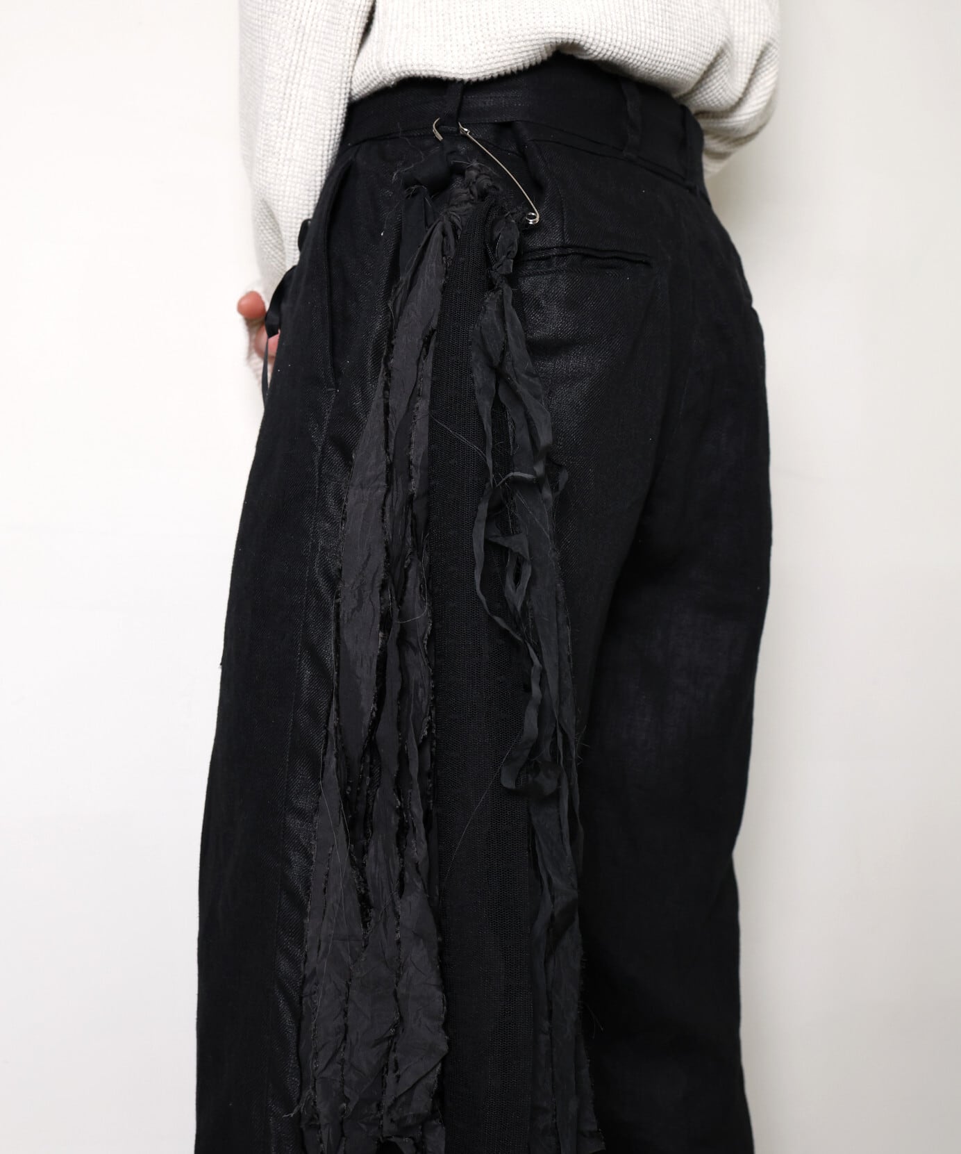 緑川氏のアーティザナルな思考を反映したウェアには、リボンテープや、袖や裾からはみ出る生地といったデコラティブなディテールが施されている。