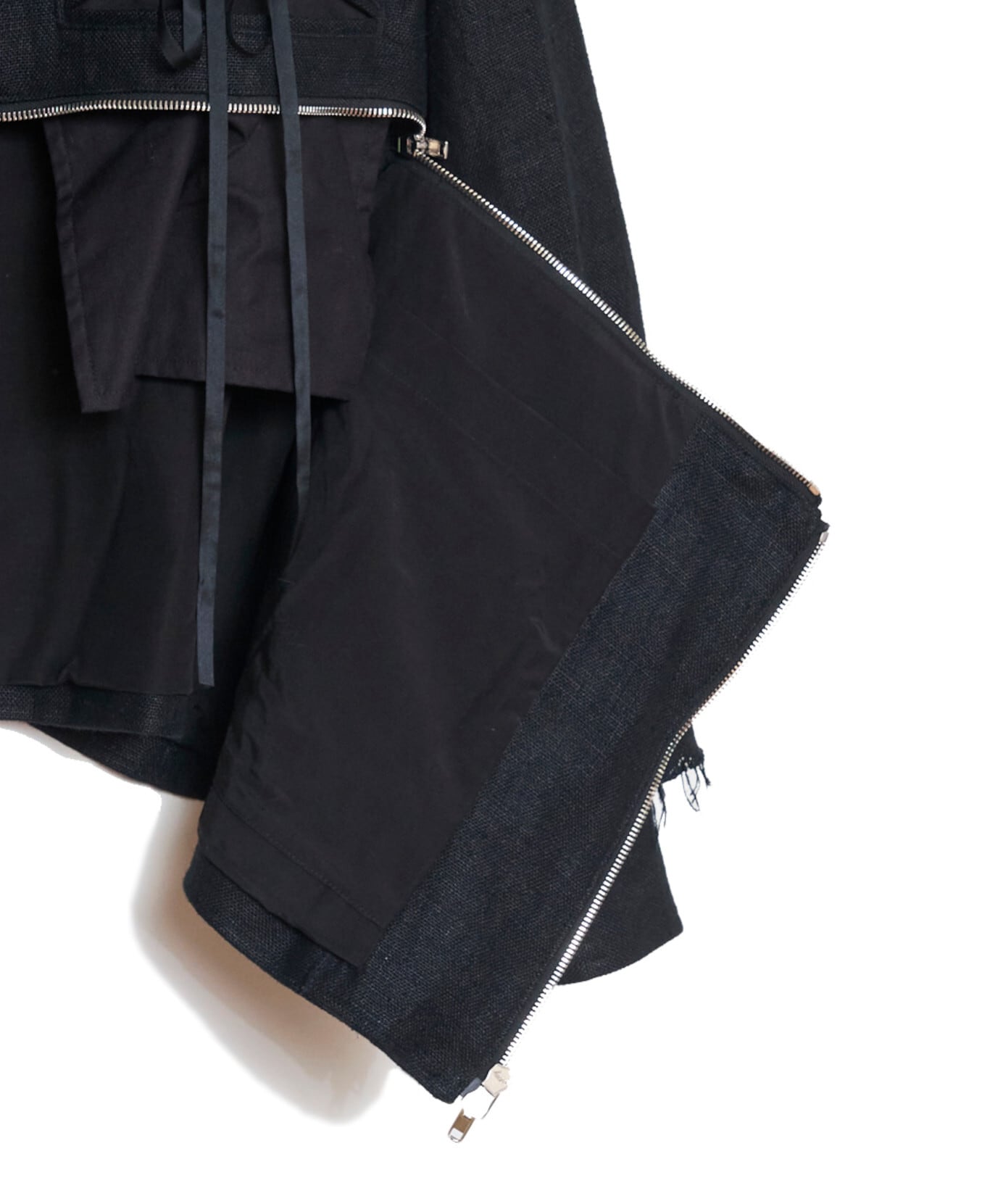 クロスジップ下部と左右のジップを開けることで、ポケット裏の生地が見える仕様になっており、着方によって異なる表情を楽しめます。上下のジップはダブルジップ仕様で、シルエットの調整も自在です。襟元にはボタンが付き、トップまで留めることも可能。