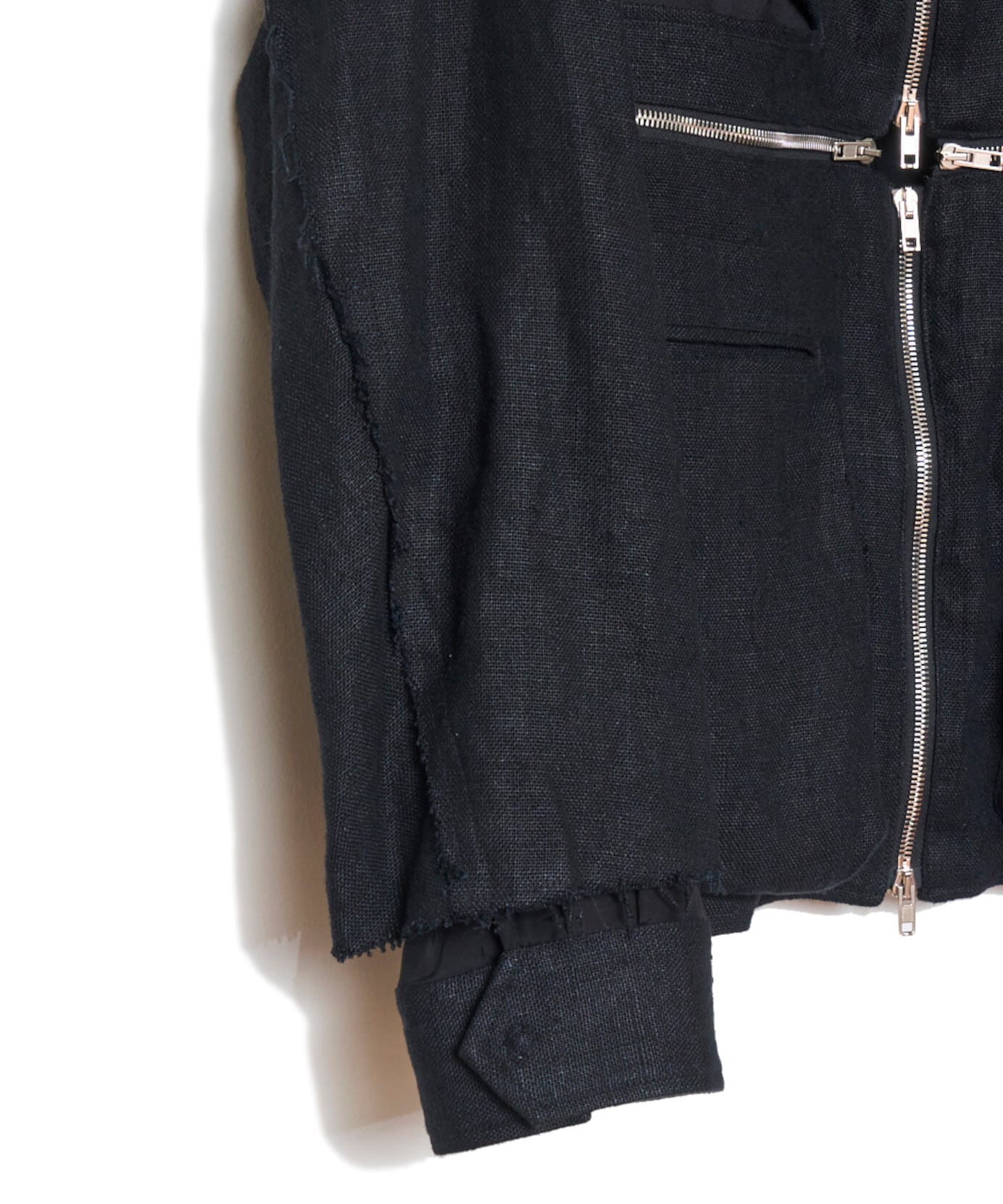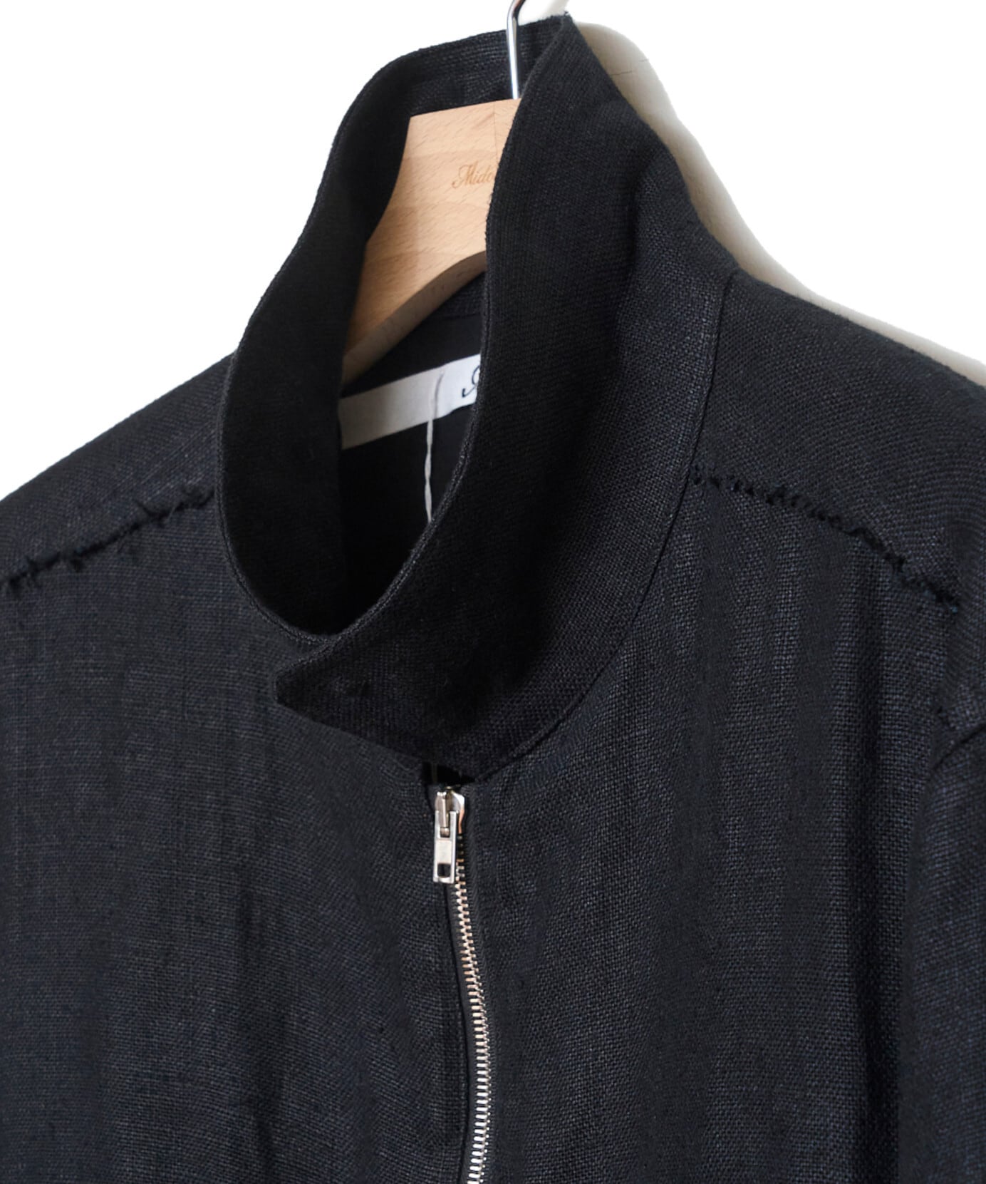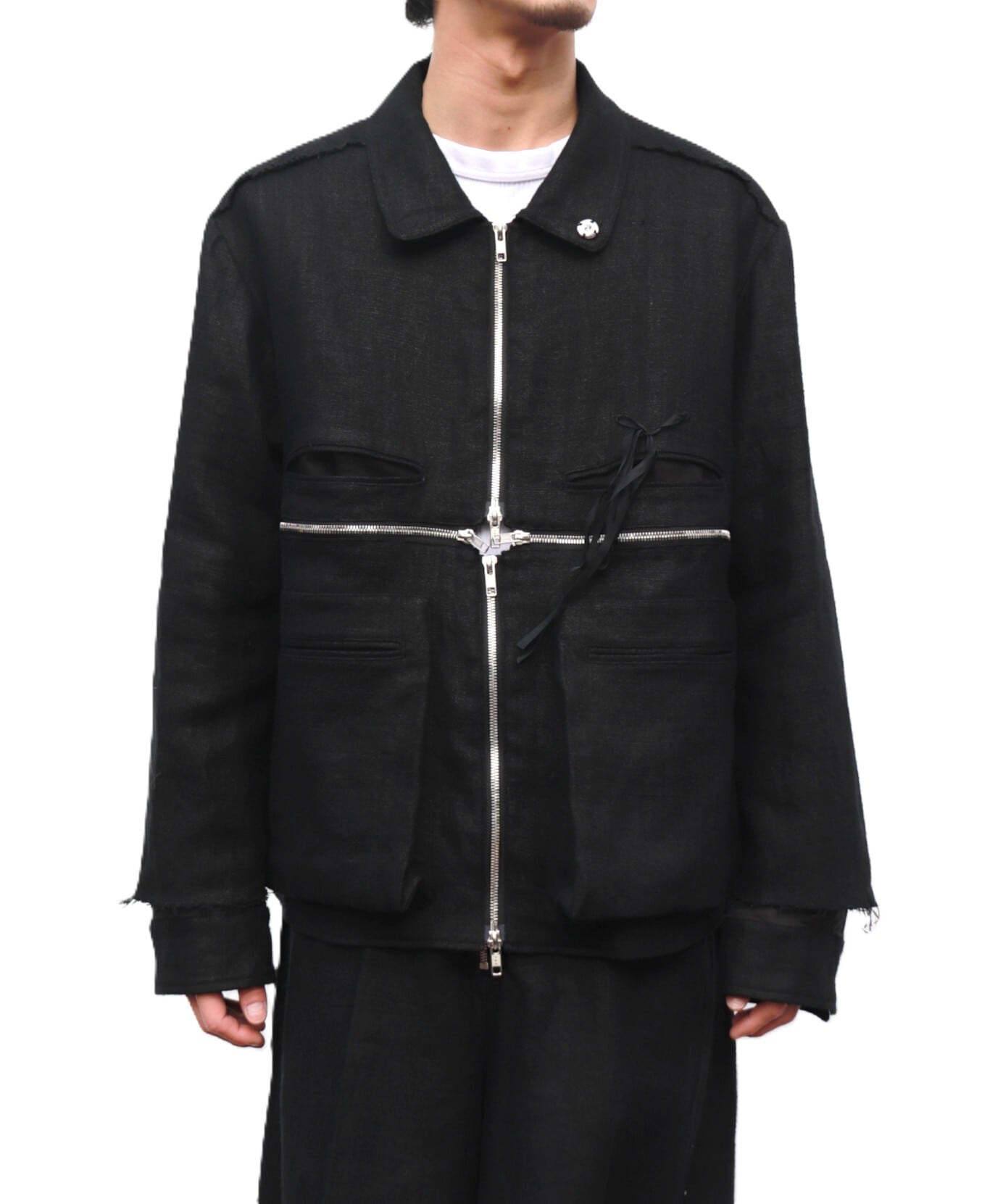 Midorikawaの中ではレーステープ等の装飾を抑えた一着ですが、正面のジップ使いや隠れたギミック、袖や肩のカットオフ加工など、細かな部分にブランドらしさがしっかりと詰まったブルゾンです。