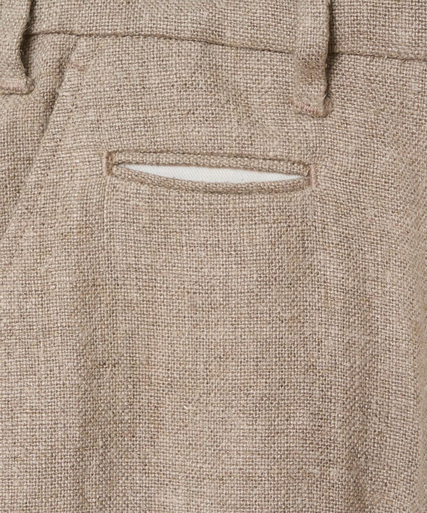 厚手のリネン生地を使用しており、リネンならではの表情と風合いをしっかり楽しめます。履き込むほどに生地がくたっと馴染み、表情の変化も楽しめる一本です。