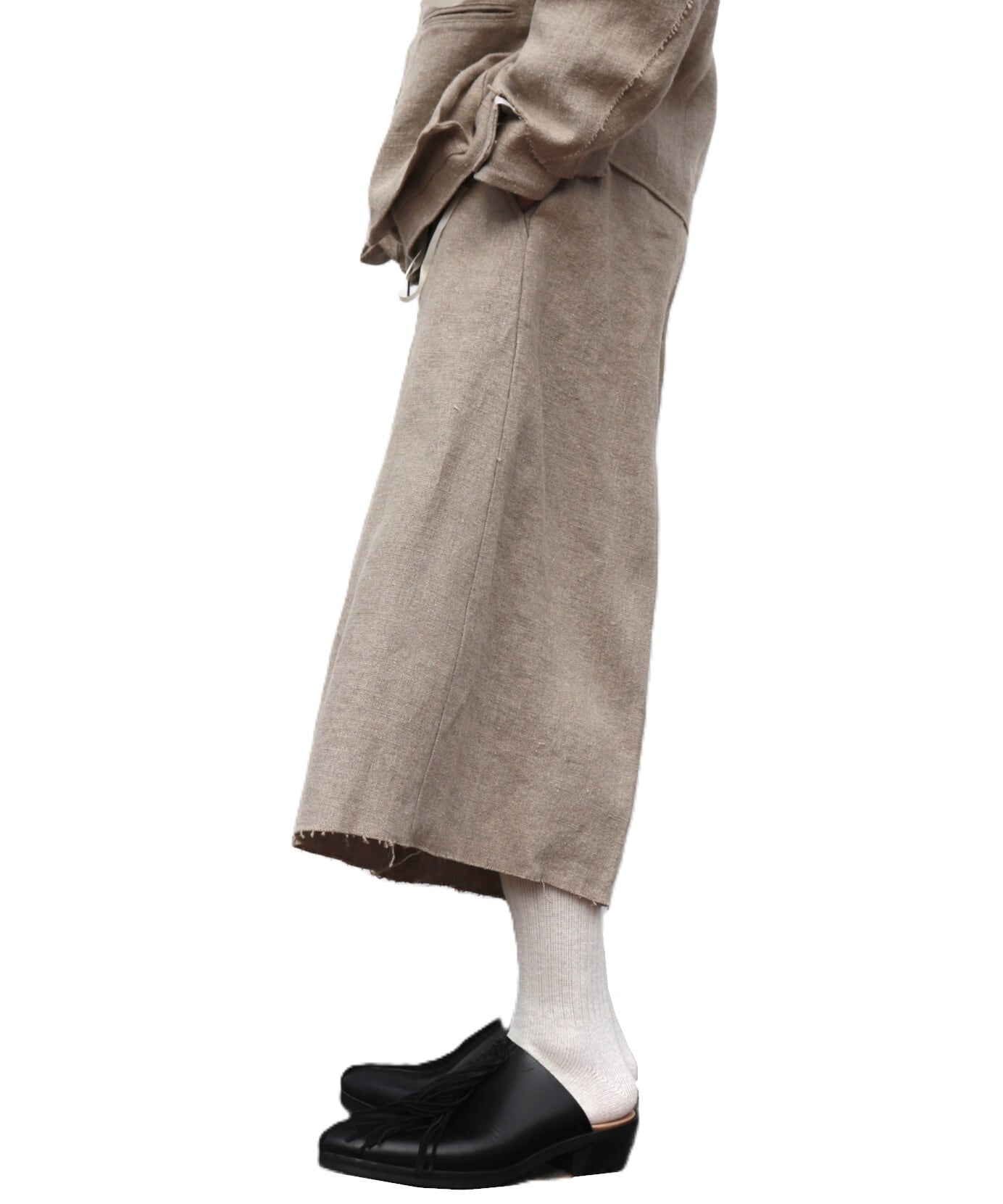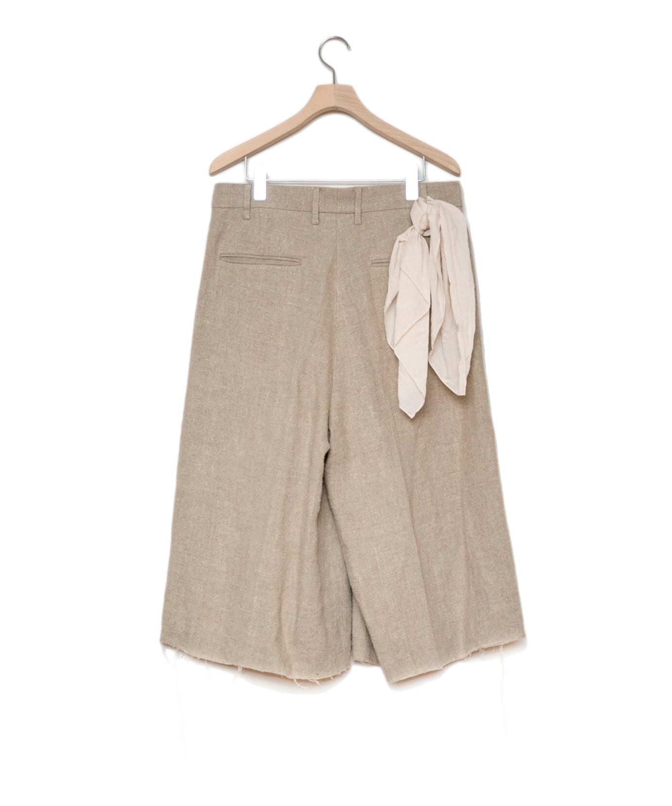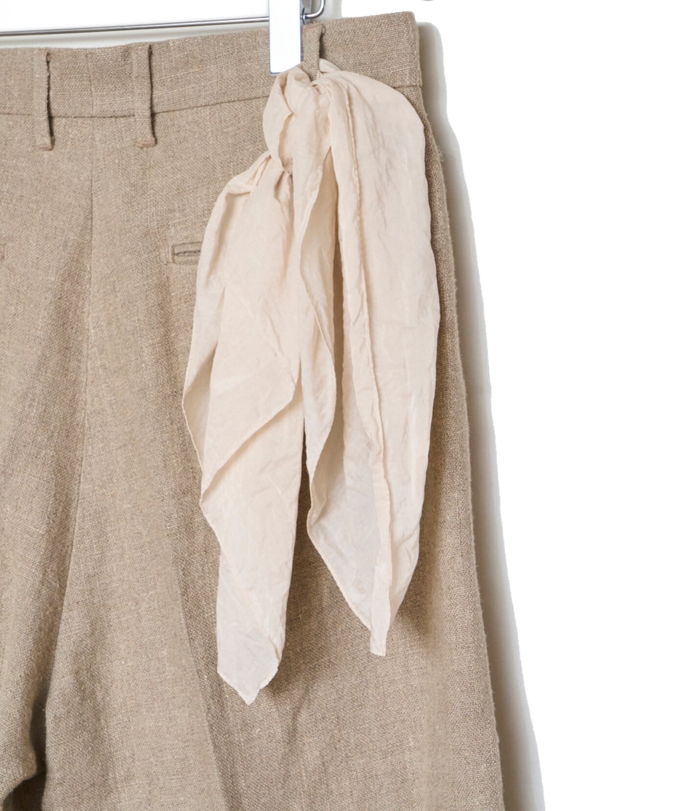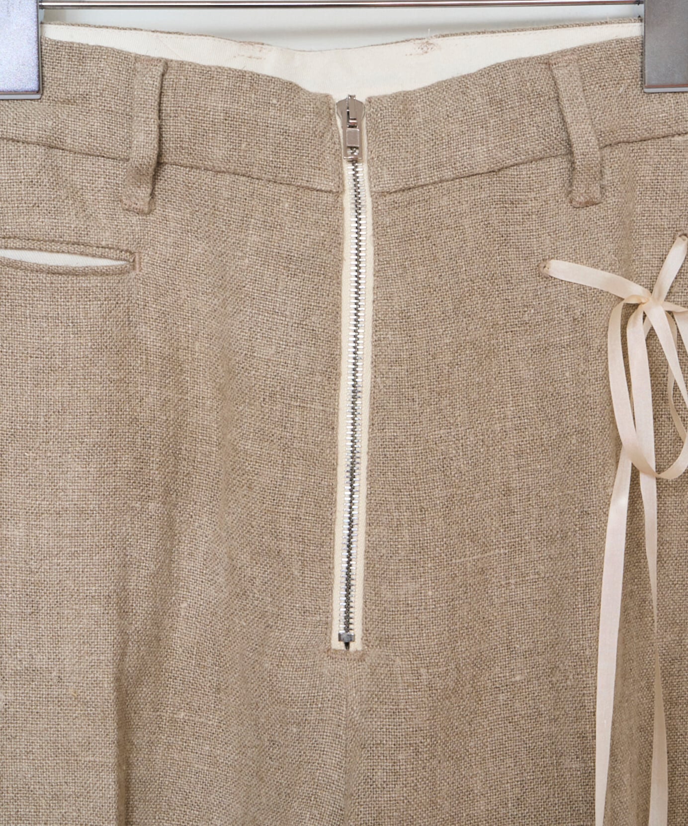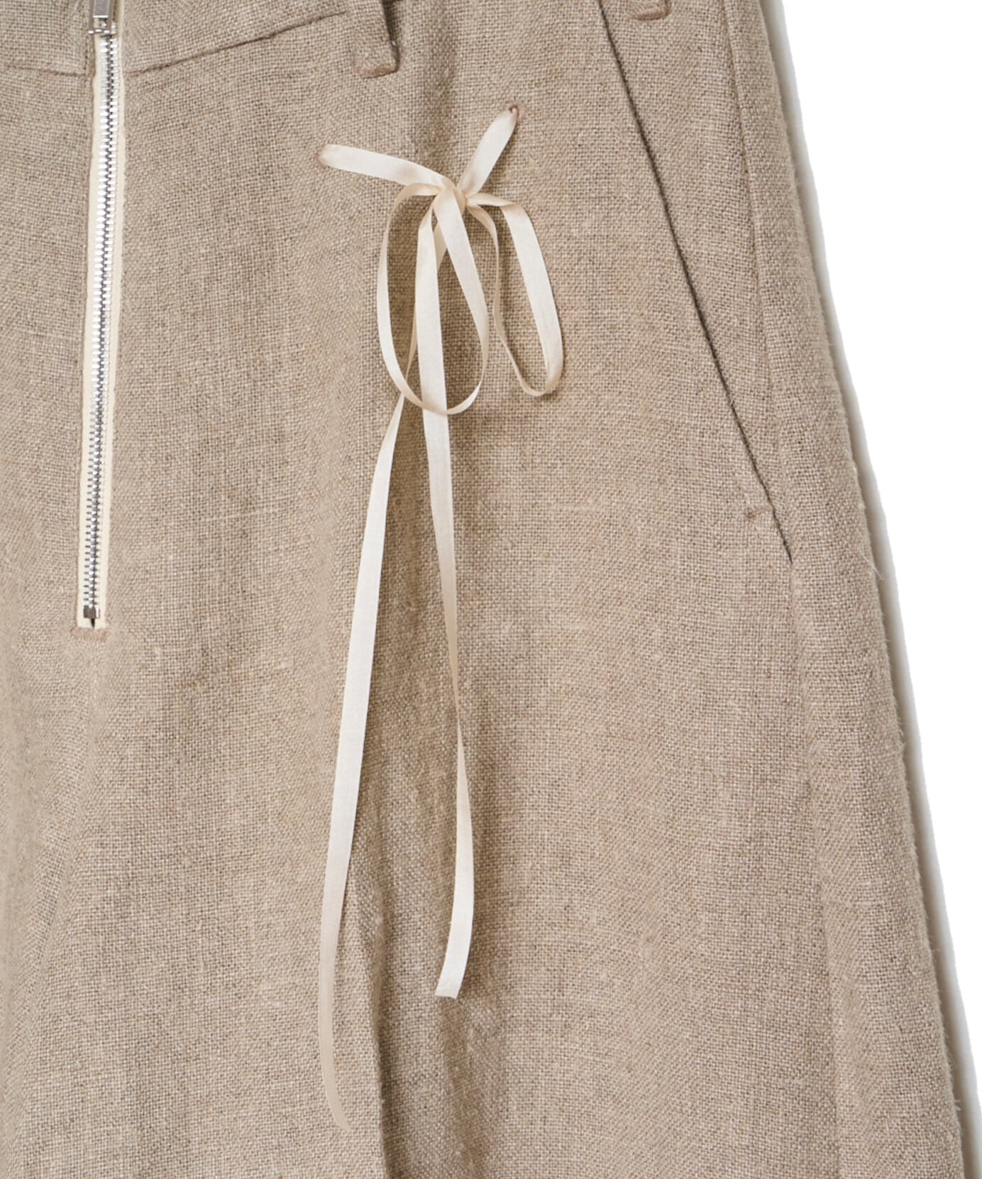 Midorikawaの中では装飾を控えめにしたデザインですが、ベルトループに付いたスカーフや、存在感のあるフロントジップとコインポケット、さりげなくあしらわれたレーステープが上品さを添えています。一見ストリート感のある丈感ながら、リネン生地の光沢と高級感、さりげないセンタープレス、裾のカットオフ加工によって、エレガントな印象に仕上がっています。
