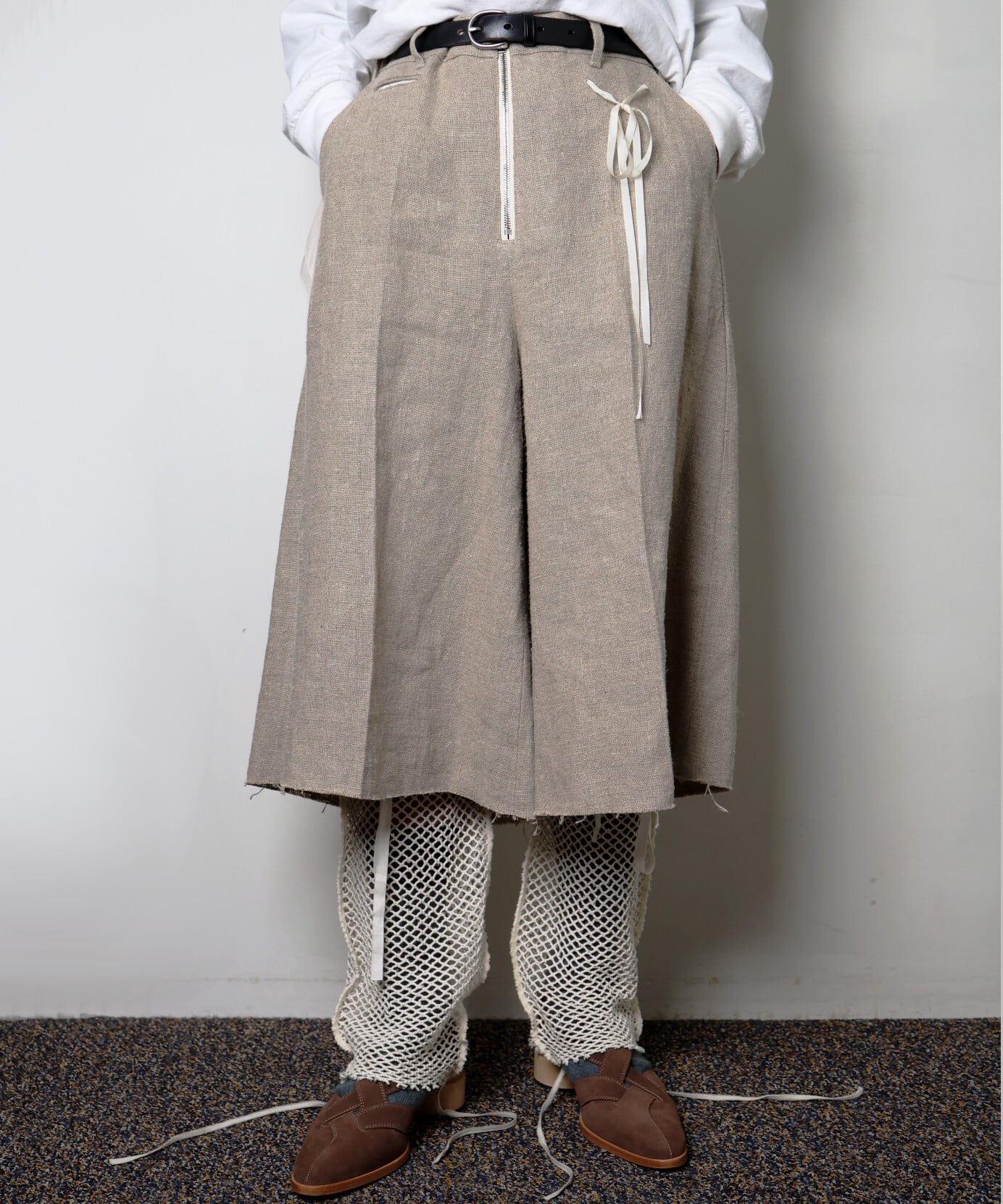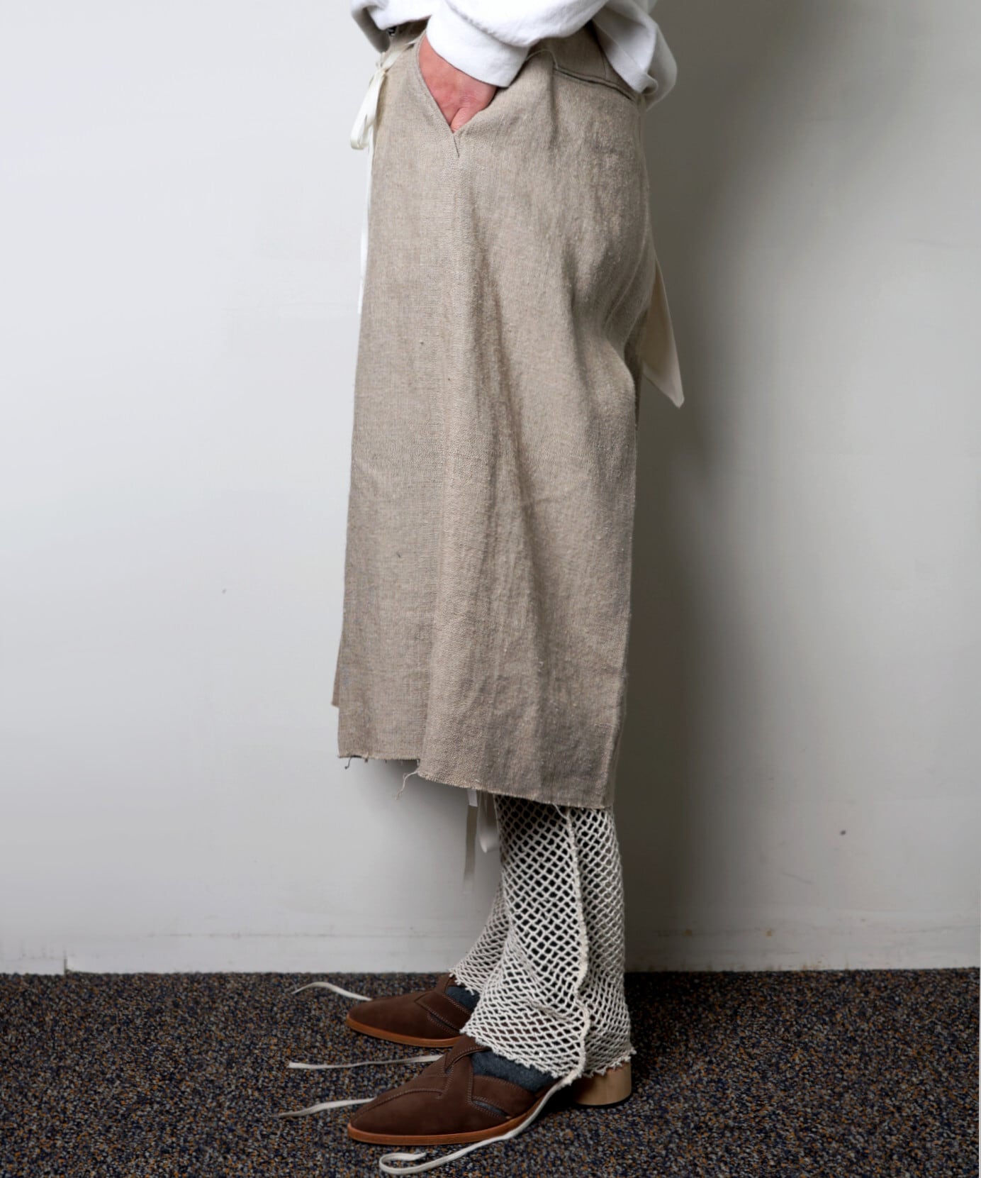 表情のあるリネン素材なので、カットソー合わせよりもシャツやベストなど、少しドレス寄りのアイテムとの相性が良い印象です。
