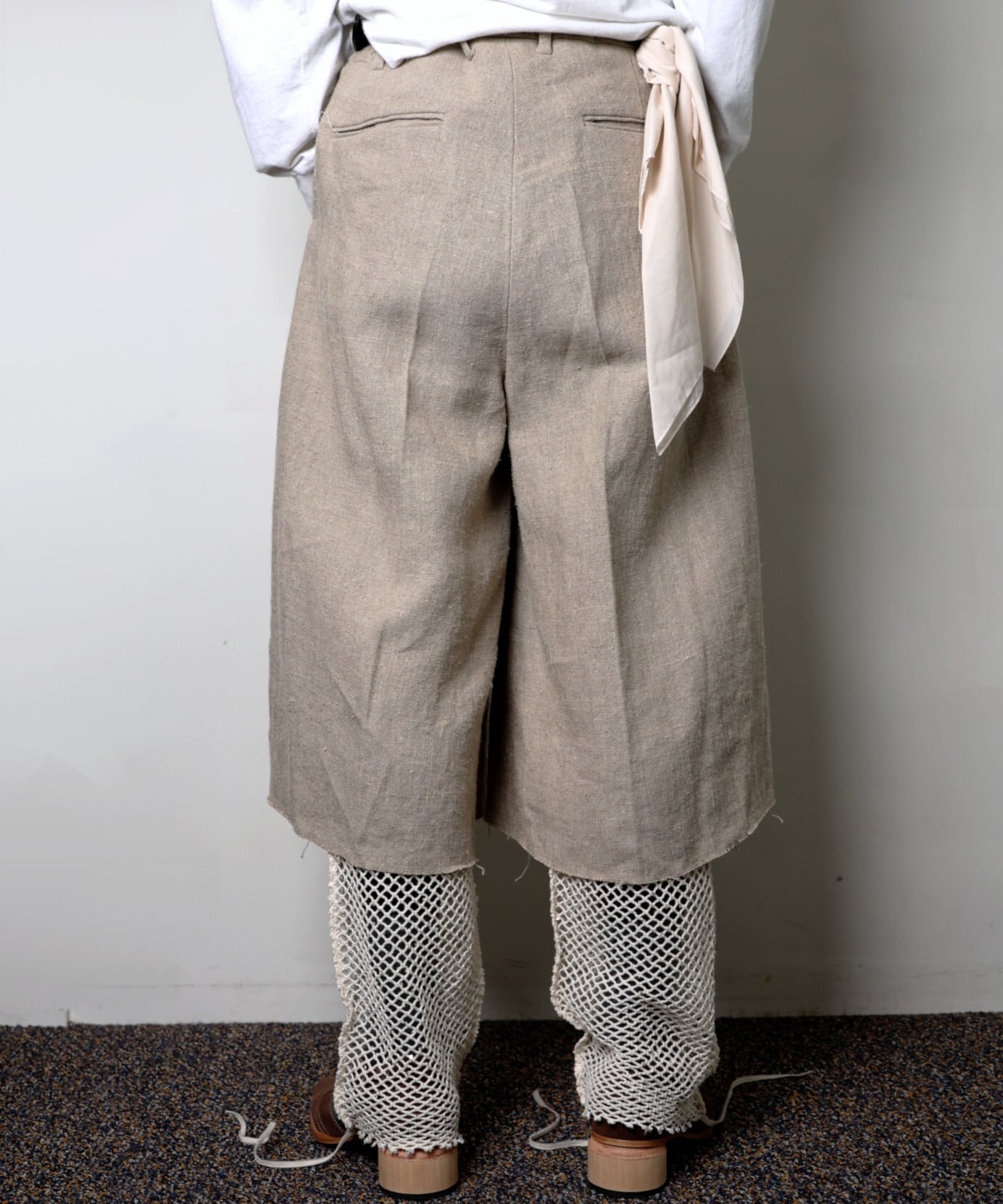 リネンの光沢、センタープレス、カットオフのニュアンスが重なり、