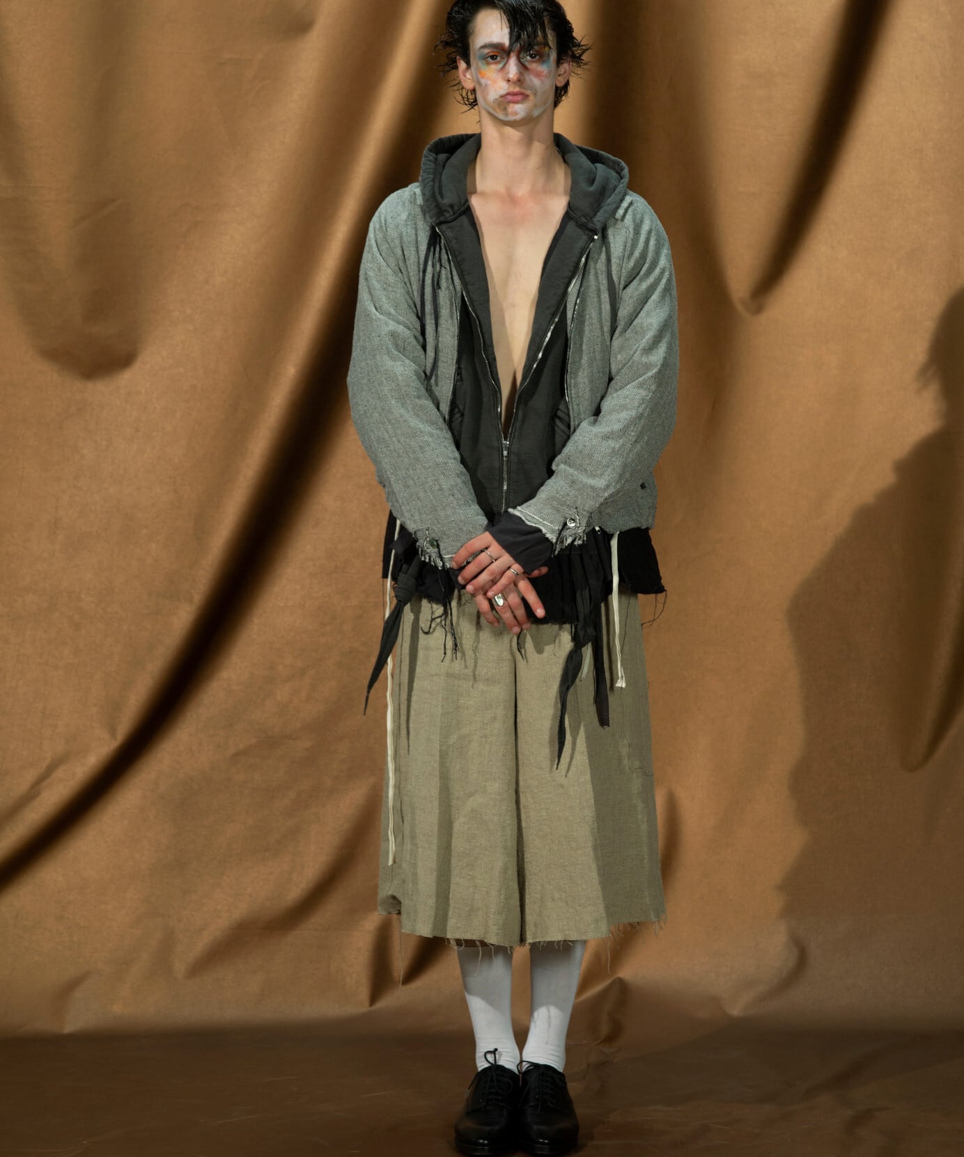 緑川氏のアーティザナルな思考を反映したウェアには、リボンテープや、袖や裾からはみ出る生地といったデコラティブなディテールが施されている。