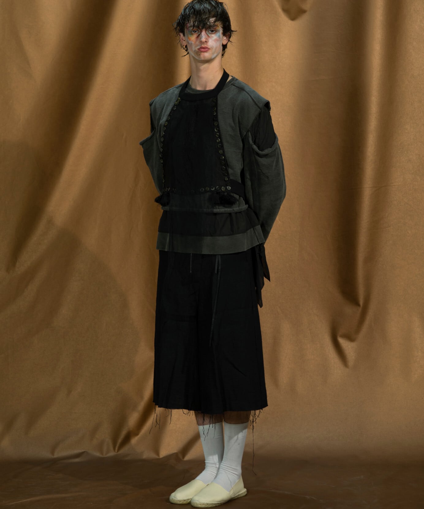 緑川氏のアーティザナルな思考を反映したウェアには、リボンテープや、袖や裾からはみ出る生地といったデコラティブなディテールが施されている。