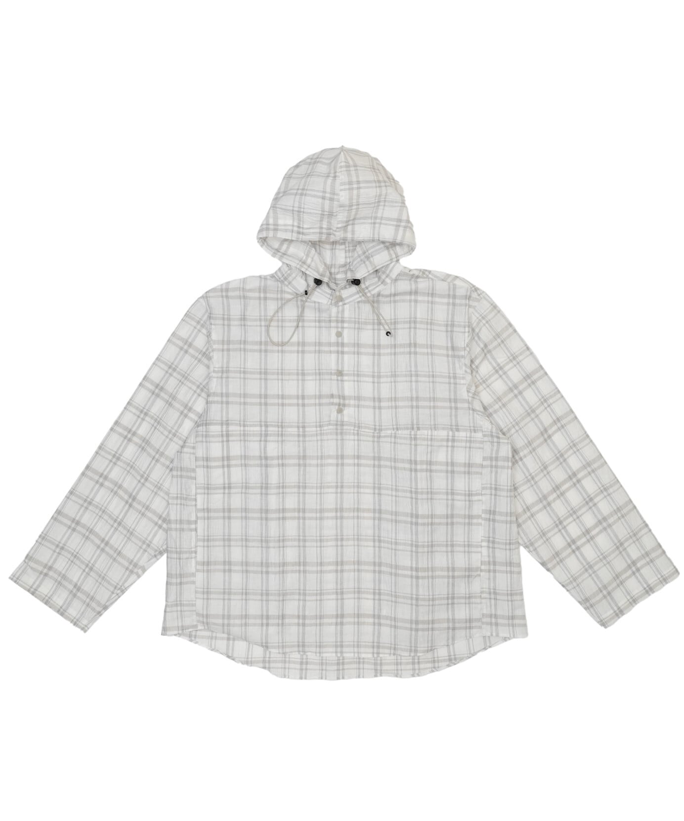 リネン・コットン・ポリエステルの糸を組み合わせた生地で仕立てた、プルオーバータイプのフーディーシャツ。