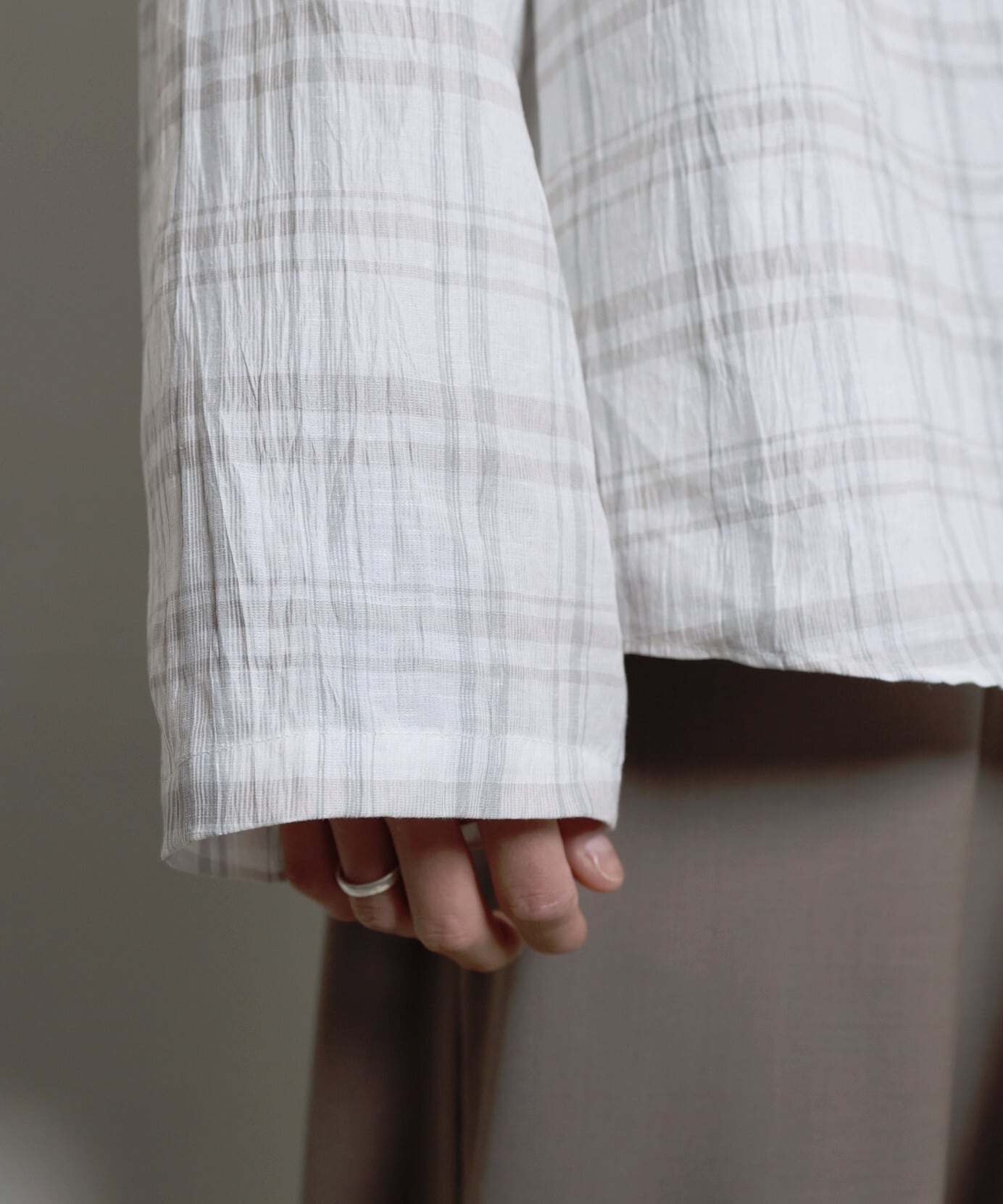 タテジワ加工による独特の表面感と清涼感があり、春夏の空気に自然と馴染む一枚です。