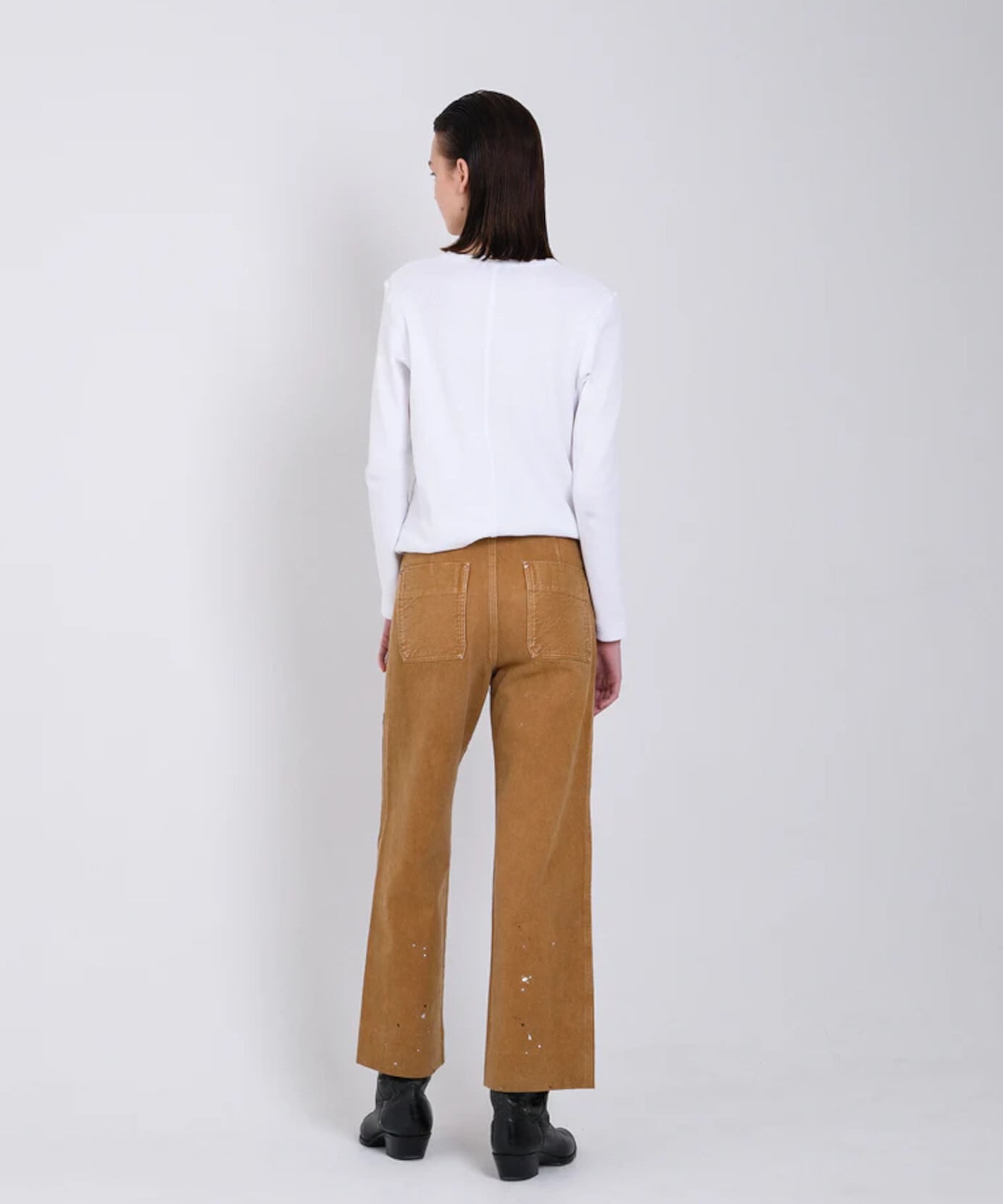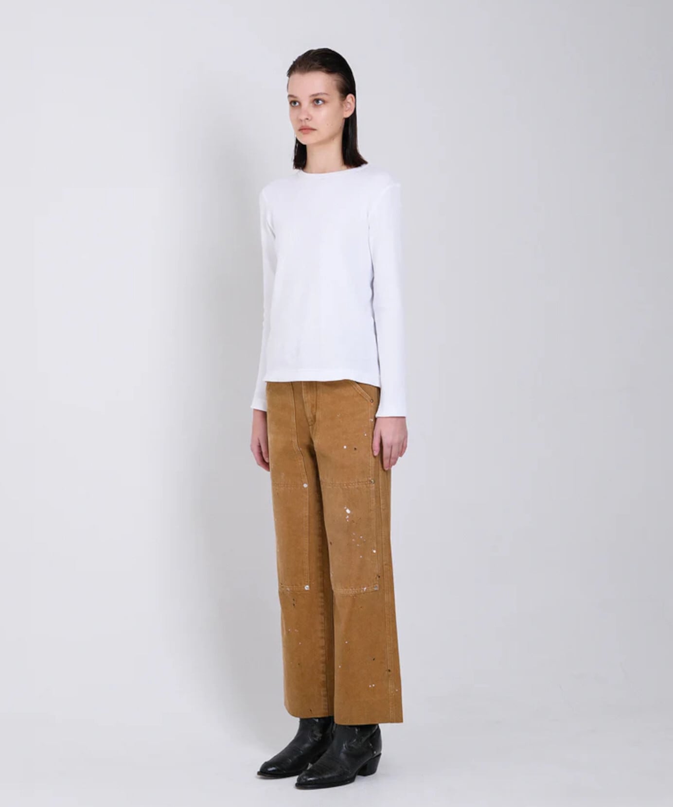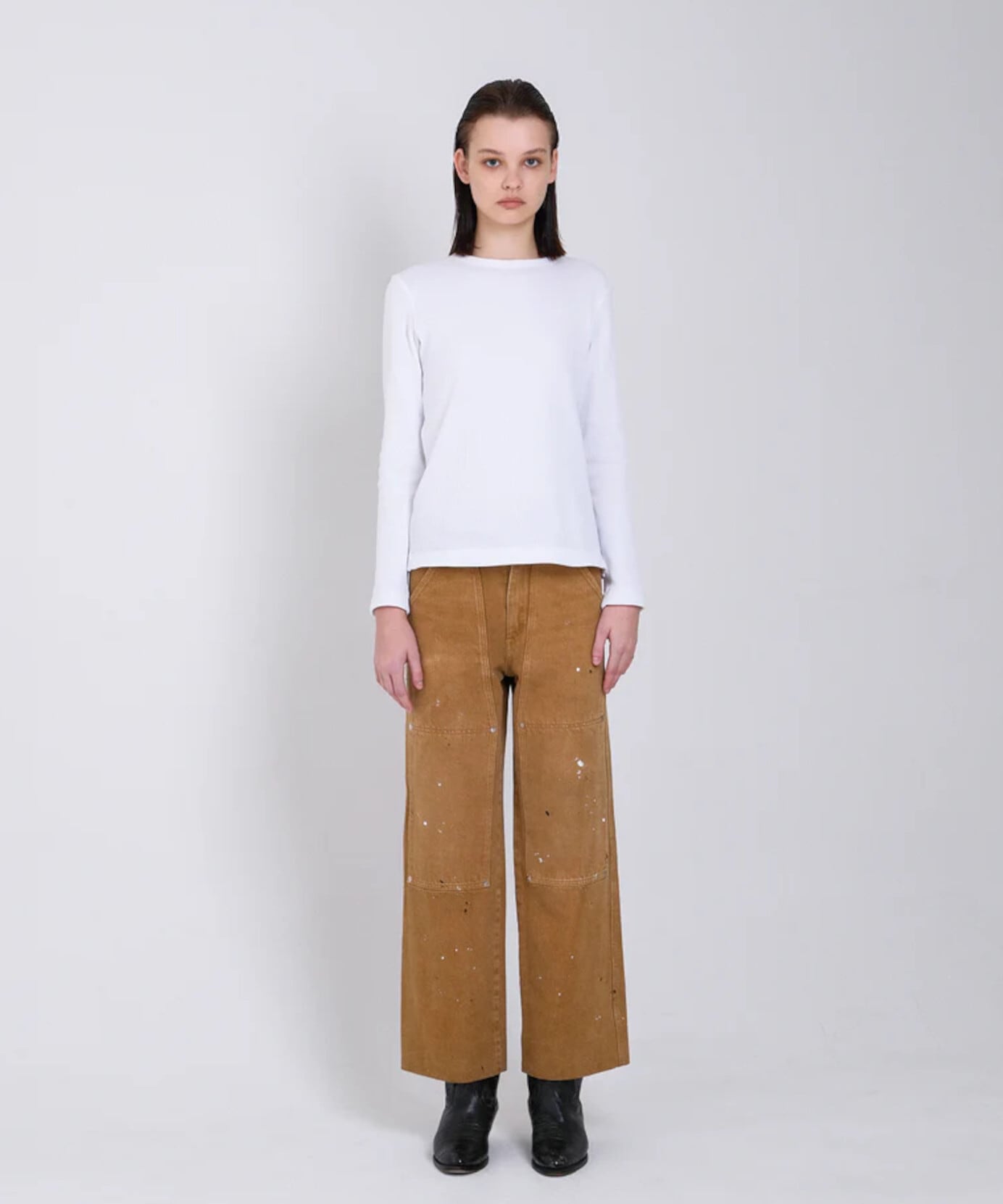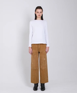 TANAKAのシグネチャーデニム生地の一つでもあるカイハラ社製の無染色のセルビッチローホワイトデニムを使用し、ワイドレッグとやや深めの股上でバランスの良いリラックスフィットに仕上げています。
