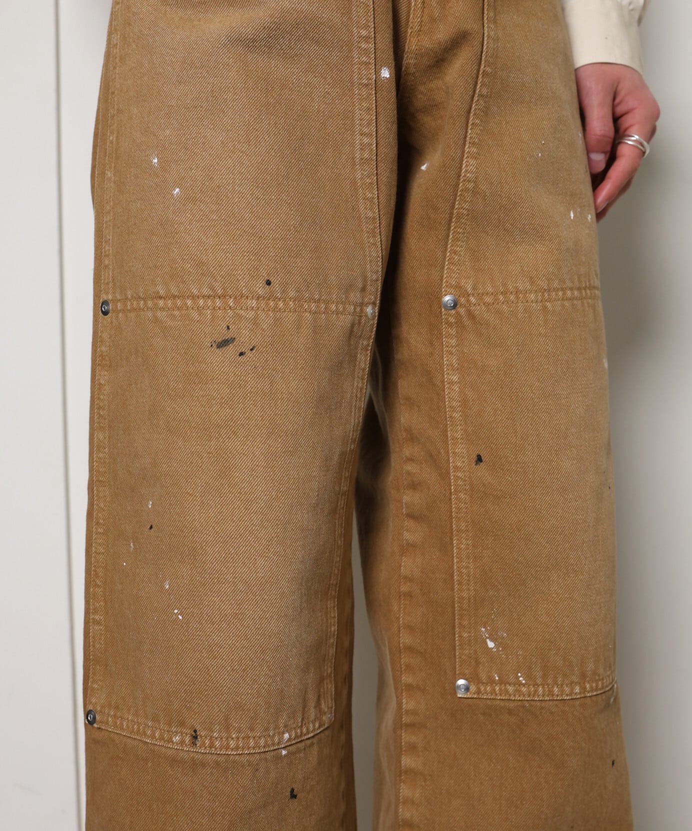 補強の為に打たれた無数のリベットや、ダブルニーのパッチはポケットも兼ね、デザインのアクセントになっています。