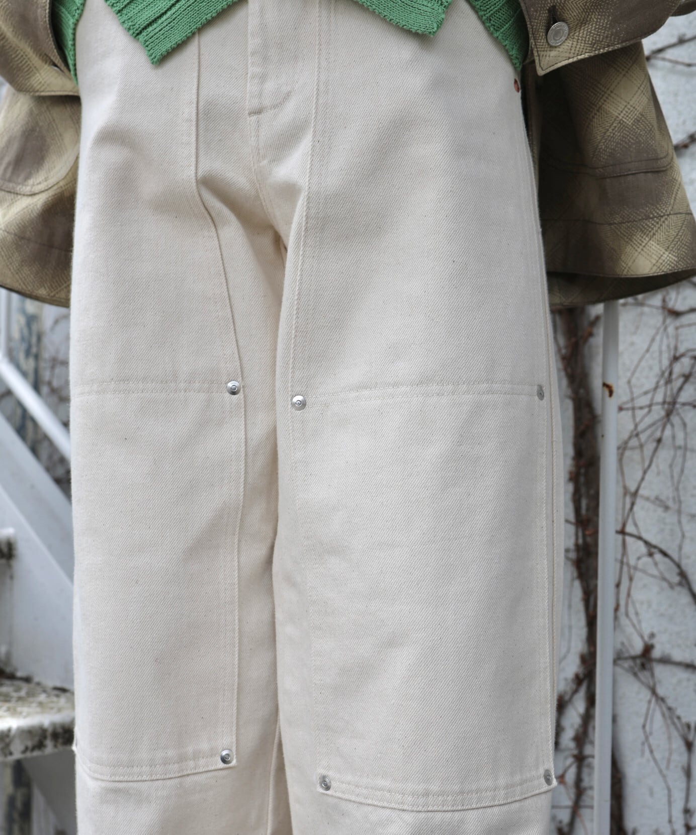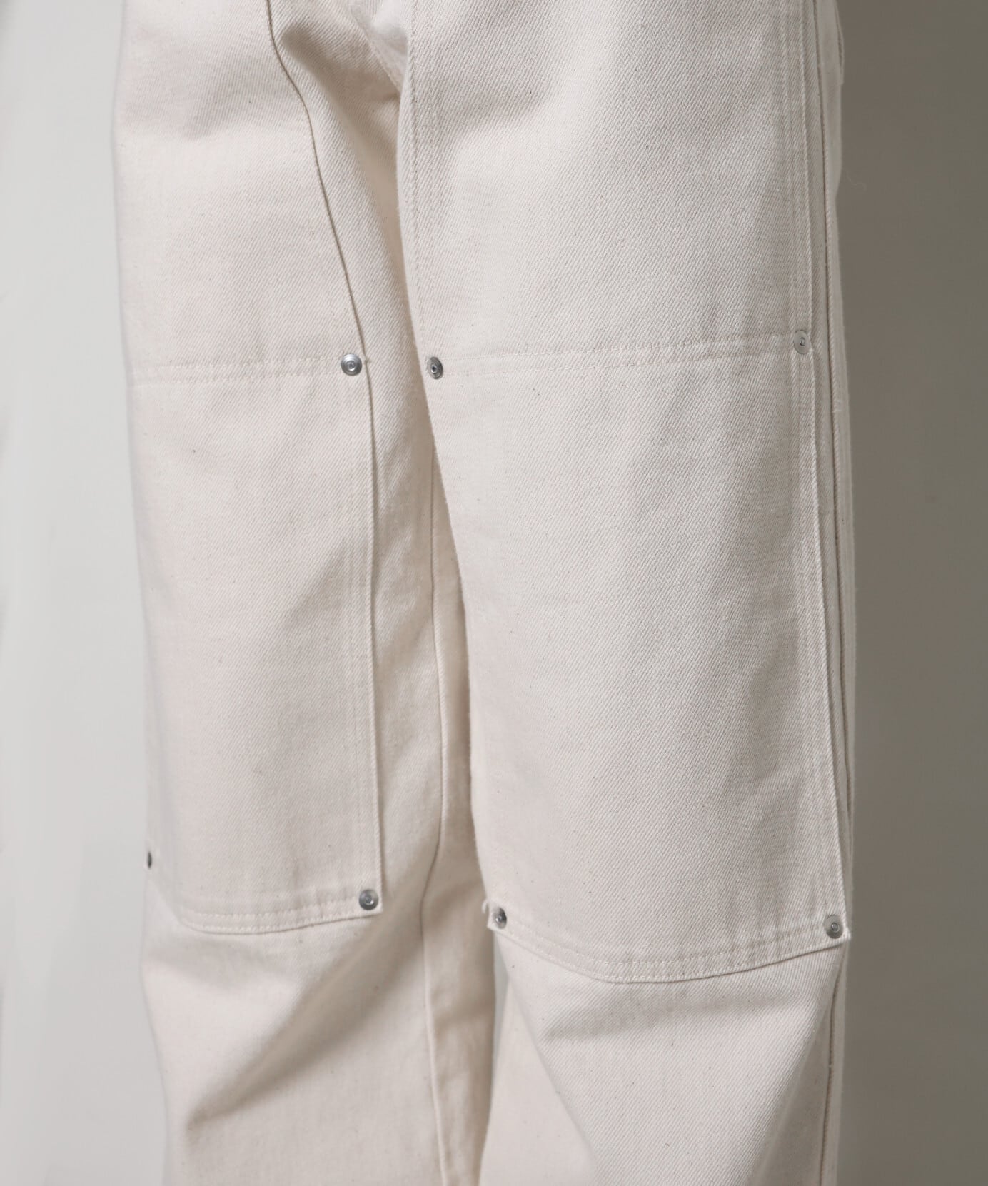 補強の為に打たれた無数のリベットや、ダブルニーのパッチはポケットも兼ね、デザインのアクセントになっています。