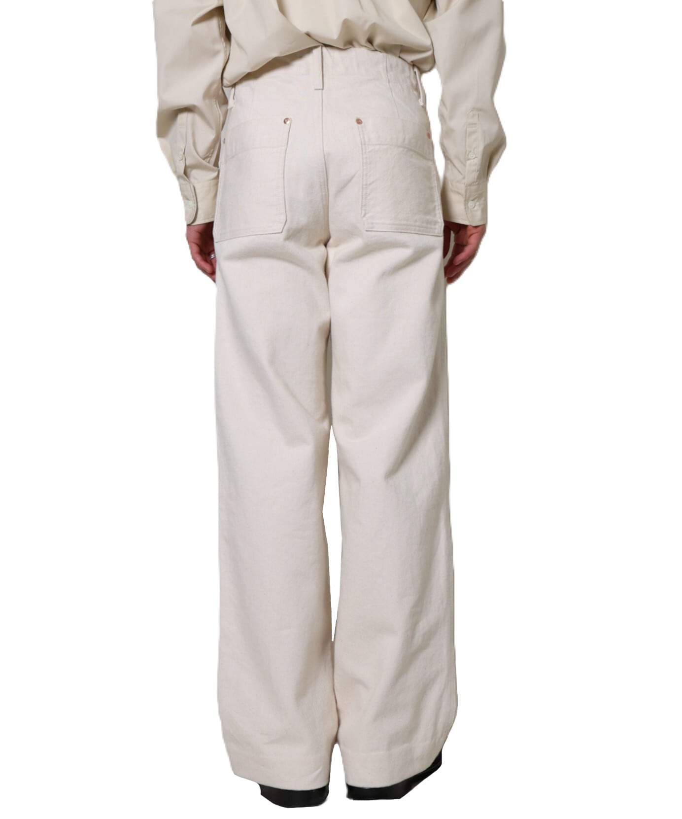 TANAKAのシグネチャーデニム生地の一つでもあるカイハラ社製の無染色のセルビッチローホワイトデニムを使用し、ワイドレッグとやや深めの股上でバランスの良いリラックスフィットに仕上げています。