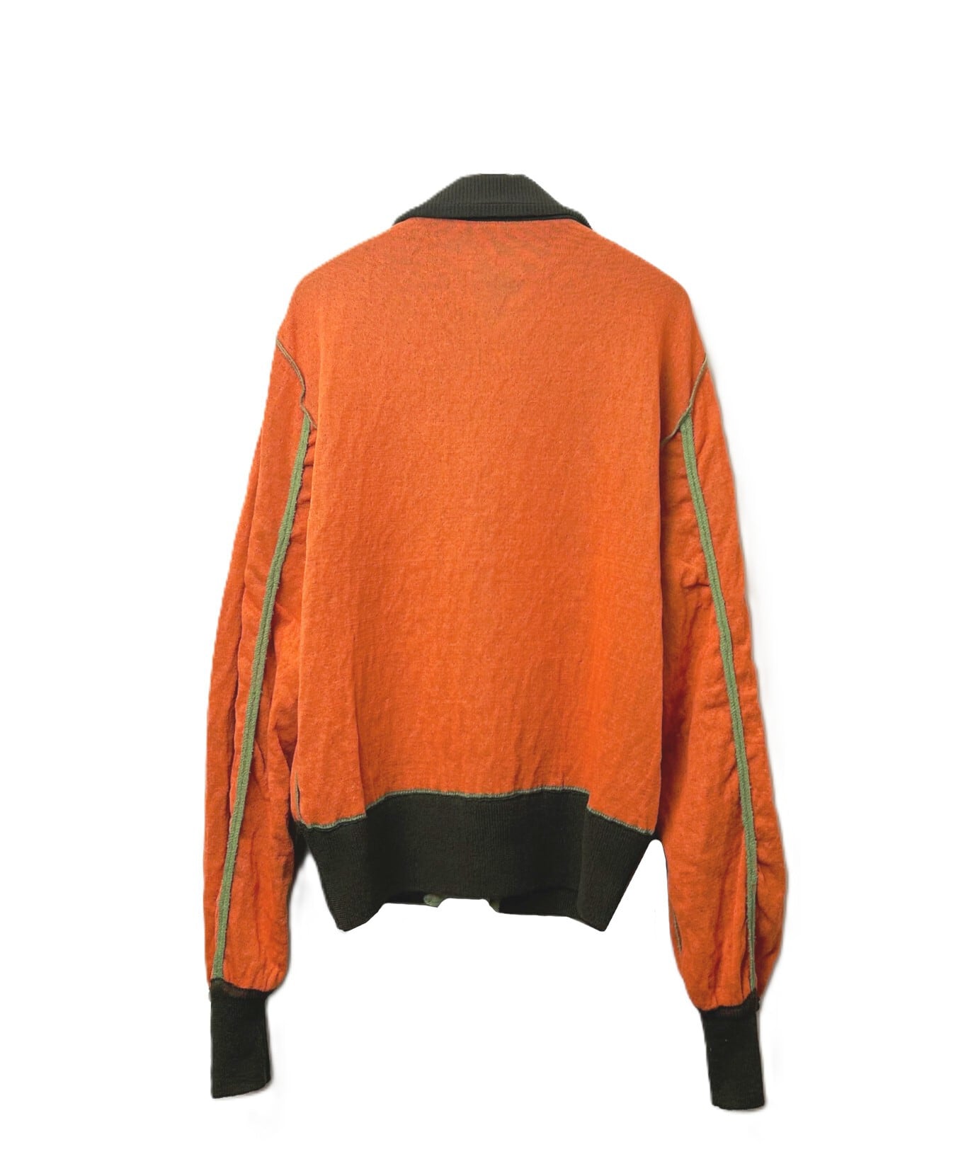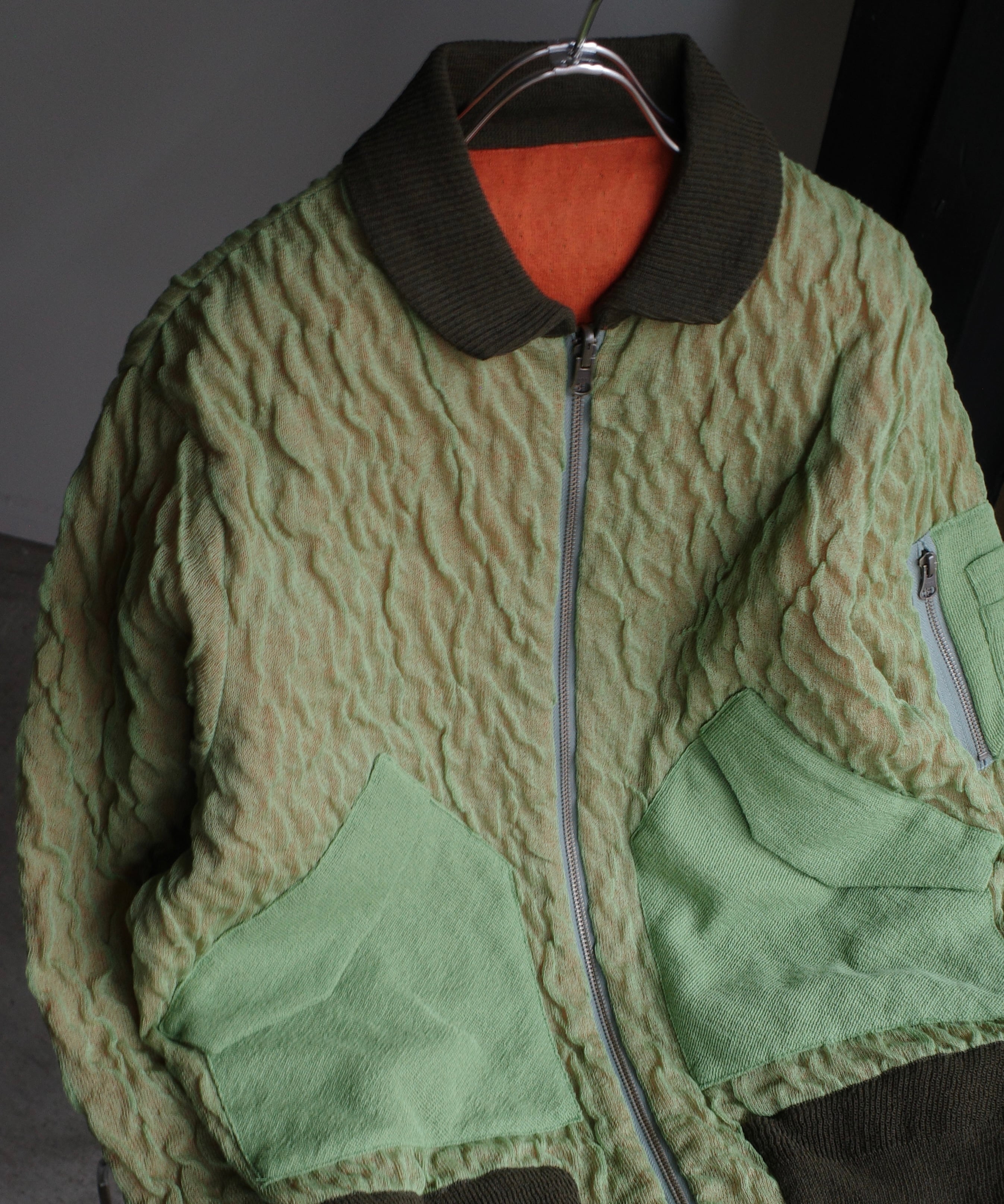 表と裏という要素を考えたときに、表側から裏側が透けているというアイディアが出てきて、裏側が透けていて面白そう思ったものがオレンジの裏地のMA-1でした。