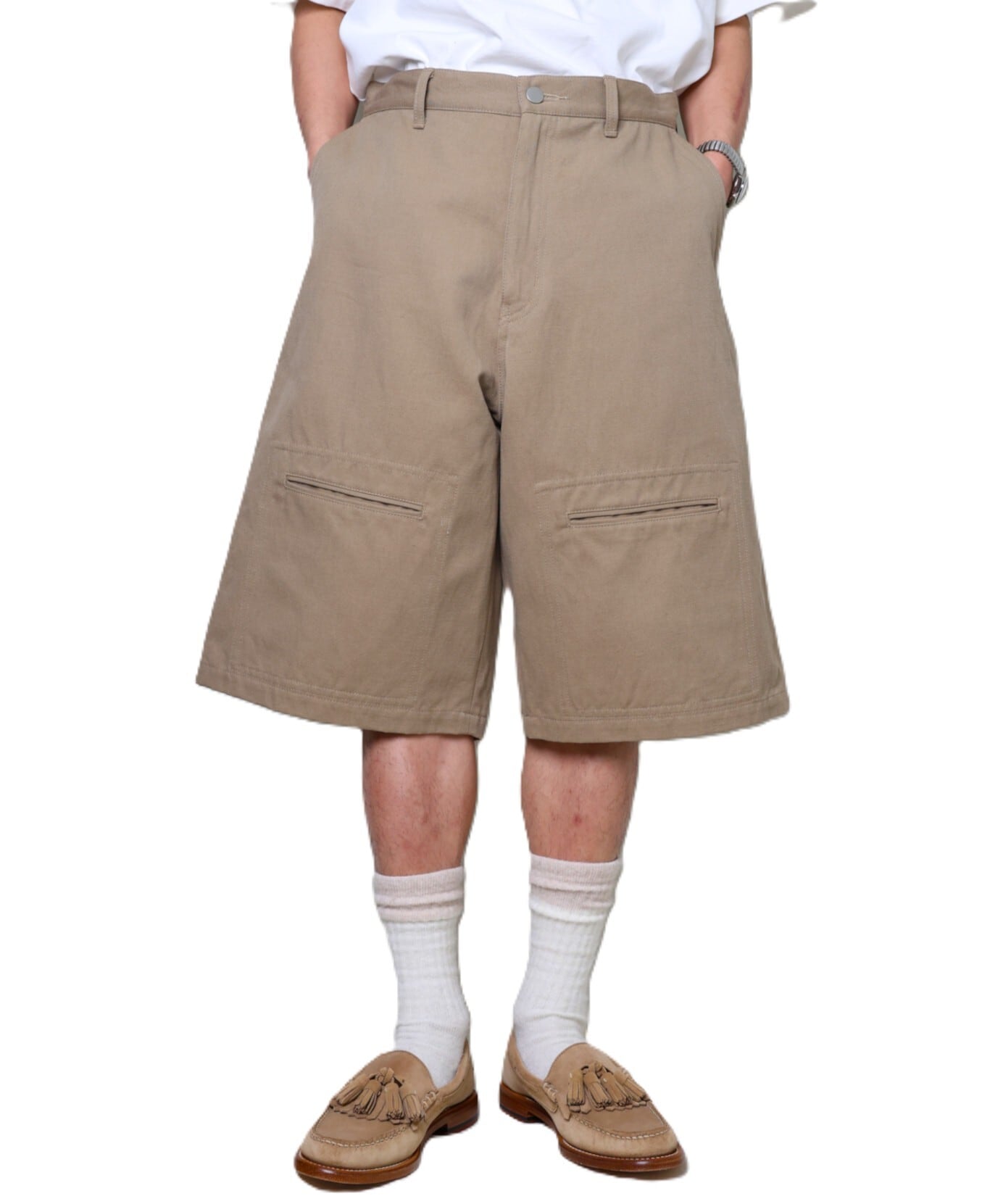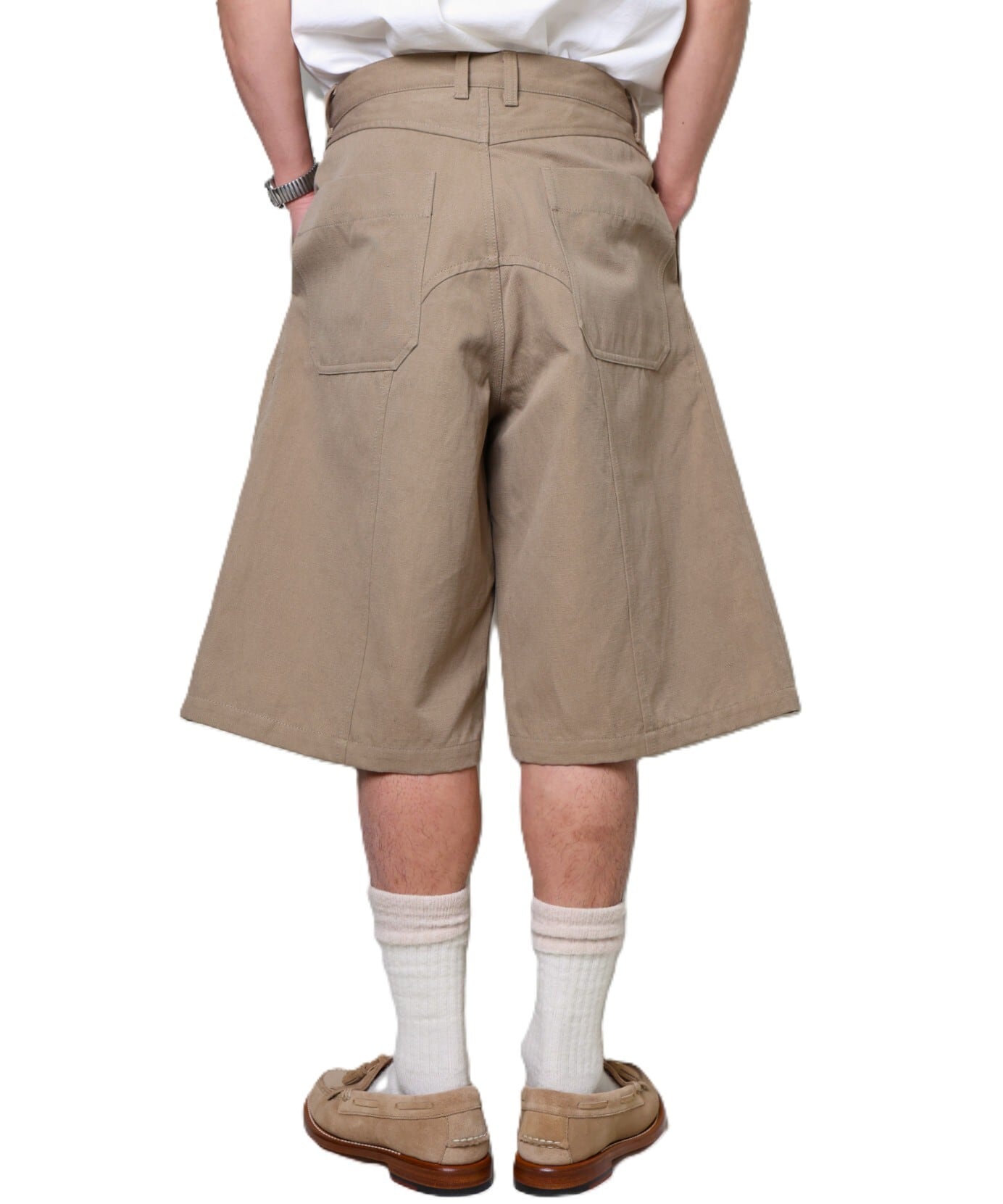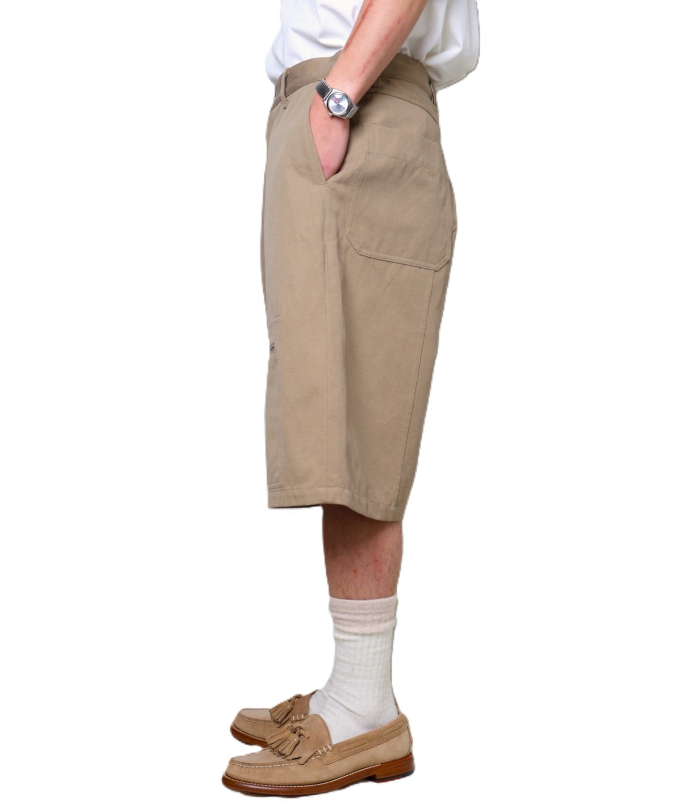 個人的には、白シャツにレザーサンダルで合わせたいな、と思えるショーツです。