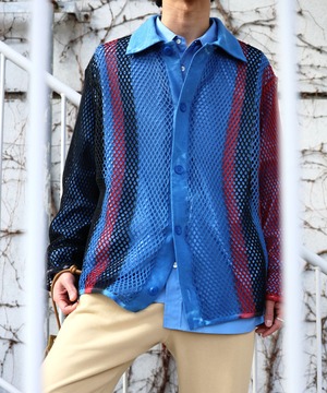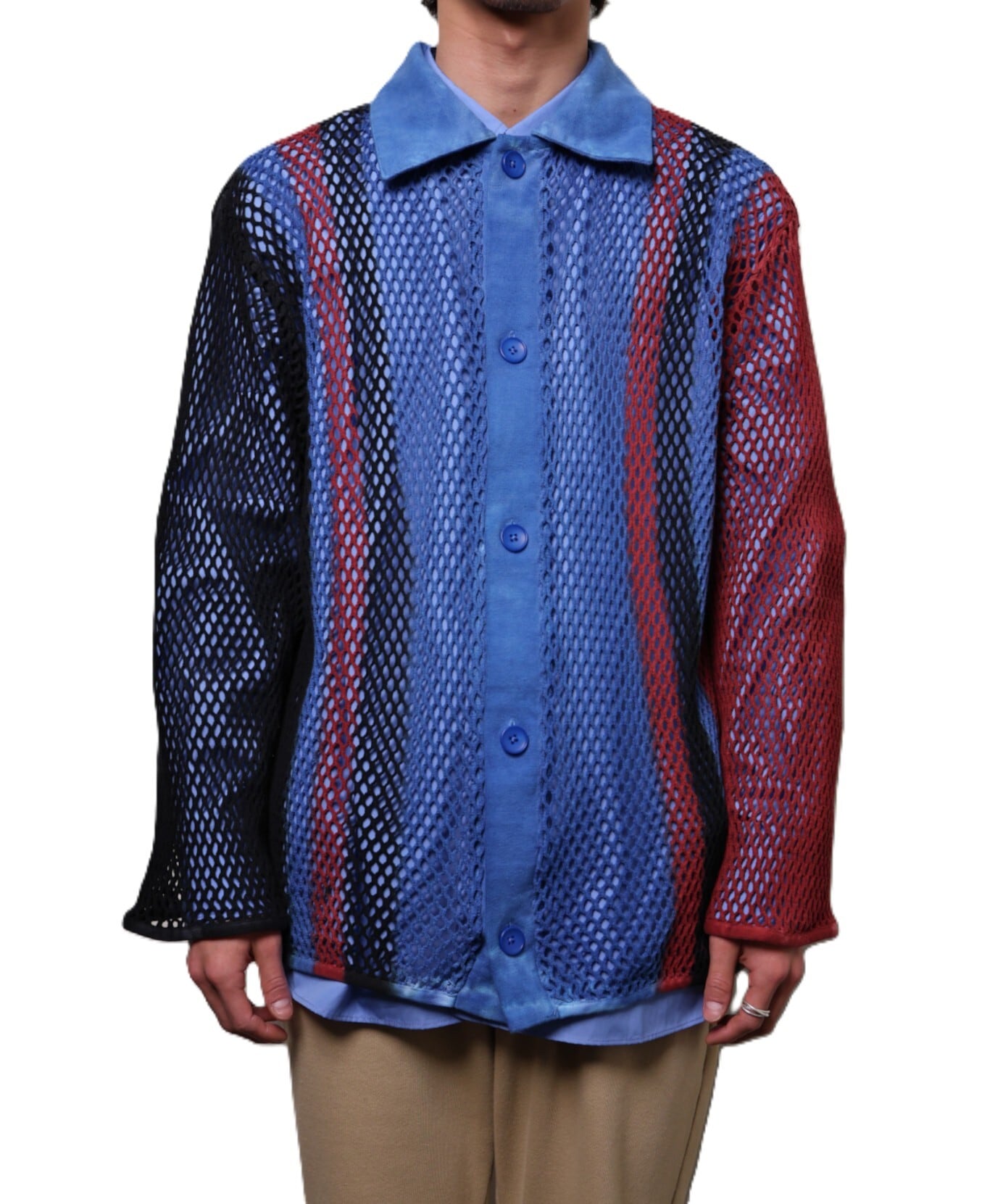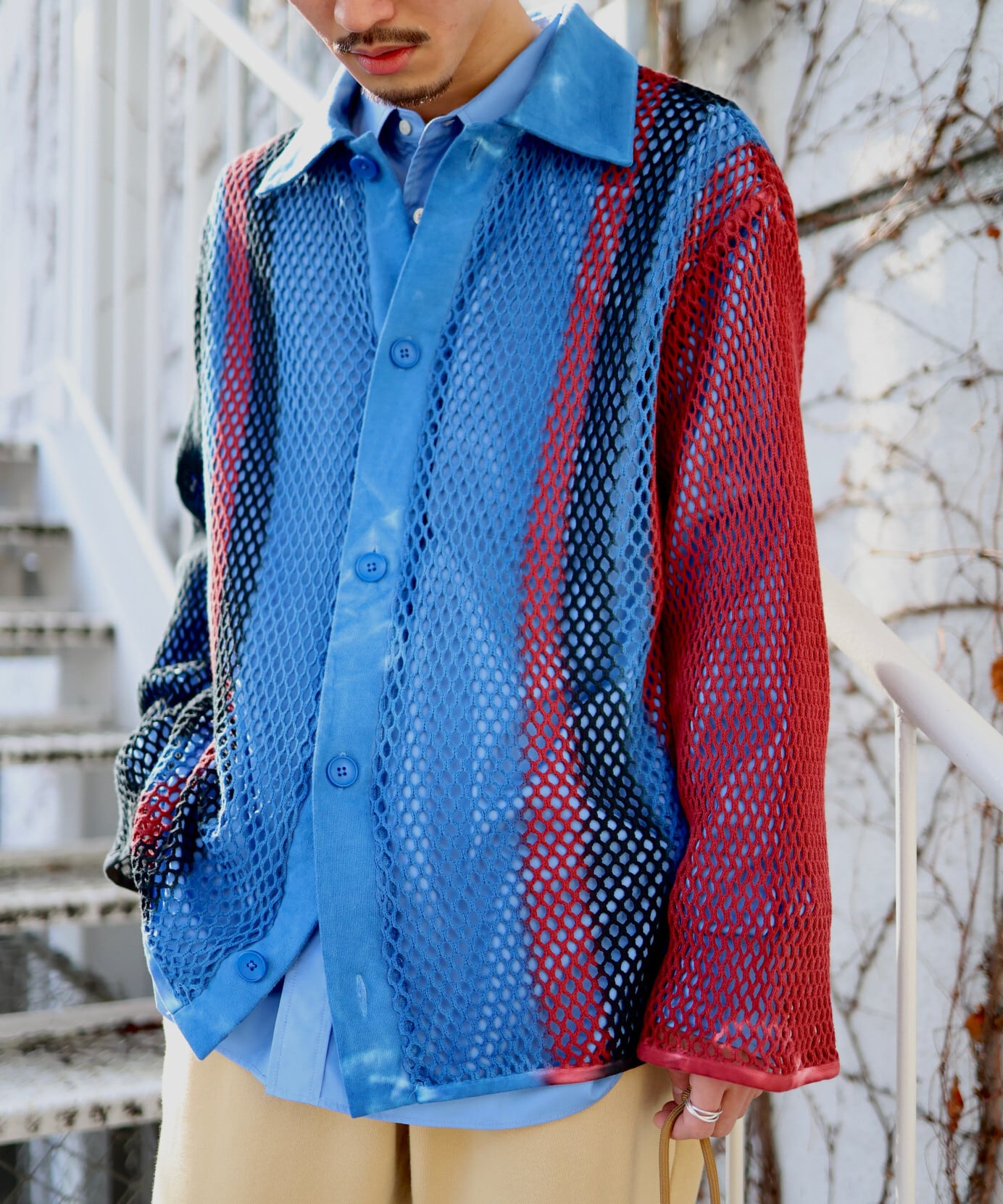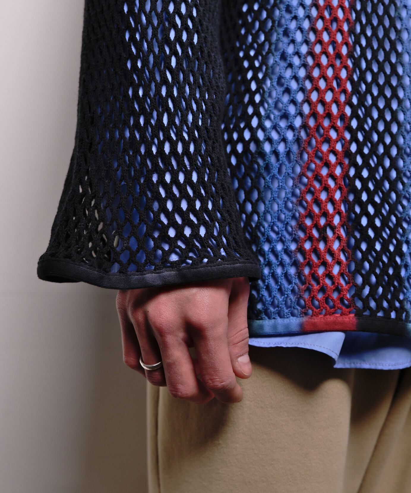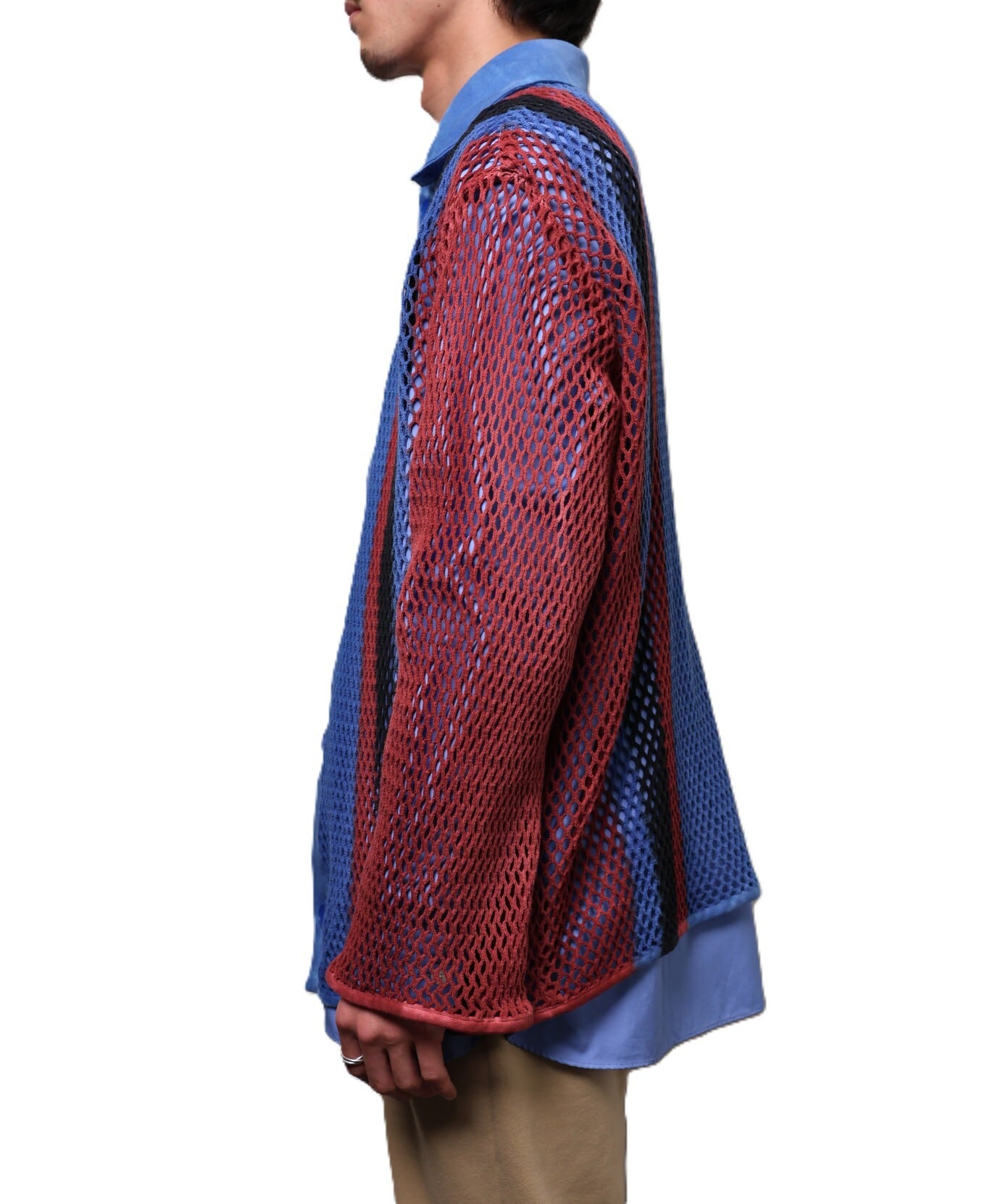 コットン素材の粗めの編み地で、インナーがほんのり透ける表情が特徴。伸縮性もあるためレイヤードしやすく、幅広いスタイリングに対応します。夏場はタンクトップや色のあるインナーと合わせることで透け感を楽しめ、網目から風が通るため見た目以上に快適に着用できます。