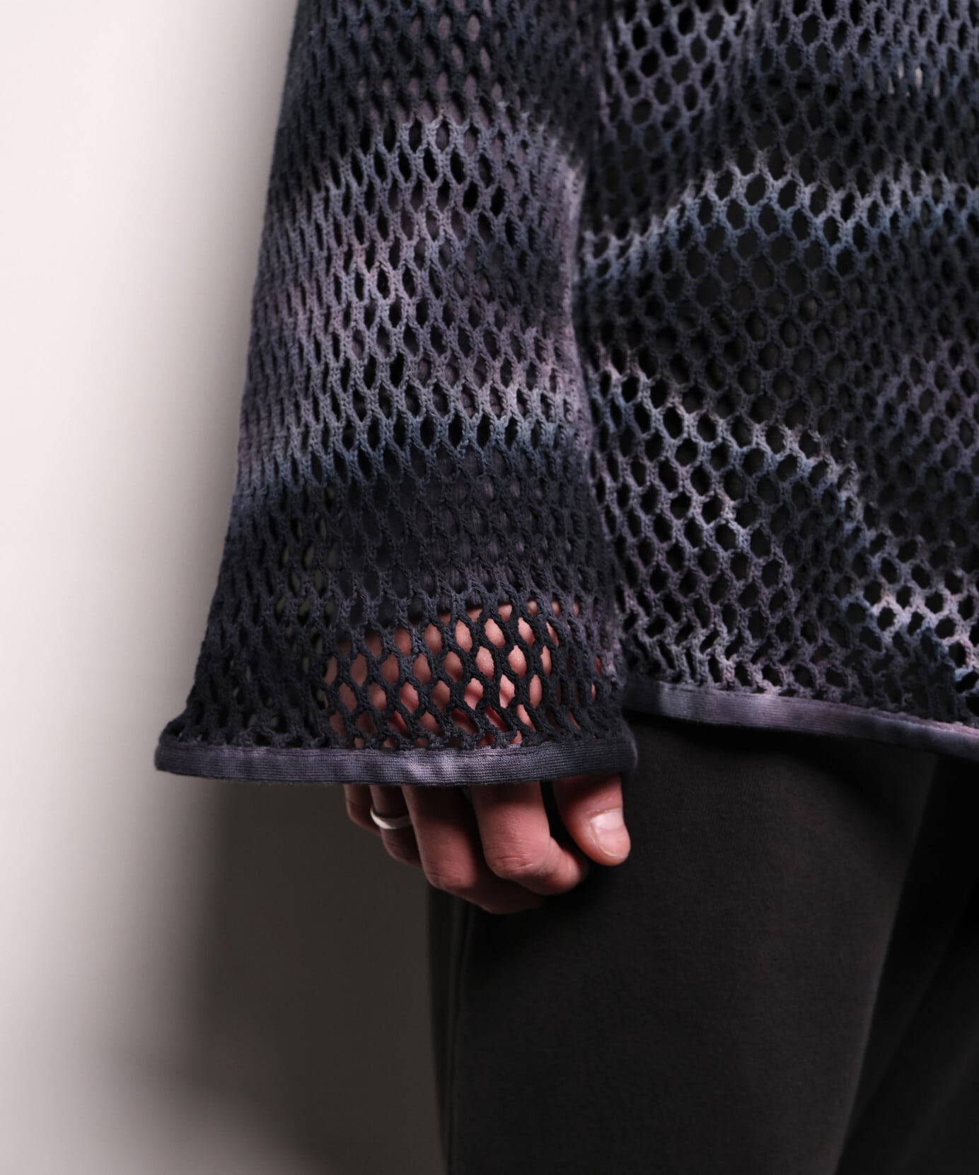 コットン素材の粗めの編み地で、インナーがほんのり透ける表情が特徴。伸縮性もあるためレイヤードしやすく、幅広いスタイリングに対応します。夏場はタンクトップや色のあるインナーと合わせることで透け感を楽しめ、網目から風が通るため見た目以上に快適に着用できます。