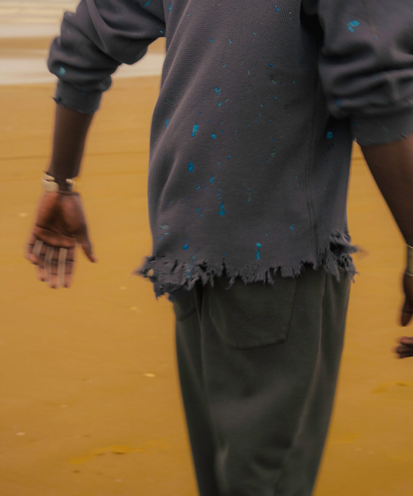 ウエストはスウェットパンツらしいややゆとりのあるフィットで、もも周りも太すぎず細すぎないバランス。膝下から裾にかけて自然に広がるシルエットが特徴です。